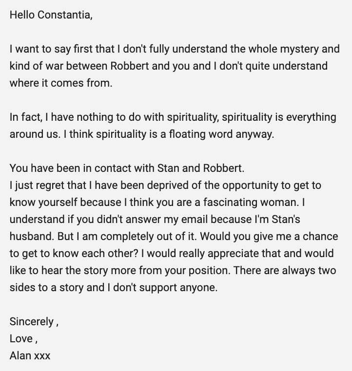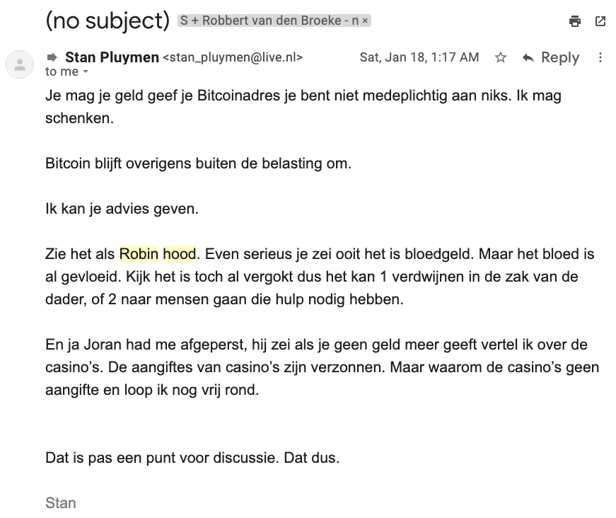 Stan Pluijmen is another matter. Stan never seemed hateful in the emails he signed with his own name. It’s a long story, and I don’t feel like repeating everything here. In short, I did not block Stan. I always hoped he would come around, detach himself from Robbert and would no longer participate in their shared lying and cheating games. But Stan has been bouncing like a yo-yo. Stan increasingly emailed me messages that he had changed and in which he admitted to (some) deception by and with Robbert van den Broeke. According to Stan, there is this part to Robbert that’s really “psychic” though. Anyway, Stan and Robbert are no longer a cheating duo together. At least, I see no signs that they still are. Stan even seemed burdened about the past, because he knows better than anyone how much hatred I received through Robbert and through his own, questionable to say the least, network. He even started offering me financial “compensation” in BTC, but I only wanted official compensation, through a notary. For literally years he kept on pushing me to take his money, through email, this started with him offering me money if I deleted the blogs on Parameter, see previous blogs on my Parameter WordPress.4