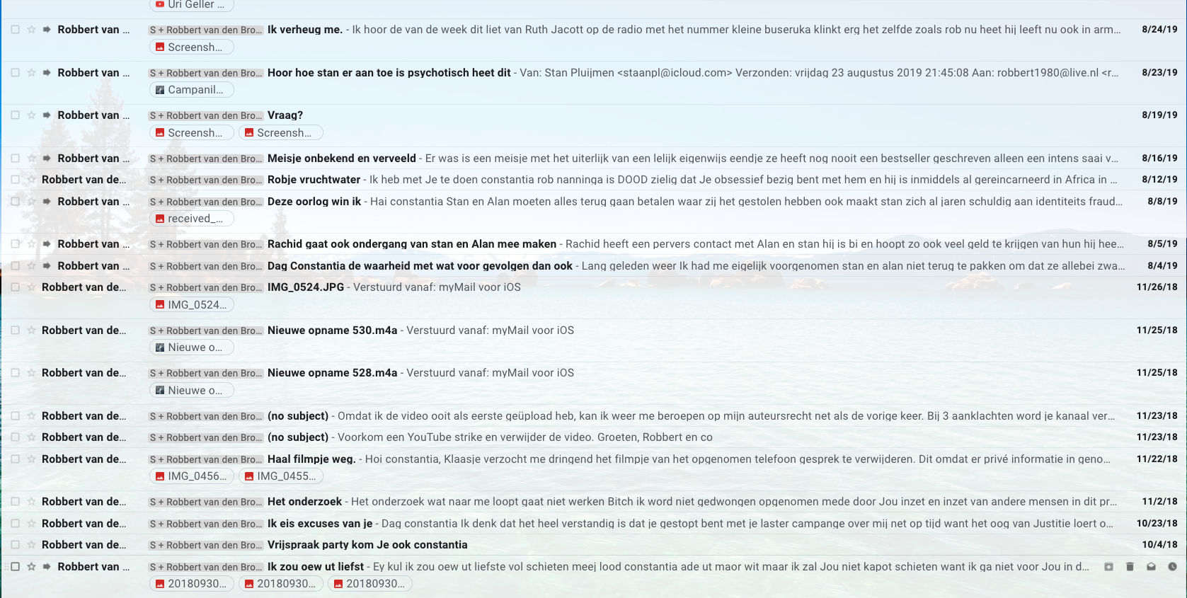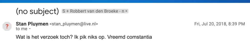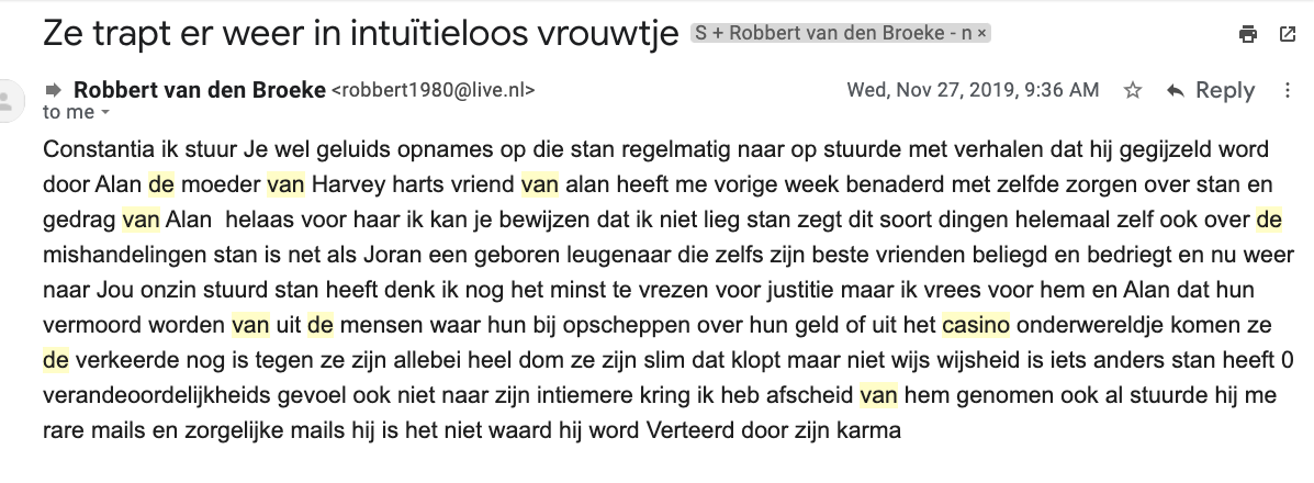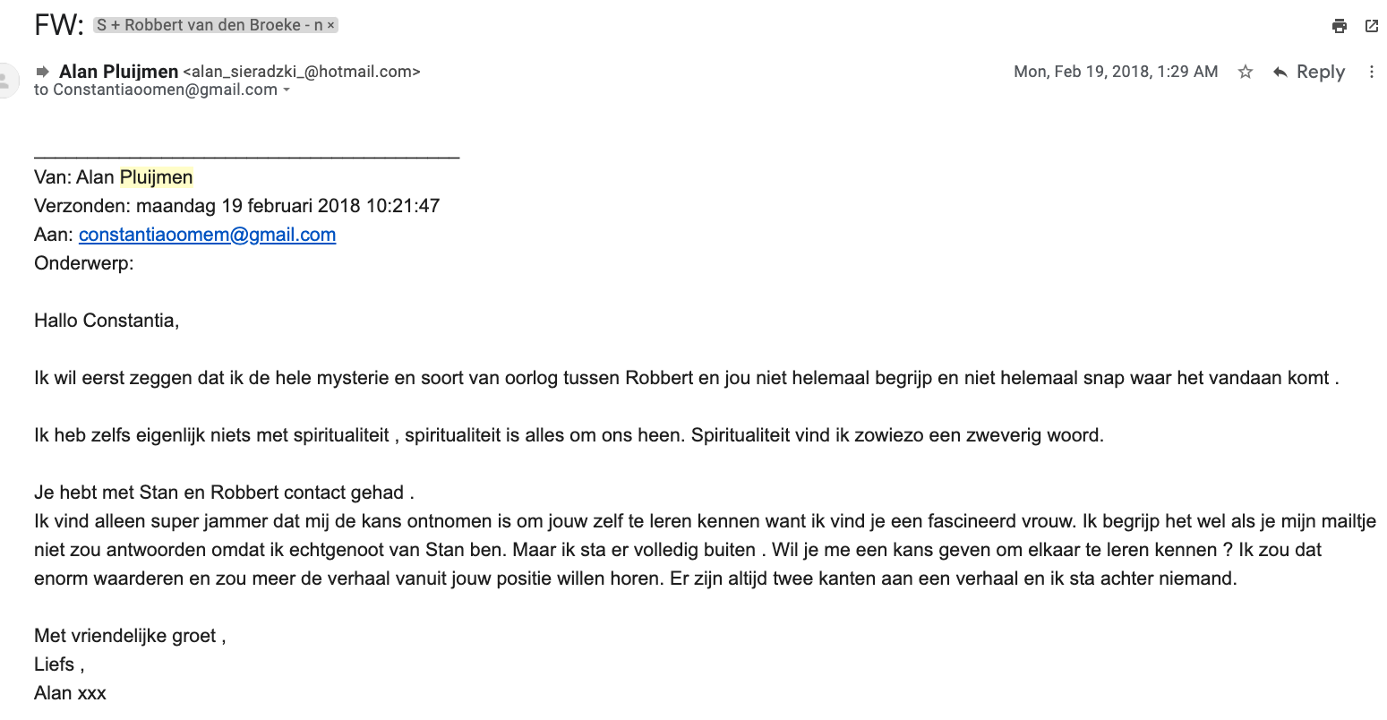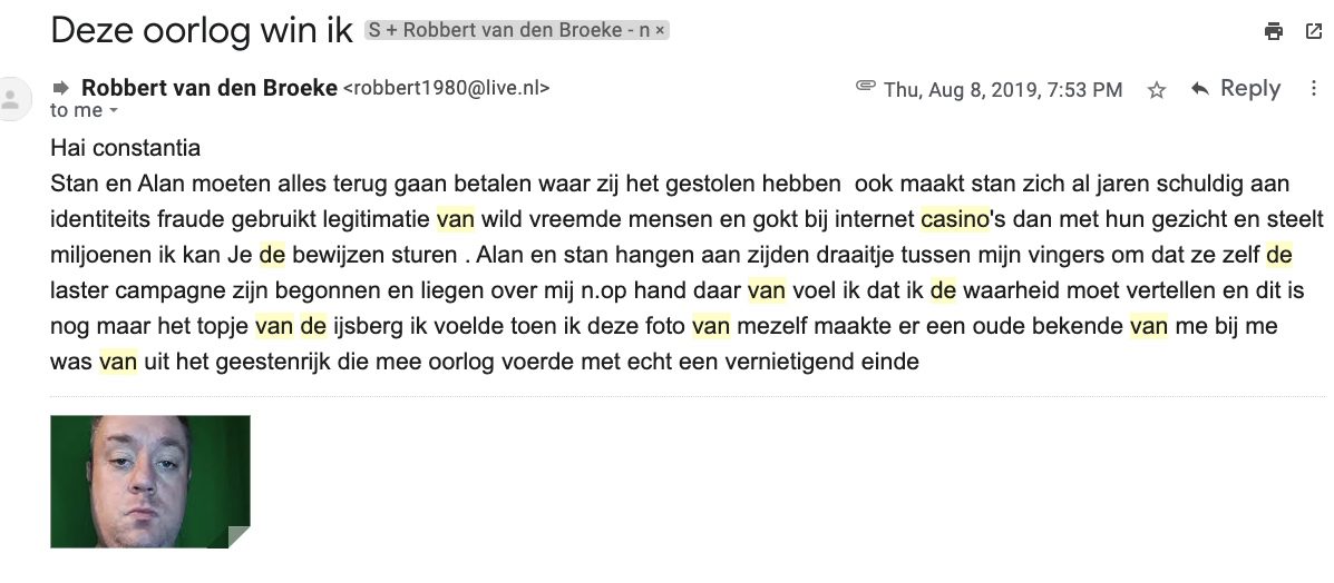 Because I was receiving hatemails of Robbert van den Broeke about Stan and Alan simultaneously in which Robbert was kicking furiously at Stan and Alan, even sending me an audio from Stan in which Stan could be heard crying and completely beside himself, I could tell something was going on. In his audios, Stan’s tune changed and; in the most favorable way interpreted for Stan, you can say that he indeed seemed awakened from a bad dream or spell, he used phrases like: “I embarrassed myself, I let go of Robbert, what have I done? Robbert brought me to things, I am no longer under Robbert’s trance, your blogs may stay online because they are correct, the curse of Robbert…, there is no hacker, I’m sorry, I admit to my mistakes … “. Of course in this case, it’s hard to tell truth from lie, but Stan’s Spring 2019 and beyond audios were indicators that the firm trinity Robbert-Stan-Alan (Stan’s husband) had dissolved. Both Van den Broeke and Stan Pluijmen were suddenly emailing me the(ir) “whole truth”: (click on gallery images, this is how I received it) googletranslationrvdbthetruth