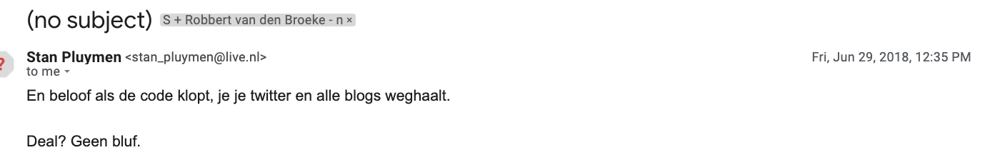The first one is that I finally have blocked Robbert van den Broeke from sending emails to me. His official acquittal in the threat case for which he was arrested, allegedly for lack of evidence, in October 20181 was no reason for Van den Broeke to choose a scold and threat-free path, and he just continued with his hate emails.