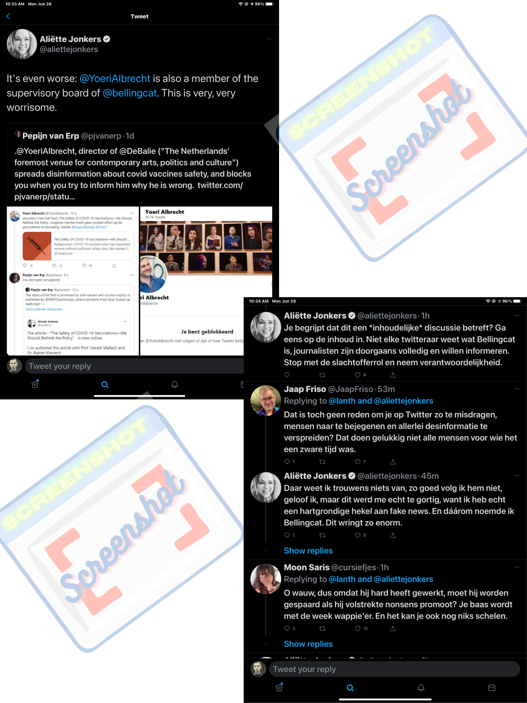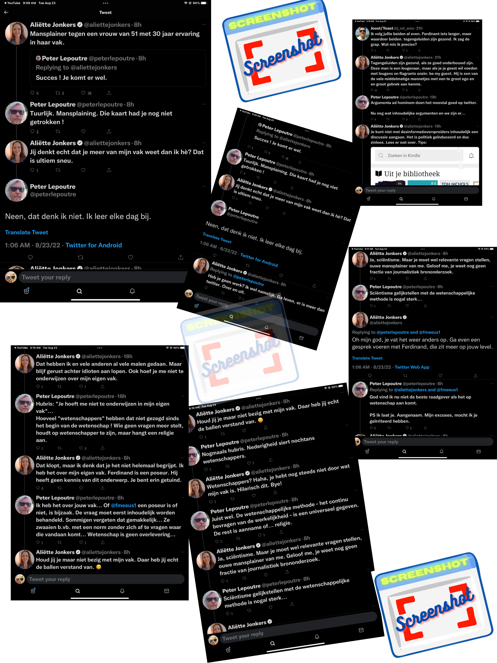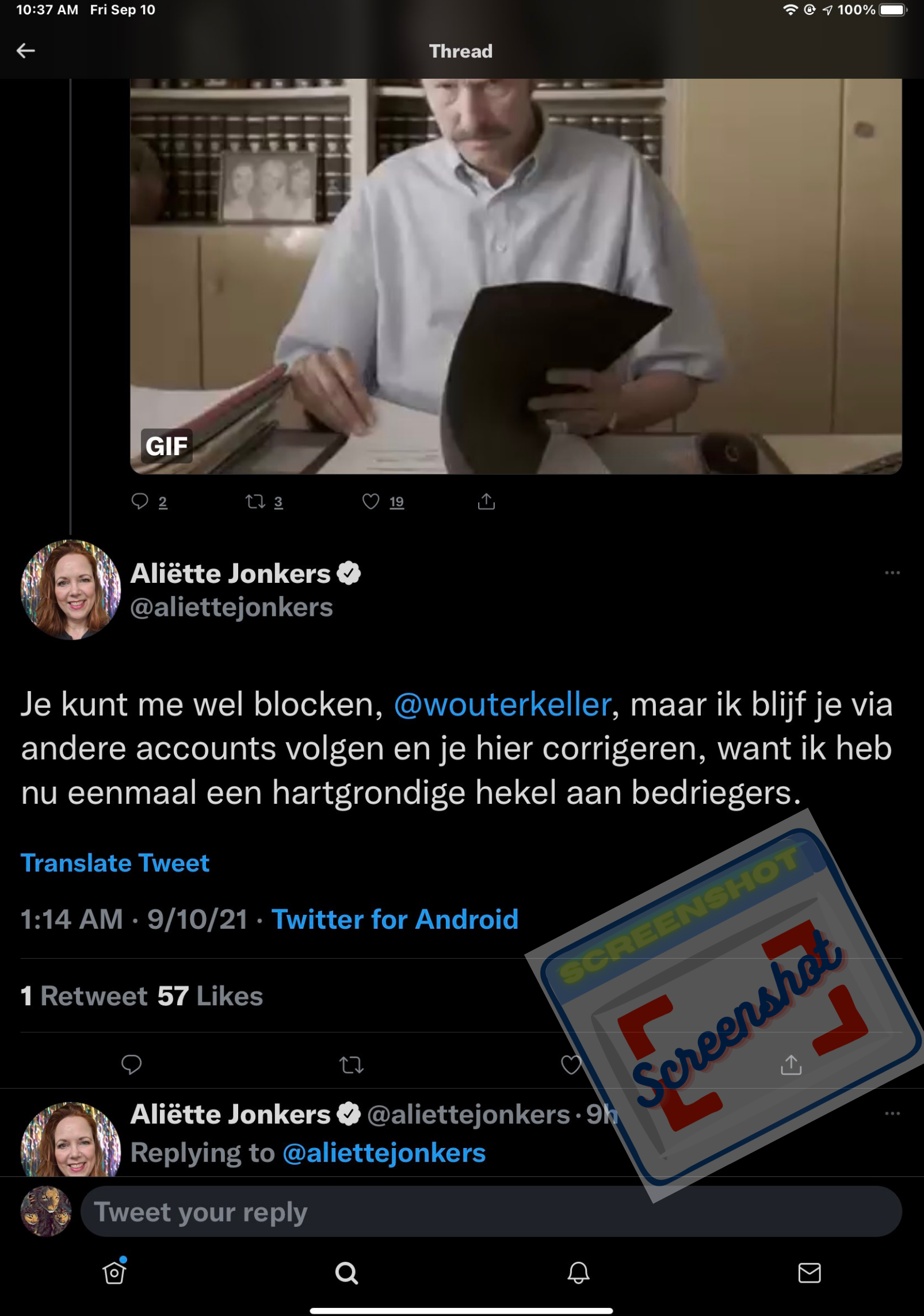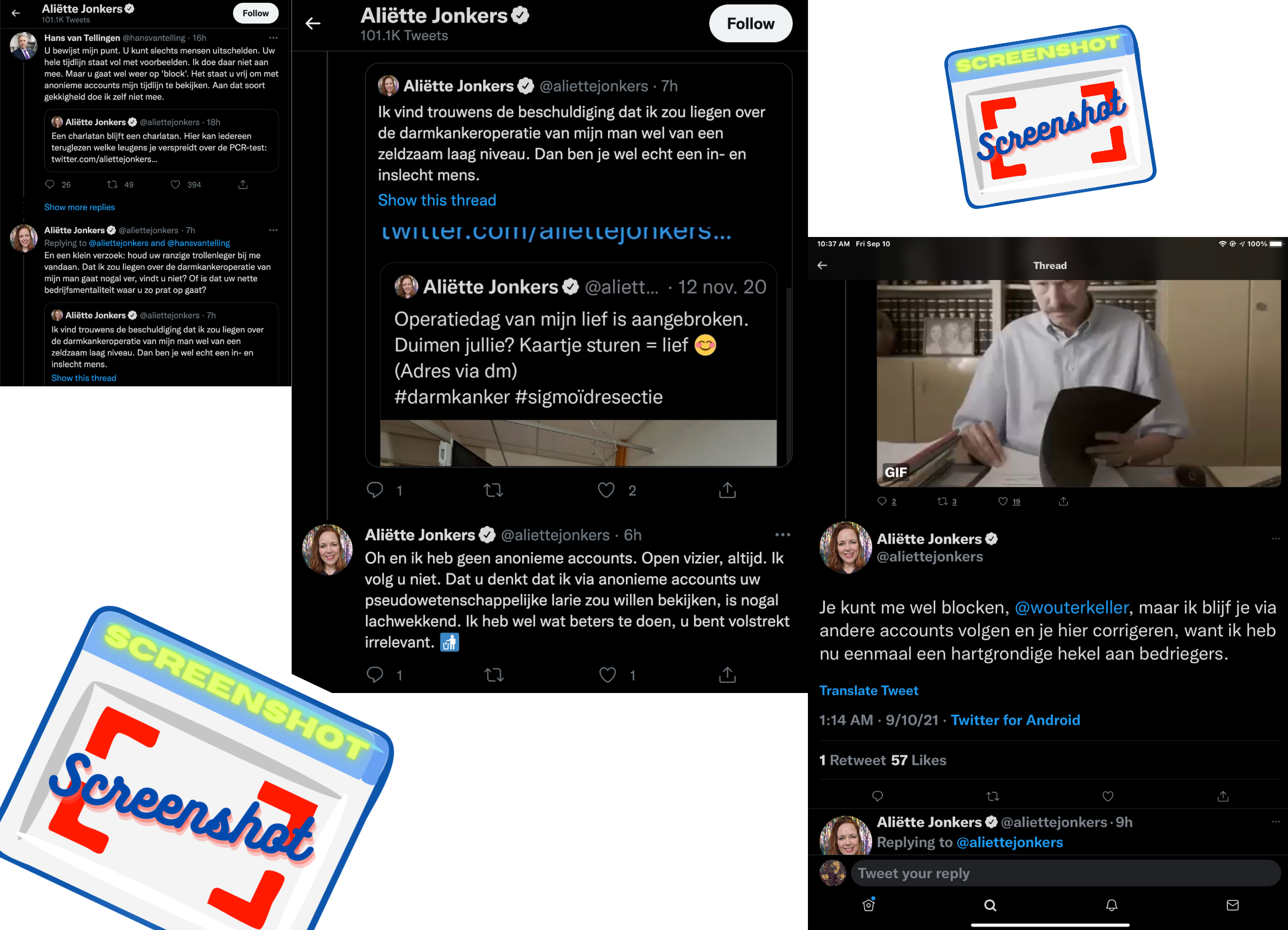 Zijn inmiddels collega-Skepsis bestuurslid, sinds ongeveer lente 2021, medisch journaliste Aliette Jonkers blokte me reeds in vroeg 2020 nadat ik na haar optreden over het Corona Virus in Koffietijd had opgemerkt dat ik de “dokterlook” van haar profielfoto leuker vond dan haar “glamourlook”, wat ze ten onrechte als een belediging opvatte. Wat ik ook verzoenend zei, maar toen was het al te laat. Het was gewoon zomaar een opmerking, maar niet ad hominem bedoeld, ik kende haar slechts van die profielfoto waarop ze een witte blouse draagt wat bij mij een positief “doktergevoel” creëerde. Toen ik even later wel inhoudelijk reageerde en onderbouwde, over griepcijfers in de VS die zij mijns inziens in haar optreden in Koffietijd verkeerd geïnterpreteerd had, hoorde ik nooit meer wat en bleef ik voor eeuwig door haar geblokt (mijn accountnaam was toen nog Robbert van den Broeke gerelateerd @genverbrander10).