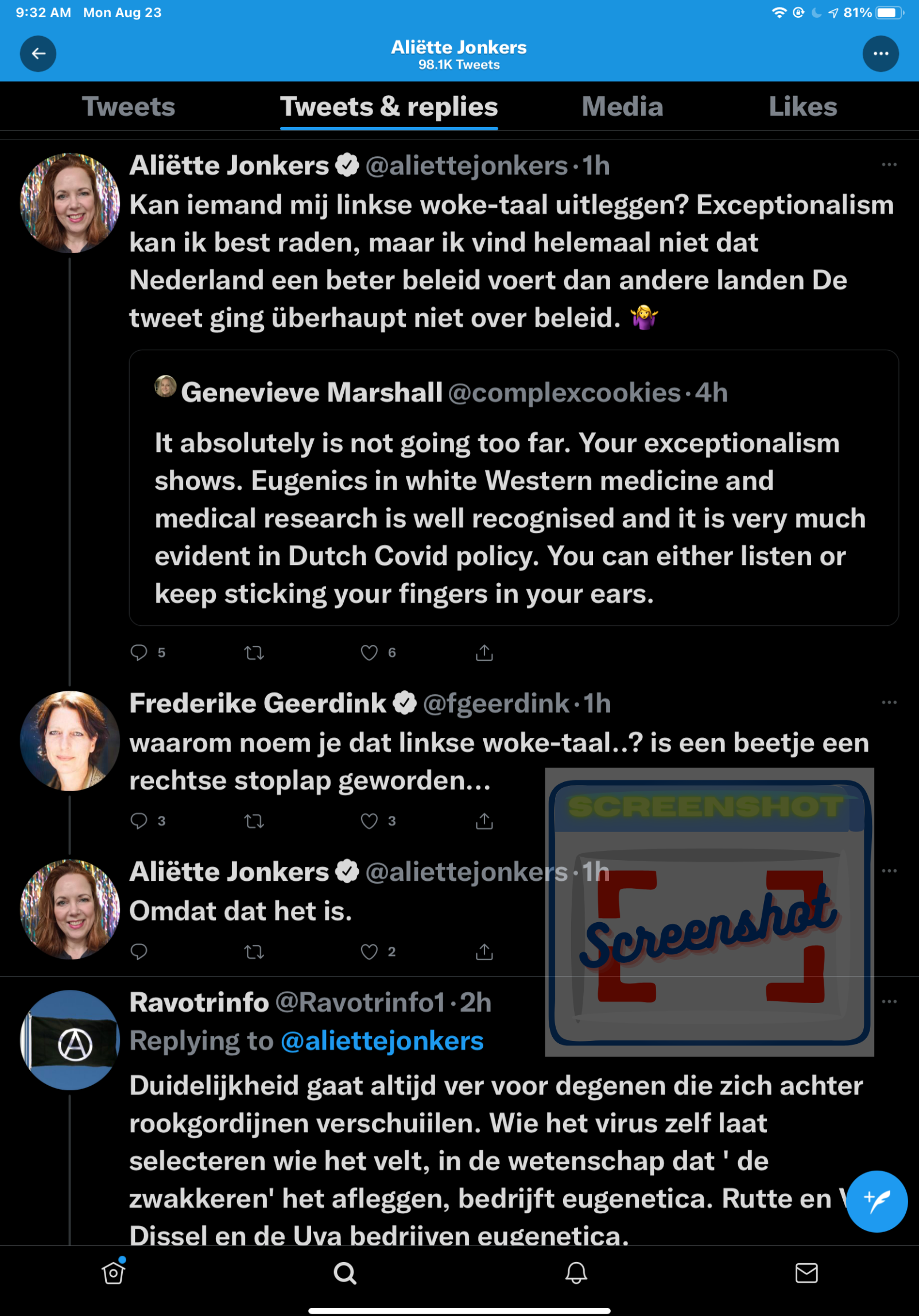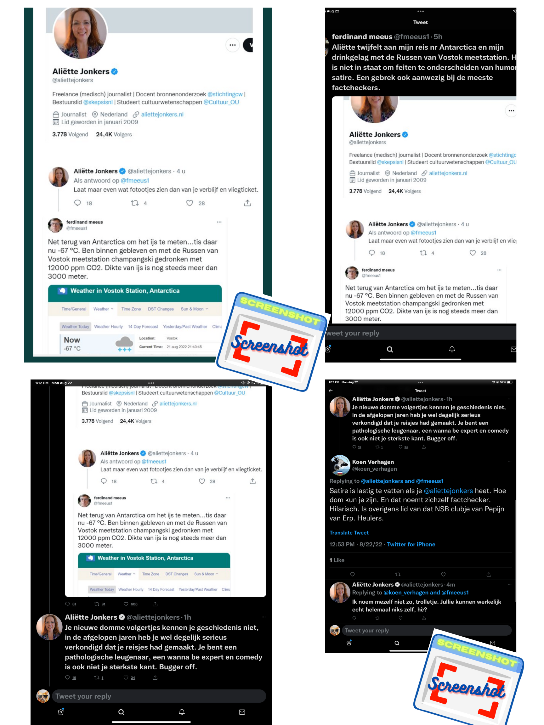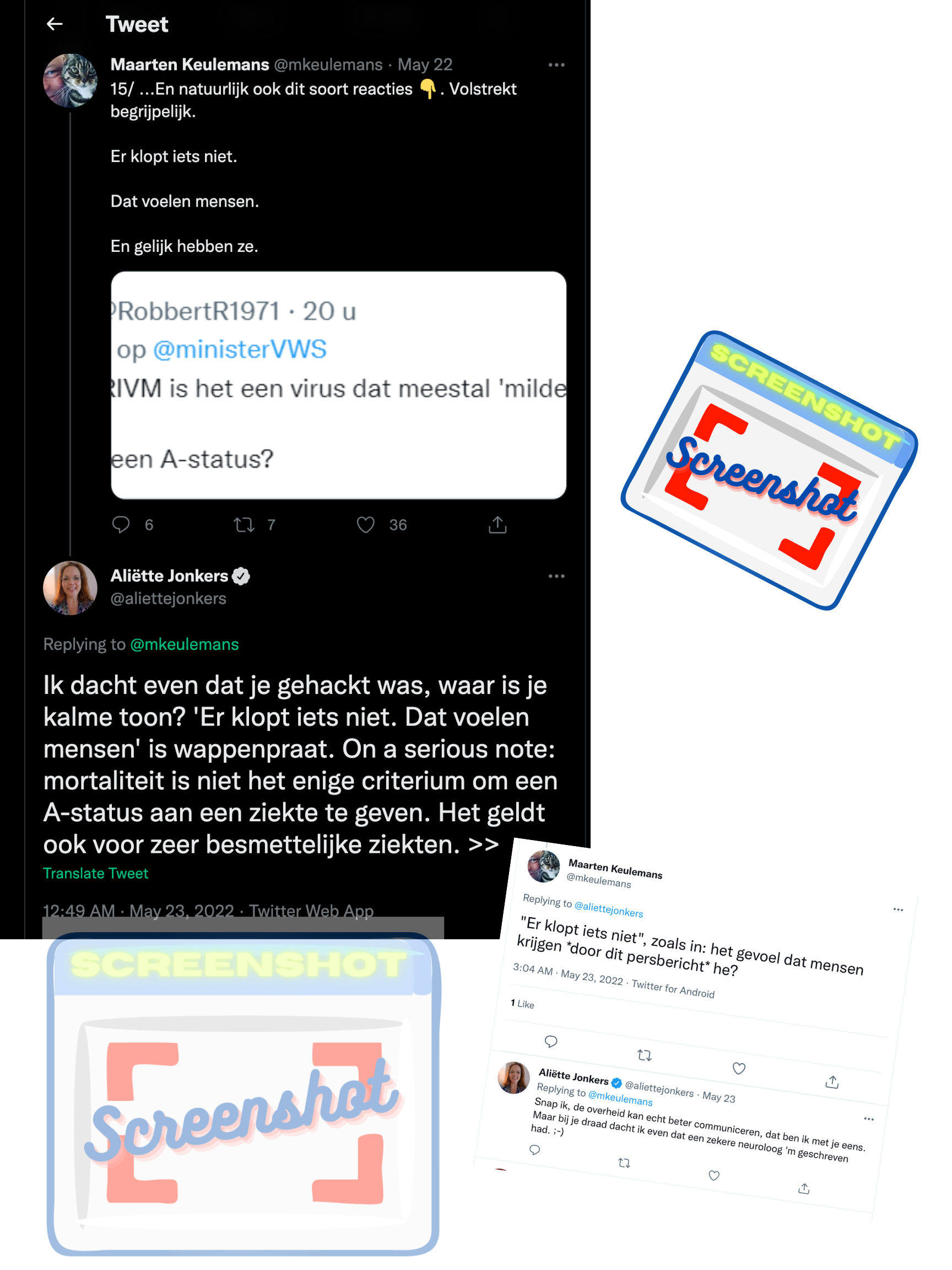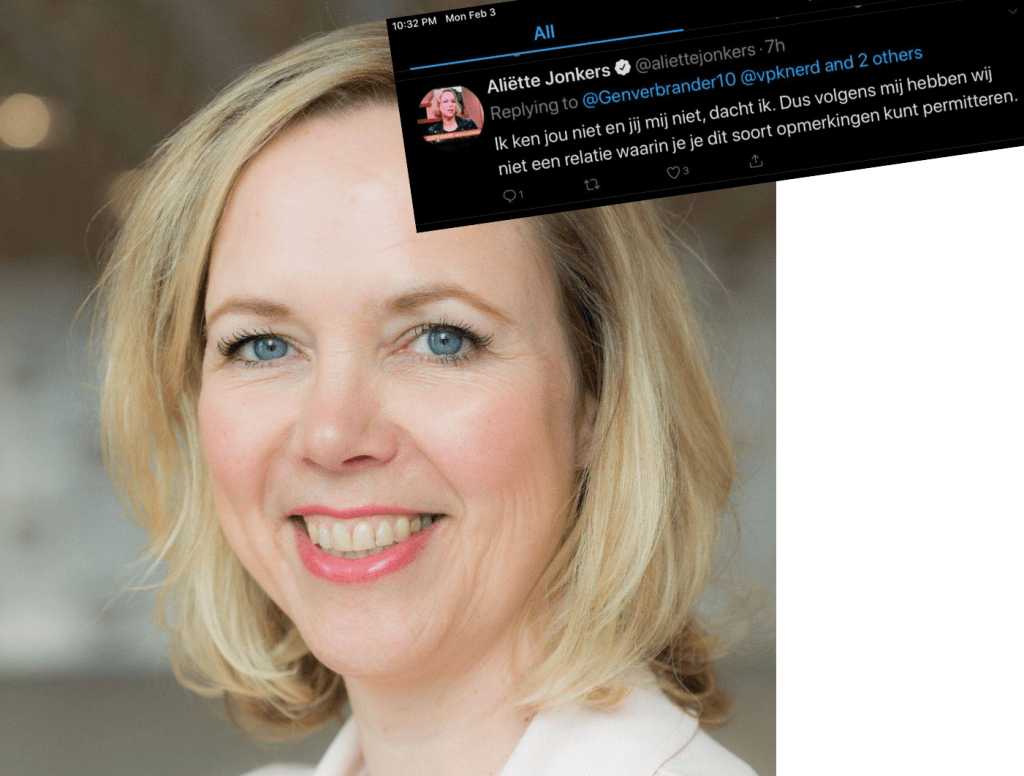 Zijn inmiddels collega-Skepsis bestuurslid, sinds ongeveer lente 2021, medisch journaliste Aliette Jonkers blokte me reeds in vroeg 2020 nadat ik na haar optreden over het Corona Virus in Koffietijd had opgemerkt dat ik de “dokterlook” van haar profielfoto leuker vond dan haar “glamourlook”, wat ze ten onrechte als een belediging opvatte. Wat ik ook verzoenend zei, maar toen was het al te laat. Het was gewoon zomaar een opmerking, maar niet ad hominem bedoeld, ik kende haar slechts van die profielfoto waarop ze een witte blouse draagt wat bij mij een positief “doktergevoel” creëerde. Toen ik even later wel inhoudelijk reageerde en onderbouwde, over griepcijfers in de VS die zij mijns inziens in haar optreden in Koffietijd verkeerd geïnterpreteerd had, hoorde ik nooit meer wat en bleef ik voor eeuwig door haar geblokt (mijn accountnaam was toen nog Robbert van den Broeke gerelateerd @genverbrander10).