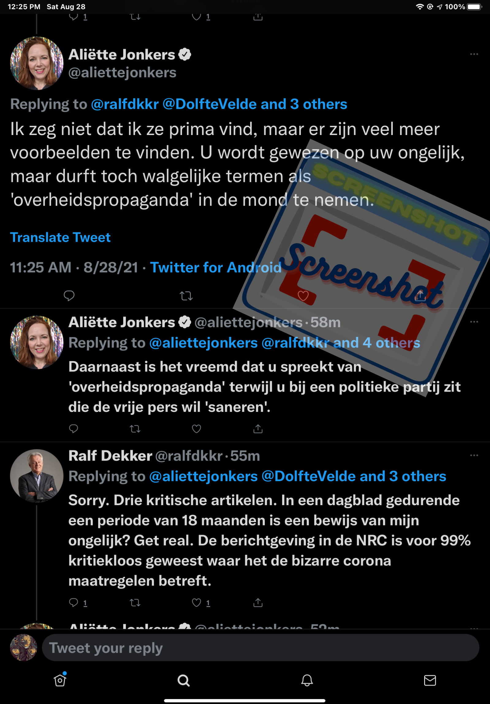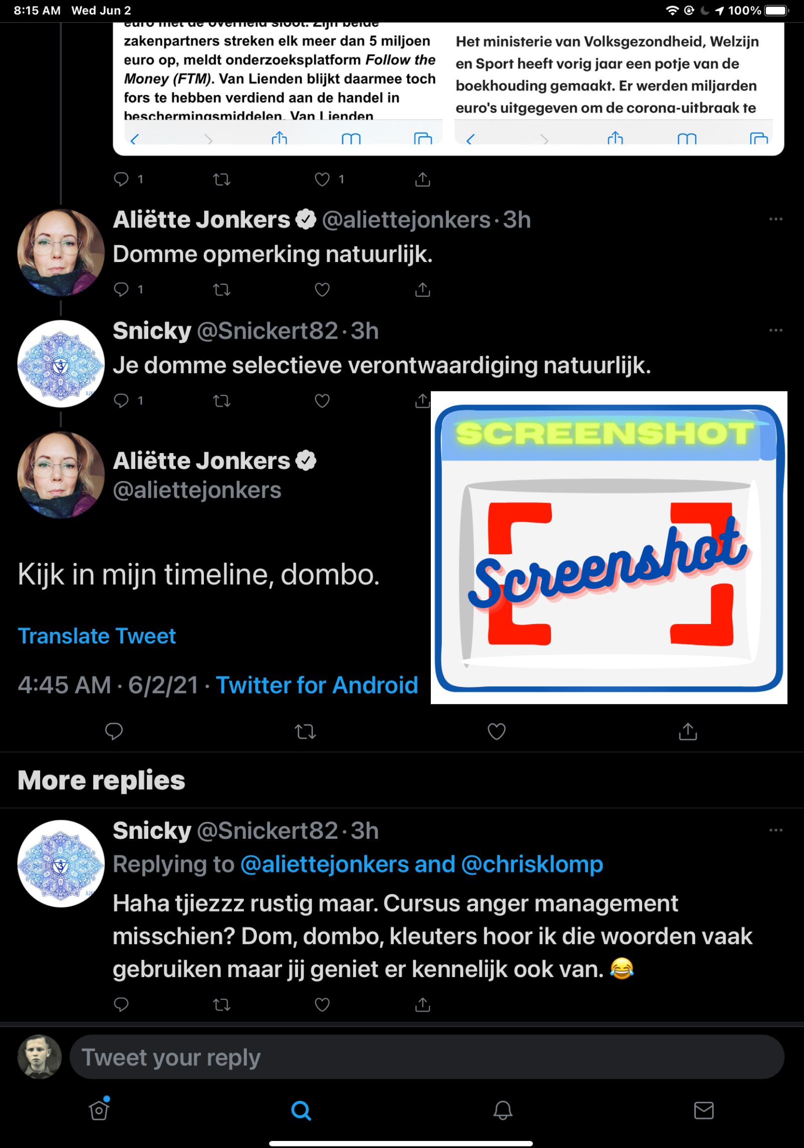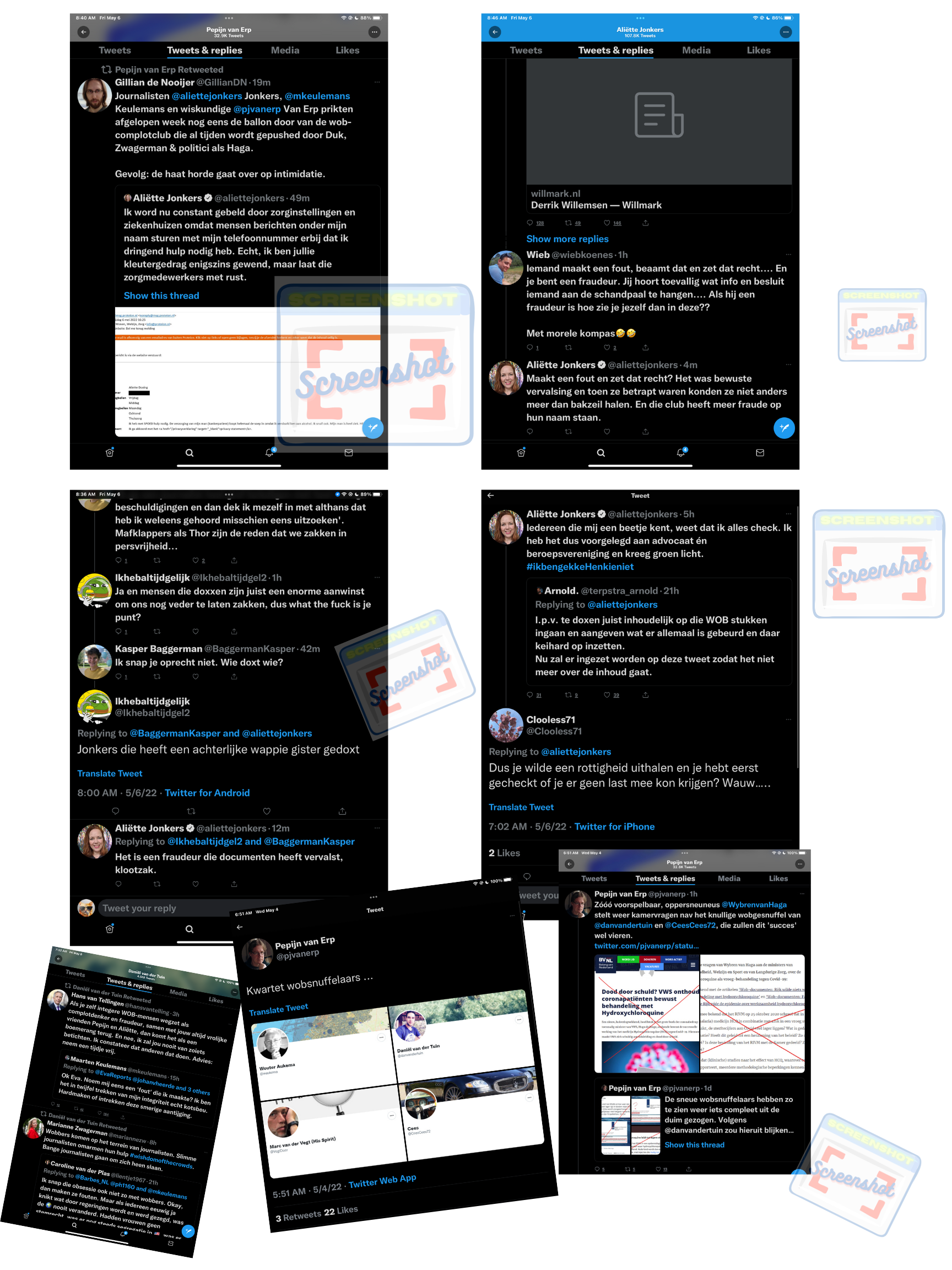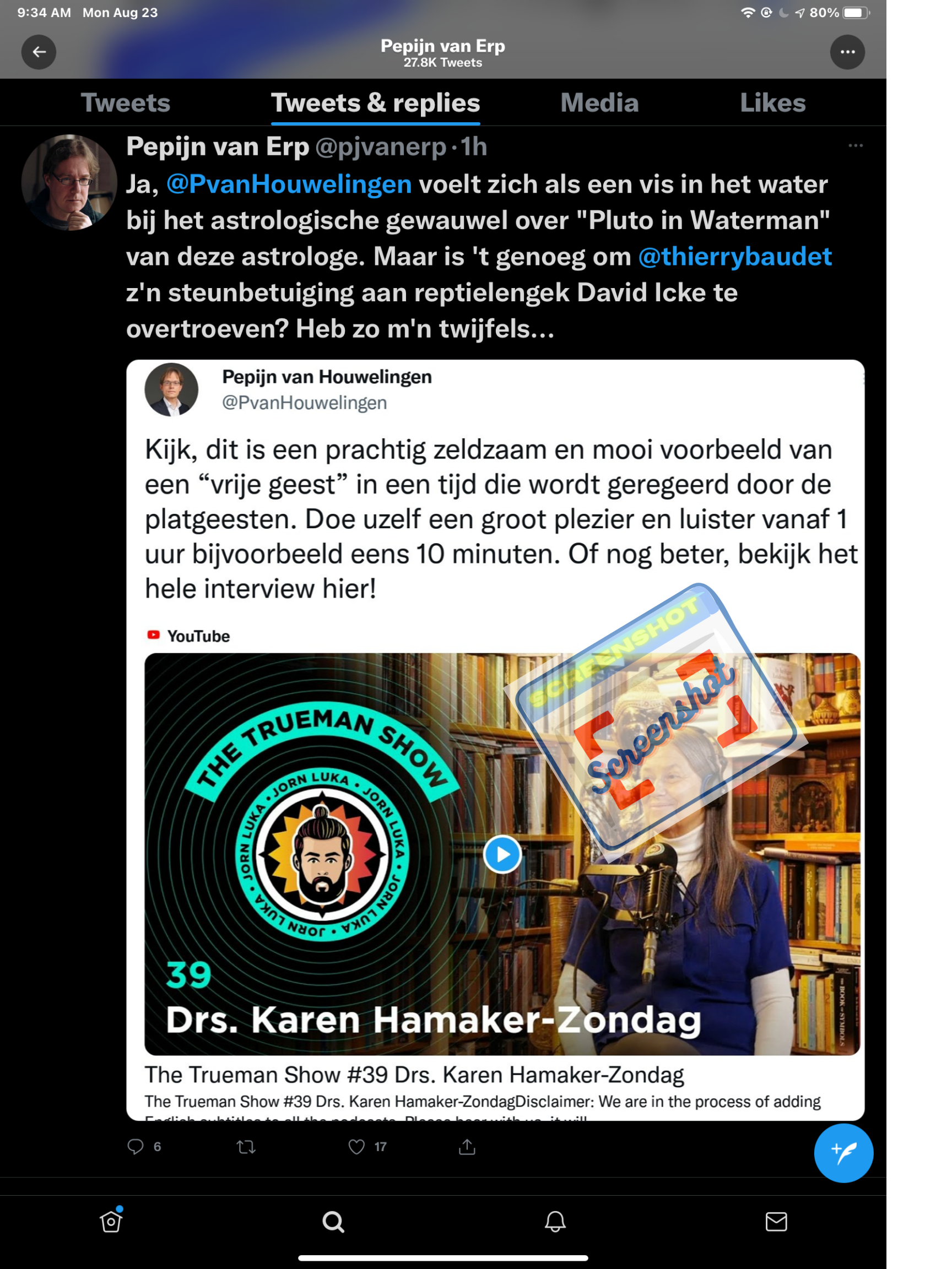 Zijn inmiddels collega-Skepsis bestuurslid, sinds ongeveer lente 2021, medisch journaliste Aliette Jonkers blokte me reeds in vroeg 2020 nadat ik na haar optreden over het Corona Virus in Koffietijd had opgemerkt dat ik de “dokterlook” van haar profielfoto leuker vond dan haar “glamourlook”, wat ze ten onrechte als een belediging opvatte. Wat ik ook verzoenend zei, maar toen was het al te laat. Het was gewoon zomaar een opmerking, maar niet ad hominem bedoeld, ik kende haar slechts van die profielfoto waarop ze een witte blouse draagt wat bij mij een positief “doktergevoel” creëerde. Toen ik even later wel inhoudelijk reageerde en onderbouwde, over griepcijfers in de VS die zij mijns inziens in haar optreden in Koffietijd verkeerd geïnterpreteerd had, hoorde ik nooit meer wat en bleef ik voor eeuwig door haar geblokt (mijn accountnaam was toen nog Robbert van den Broeke gerelateerd @genverbrander10).