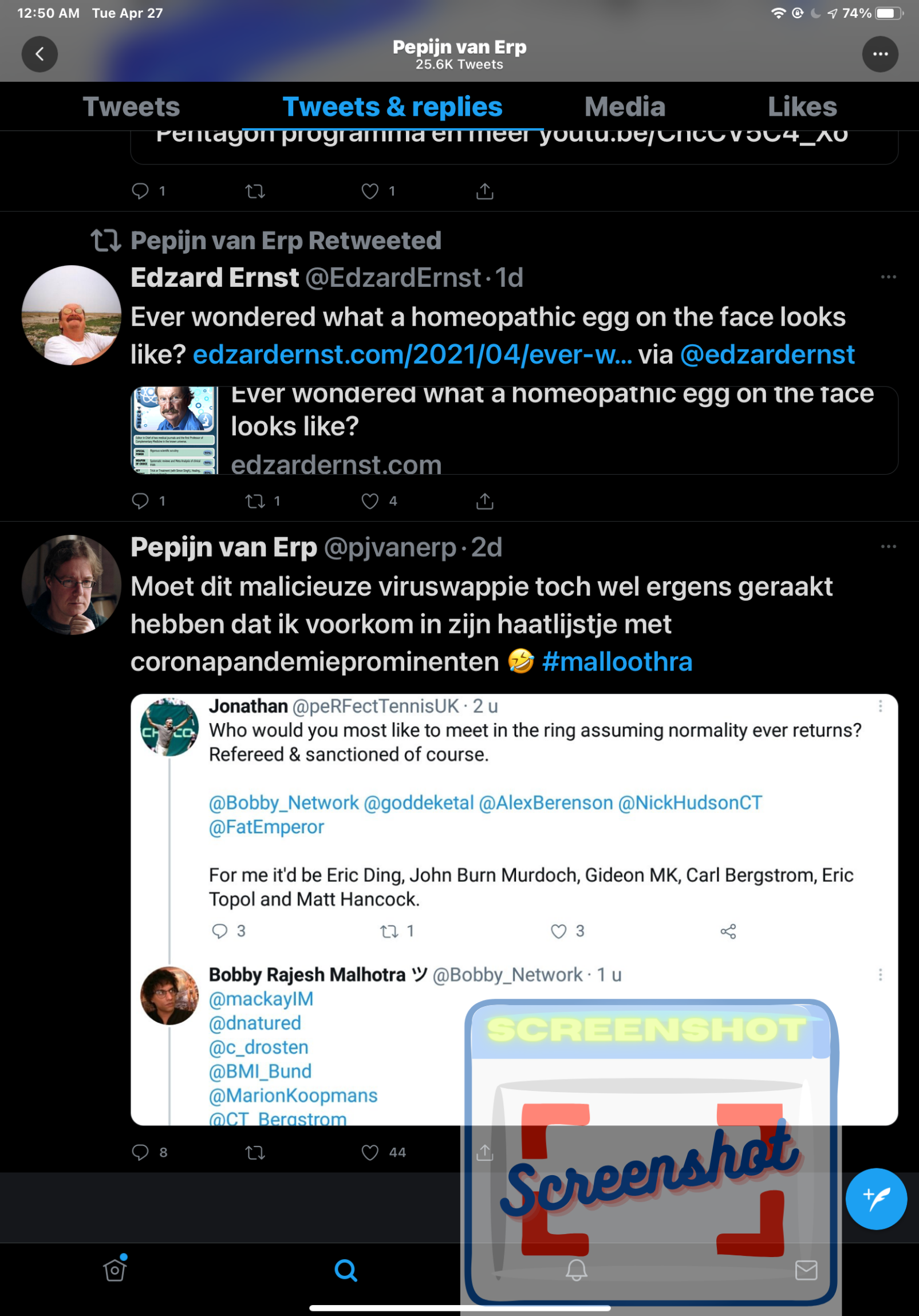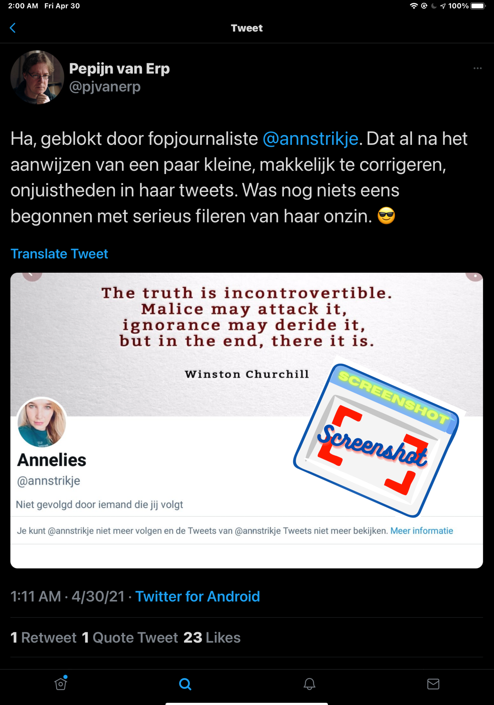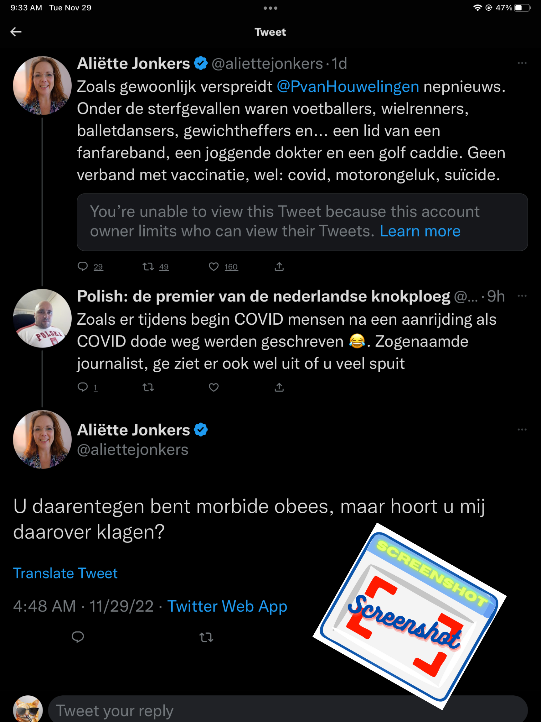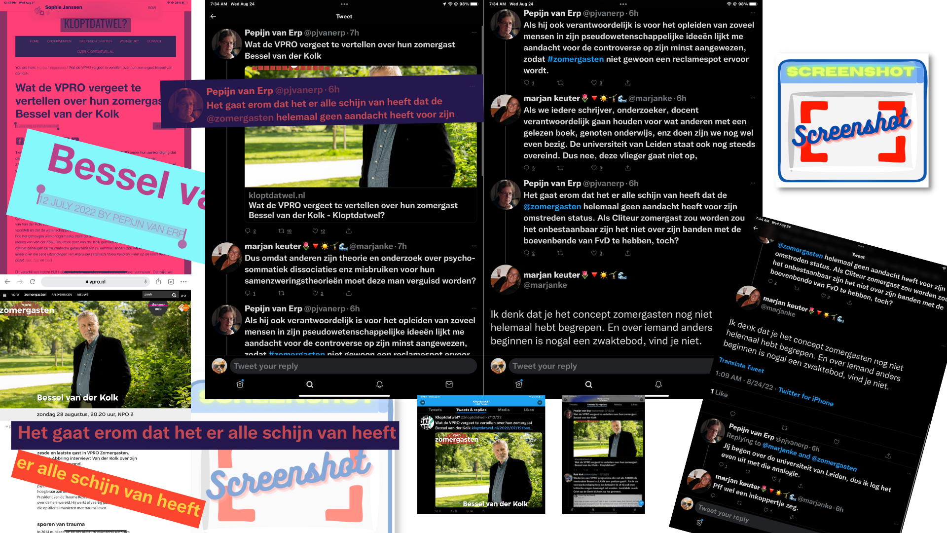 Zijn inmiddels collega-Skepsis bestuurslid, sinds ongeveer lente 2021, medisch journaliste Aliette Jonkers blokte me reeds in vroeg 2020 nadat ik na haar optreden over het Corona Virus in Koffietijd had opgemerkt dat ik de “dokterlook” van haar profielfoto leuker vond dan haar “glamourlook”, wat ze ten onrechte als een belediging opvatte. Wat ik ook verzoenend zei, maar toen was het al te laat. Het was gewoon zomaar een opmerking, maar niet ad hominem bedoeld, ik kende haar slechts van die profielfoto waarop ze een witte blouse draagt wat bij mij een positief “doktergevoel” creëerde. Toen ik even later wel inhoudelijk reageerde en onderbouwde, over griepcijfers in de VS die zij mijns inziens in haar optreden in Koffietijd verkeerd geïnterpreteerd had, hoorde ik nooit meer wat en bleef ik voor eeuwig door haar geblokt (mijn accountnaam was toen nog Robbert van den Broeke gerelateerd @genverbrander10).