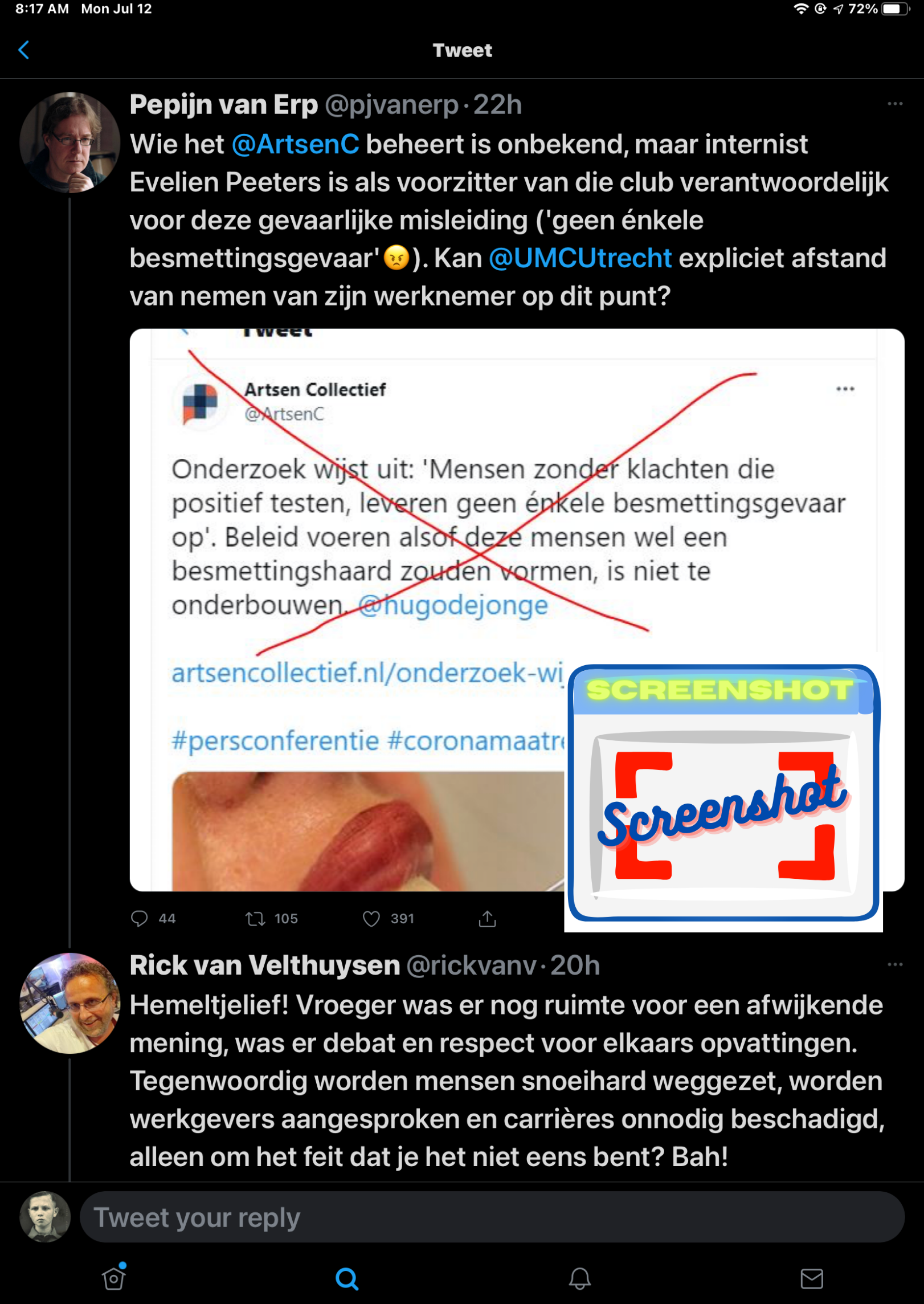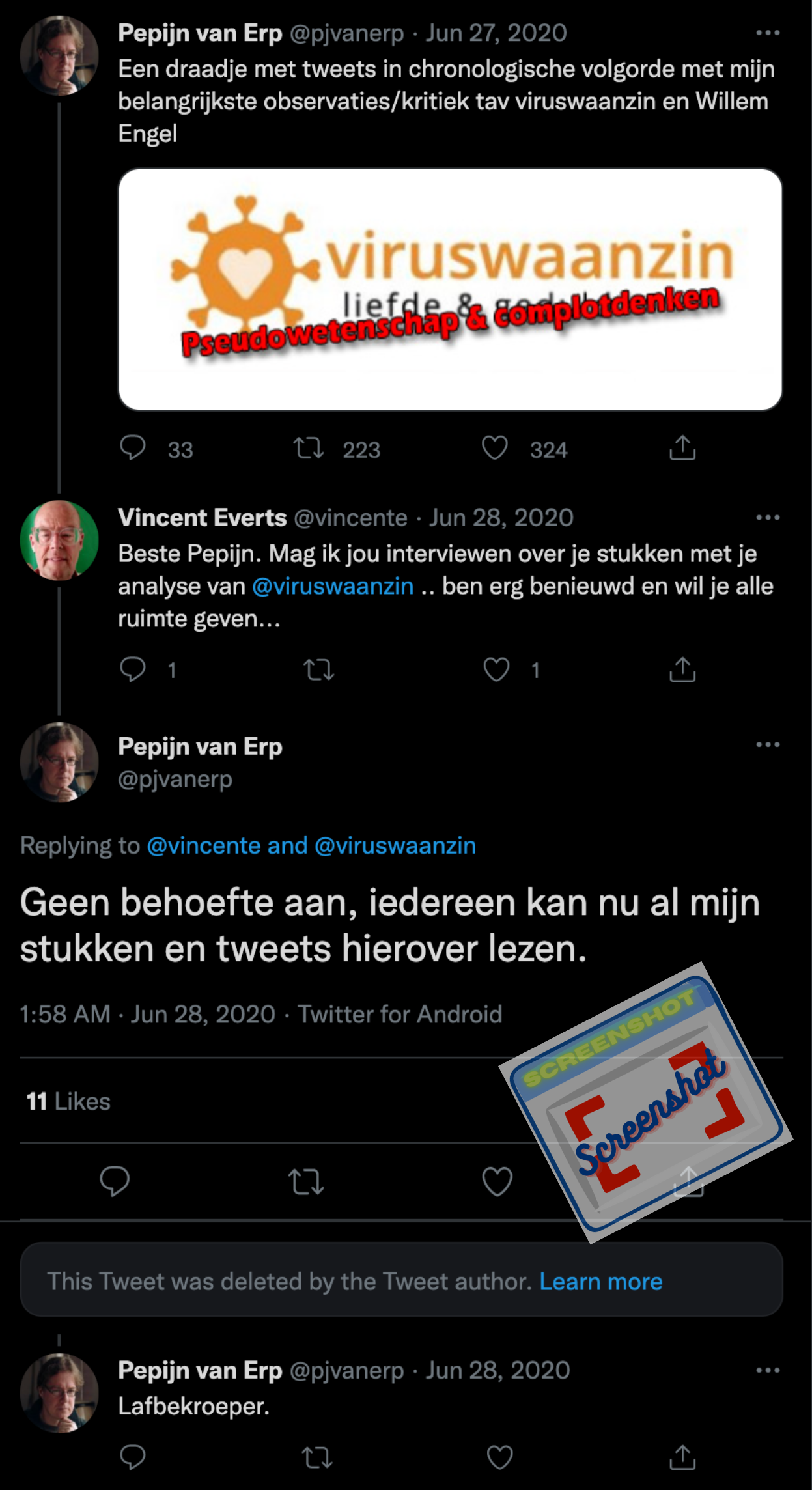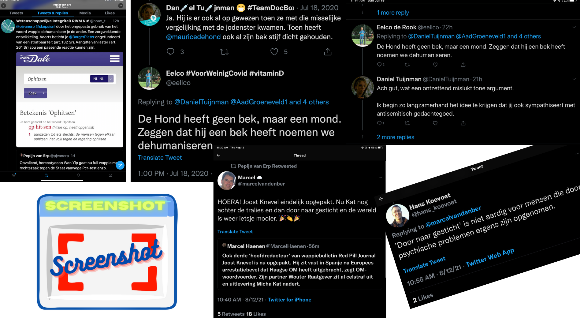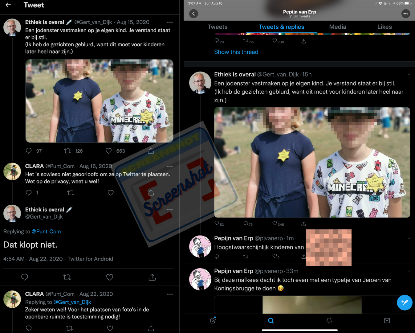 Zo postte op 15 augustus 2020 Pepijn van Erp als reactie op een post van het Twitter account “Ethiek is overal” bij een foto van een Corona-betoging met daarin weliswaar geblurde kinderen met een “Davidsster” de volledige naam van de vader van de twee kinderen. Ofschoon Gert van Dijk van het “Ethiek is overal” account dus juist postte om iets aan de kaak te stellen, viel dat bij mij in de verkeerde aarde als zijnde een tweet die voor extra rottigheid kan zorgen. Dat mijn inschatting correct was, bleek ook, want eronder verscheen bijvoorbeeld al spoedig de ongeblurde foto van de kinderen (die overigens nog steeds online staat ten tijde van het schrijven van dit blog). Toen ik gealarmeerd hierover bij Jan Willem Nienhuys aan de bel trok, reageerde Nienhuys niet. Van Erp verwijderde de tweet wel.
