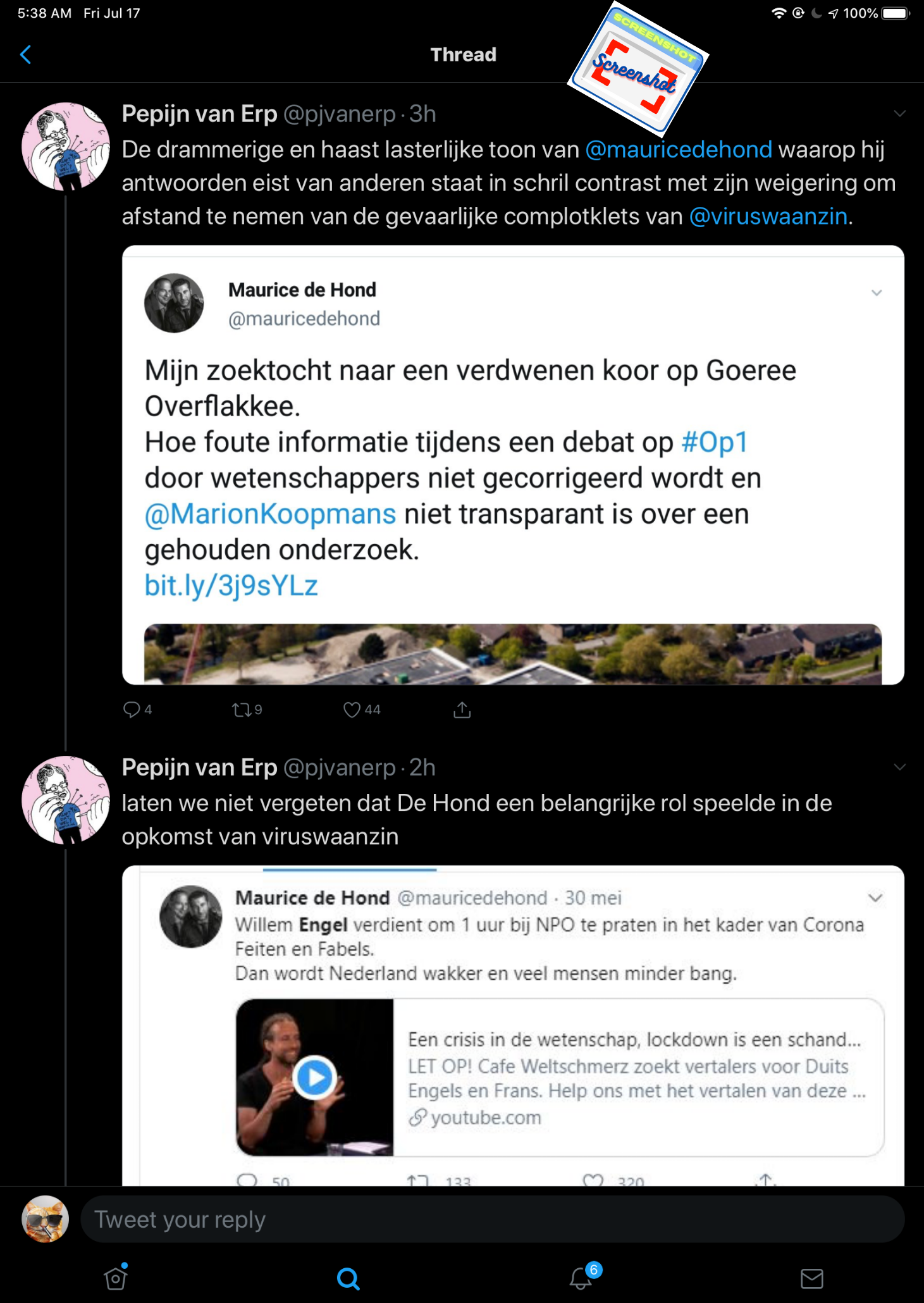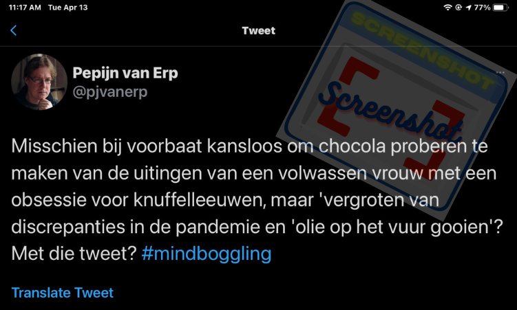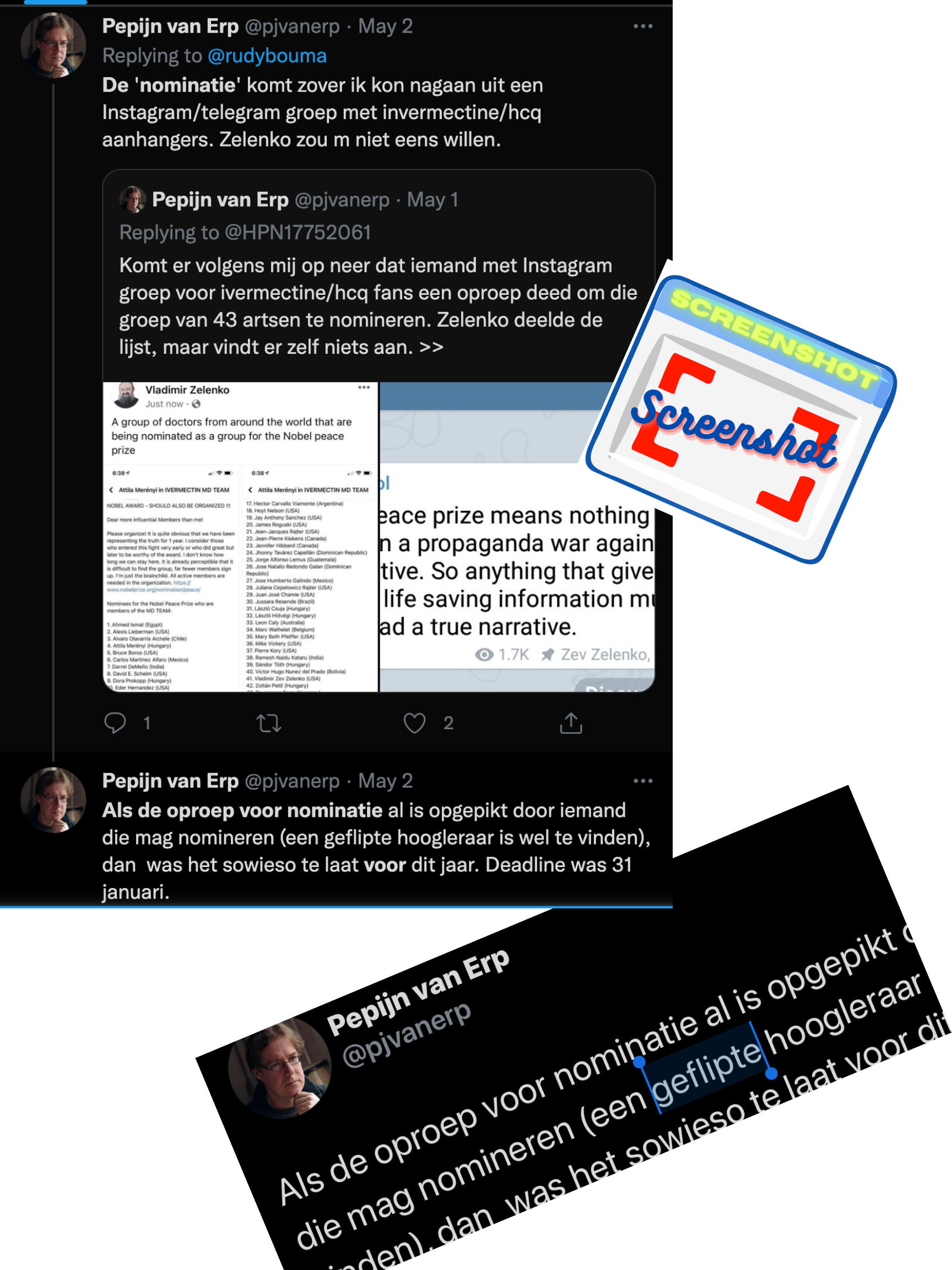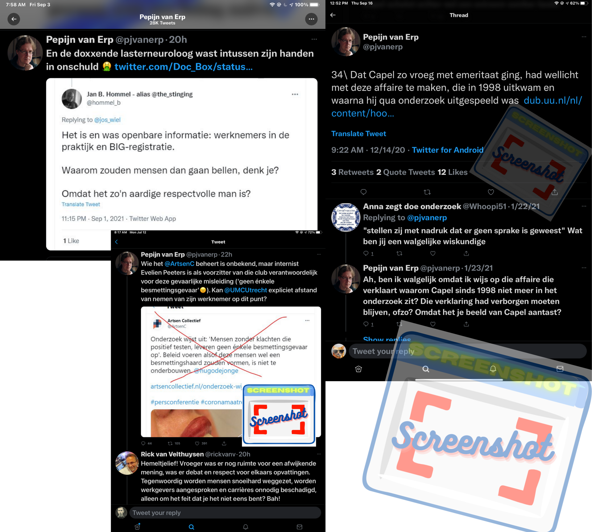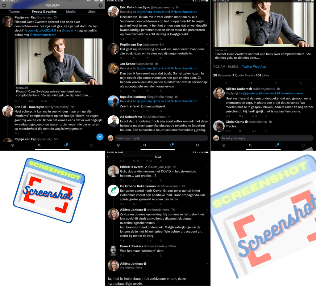 Zo postte op 15 augustus 2020 Pepijn van Erp als reactie op een post van het Twitter account “Ethiek is overal” bij een foto van een Corona-betoging met daarin weliswaar geblurde kinderen met een “Davidsster” de volledige naam van de vader van de twee kinderen. Ofschoon Gert van Dijk van het “Ethiek is overal” account dus juist postte om iets aan de kaak te stellen, viel dat bij mij in de verkeerde aarde als zijnde een tweet die voor extra rottigheid kan zorgen. Dat mijn inschatting correct was, bleek ook, want eronder verscheen bijvoorbeeld al spoedig de ongeblurde foto van de kinderen (die overigens nog steeds online staat ten tijde van het schrijven van dit blog). Toen ik gealarmeerd hierover bij Jan Willem Nienhuys aan de bel trok, reageerde Nienhuys niet. Van Erp verwijderde de tweet wel.