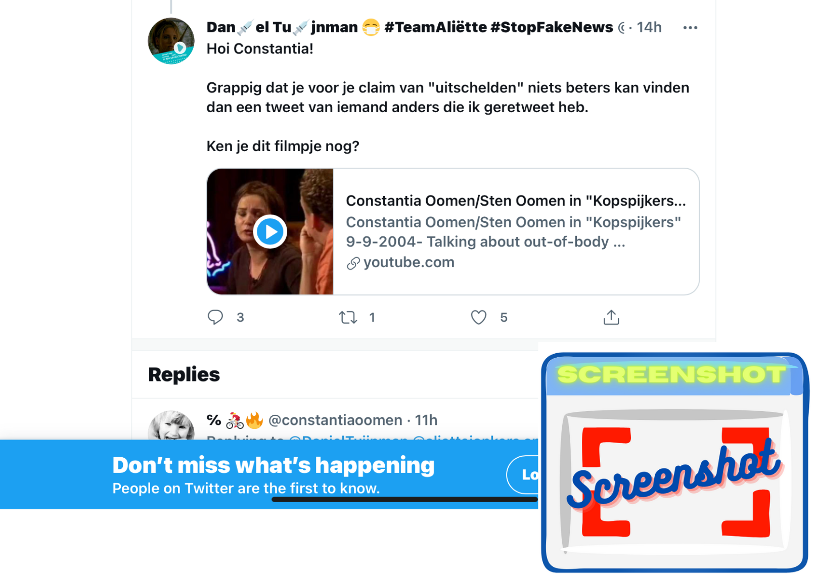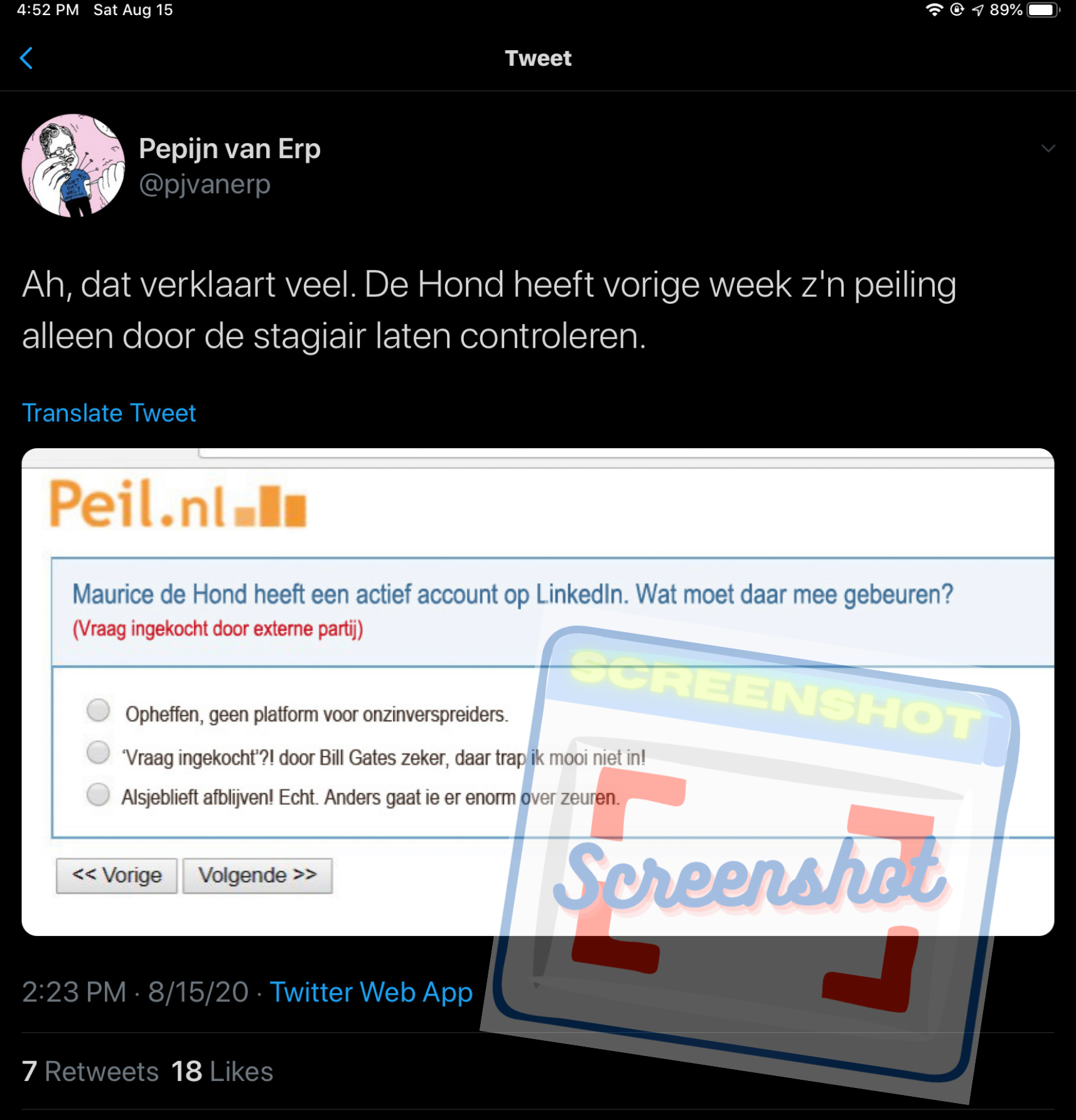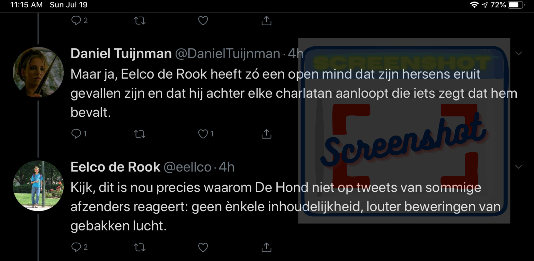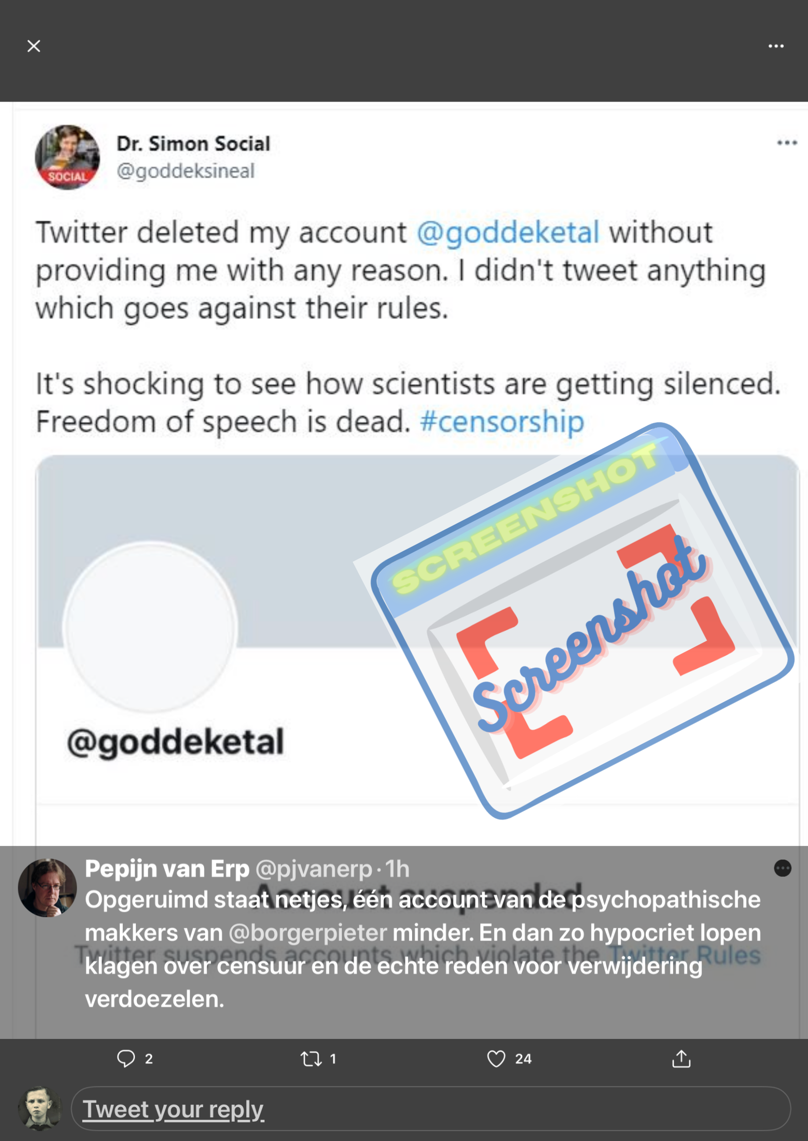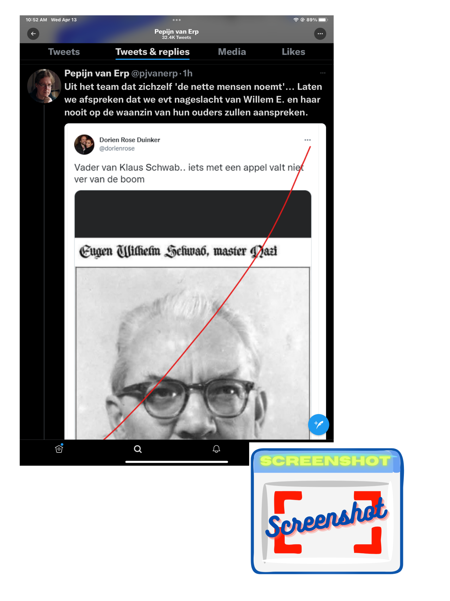 Zo postte op 15 augustus 2020 Pepijn van Erp als reactie op een post van het Twitter account “Ethiek is overal” bij een foto van een Corona-betoging met daarin weliswaar geblurde kinderen met een “Davidsster” de volledige naam van de vader van de twee kinderen. Ofschoon Gert van Dijk van het “Ethiek is overal” account dus juist postte om iets aan de kaak te stellen, viel dat bij mij in de verkeerde aarde als zijnde een tweet die voor extra rottigheid kan zorgen. Dat mijn inschatting correct was, bleek ook, want eronder verscheen bijvoorbeeld al spoedig de ongeblurde foto van de kinderen (die overigens nog steeds online staat ten tijde van het schrijven van dit blog). Toen ik gealarmeerd hierover bij Jan Willem Nienhuys aan de bel trok, reageerde Nienhuys niet. Van Erp verwijderde de tweet wel.