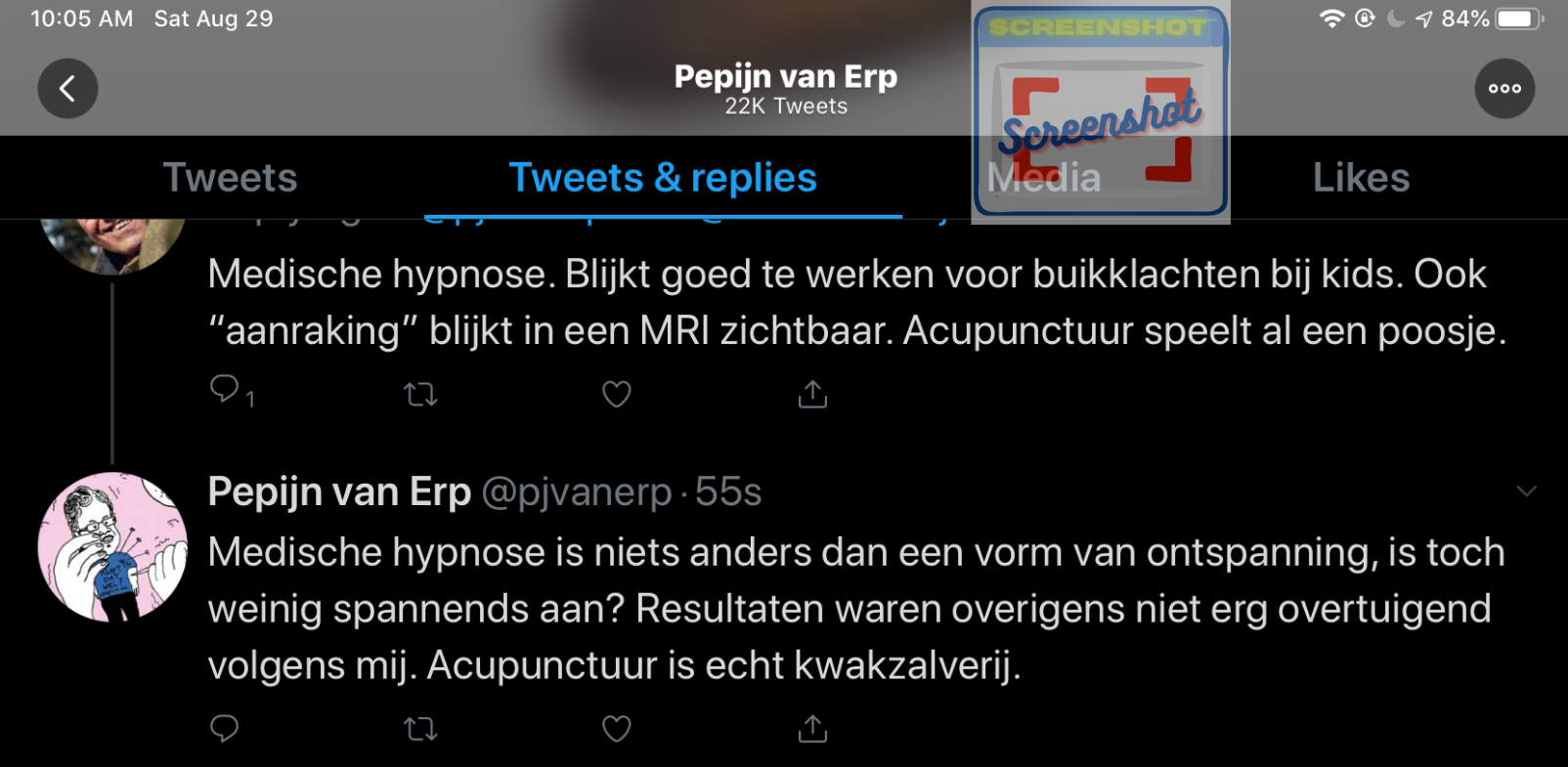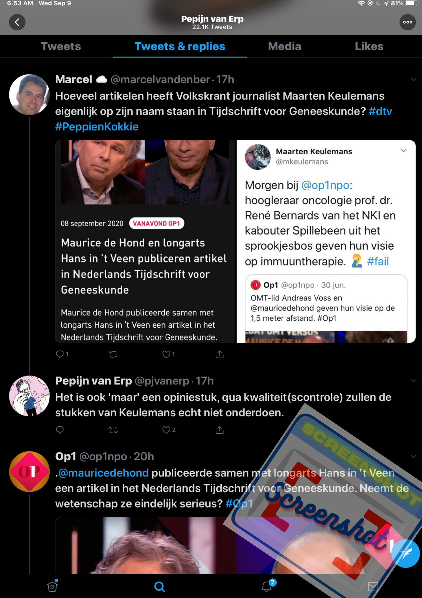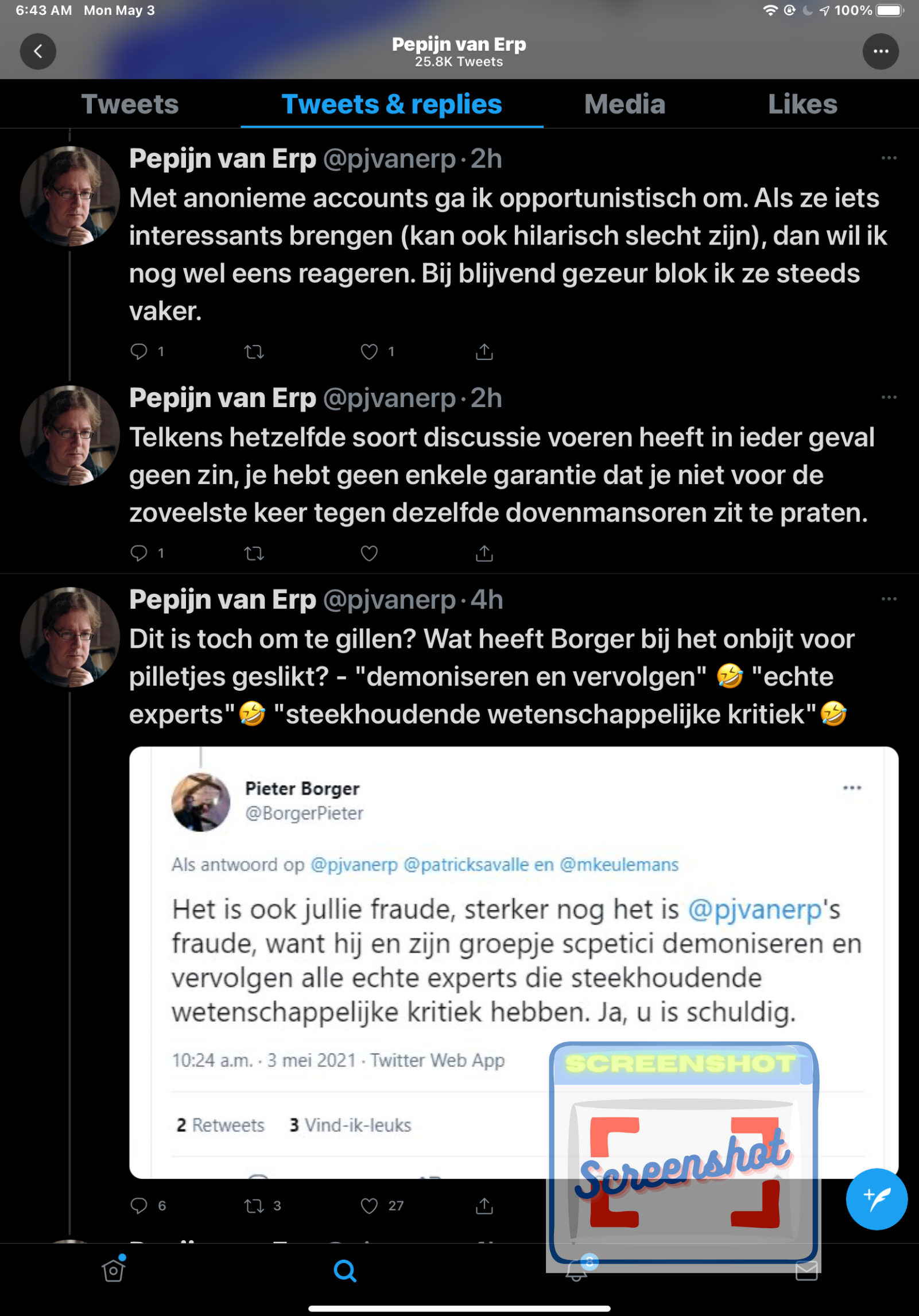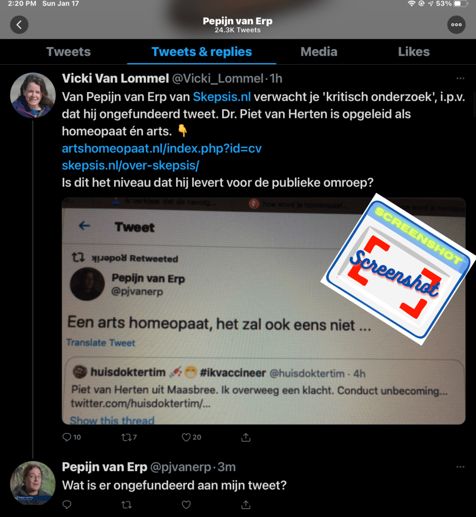 In april 2020 werd ik opeens zonder verklaring, ook na een paar keer online navragen, op Van Erps persoonlijke Twitter account geblokkeerd. Op Twitter reageer ik vanuit mijn betrokkenheid bij Stichting Skepsis af en toe op hem, naar mijn weten en herinnering altijd goedgezind dan wel beschaafd. Gemaild had ik hem al niet meer sinds november 2019. Dit vraagt om een korte toelichting. Van Erp en ik mailden als het zo uitkwam, en dat ging veel over de zaak Robbert van den Broeke en ook wel over kloptdatwel.nl zaken. Omdat de van den Broeke zaak een langdurige was, beloopt het aantal emails in de vele honderden, om precies te zijn: 4483 mails van mij naar Van Erp, waaronder nadrukkelijk ook veel groepsmails, omdat er veel mensen meededen met de Robbert van den Broeke discussie, en 945 mails van Van Erp naar mij. Precies een jaar later blokkeerde hij mij ook op het Twitter Skepsis account dat hij beheert. Dit was voor mijn gevoel toch van een andere orde. Blokken doe ik zelf al geruime tijd (vermoedelijk een paar jaar nou) in het geheel niet meer. Immers: Twitter blijft toch wel zichtbaar, tenzij je je account geheel op slot zet. Blokkeren roept in feite het maken van screenshots op, omdat je niet onderaan de tweet kan aansluiten voor je reactie(s). Met blokken stuur je een bericht naar de ander: “Jij doet voor mij niet meer mee”. Ik bleef en blijf ook op Van Erps tweets reageren, maar dus gedwongen indirect, dus via screenshots, en zeker toen ik besloot dit blog over mijn ontluisterende waarnemingen over skeptische discussies te schrijven. Hier is een voorbeeld van mijn manier van reageren.