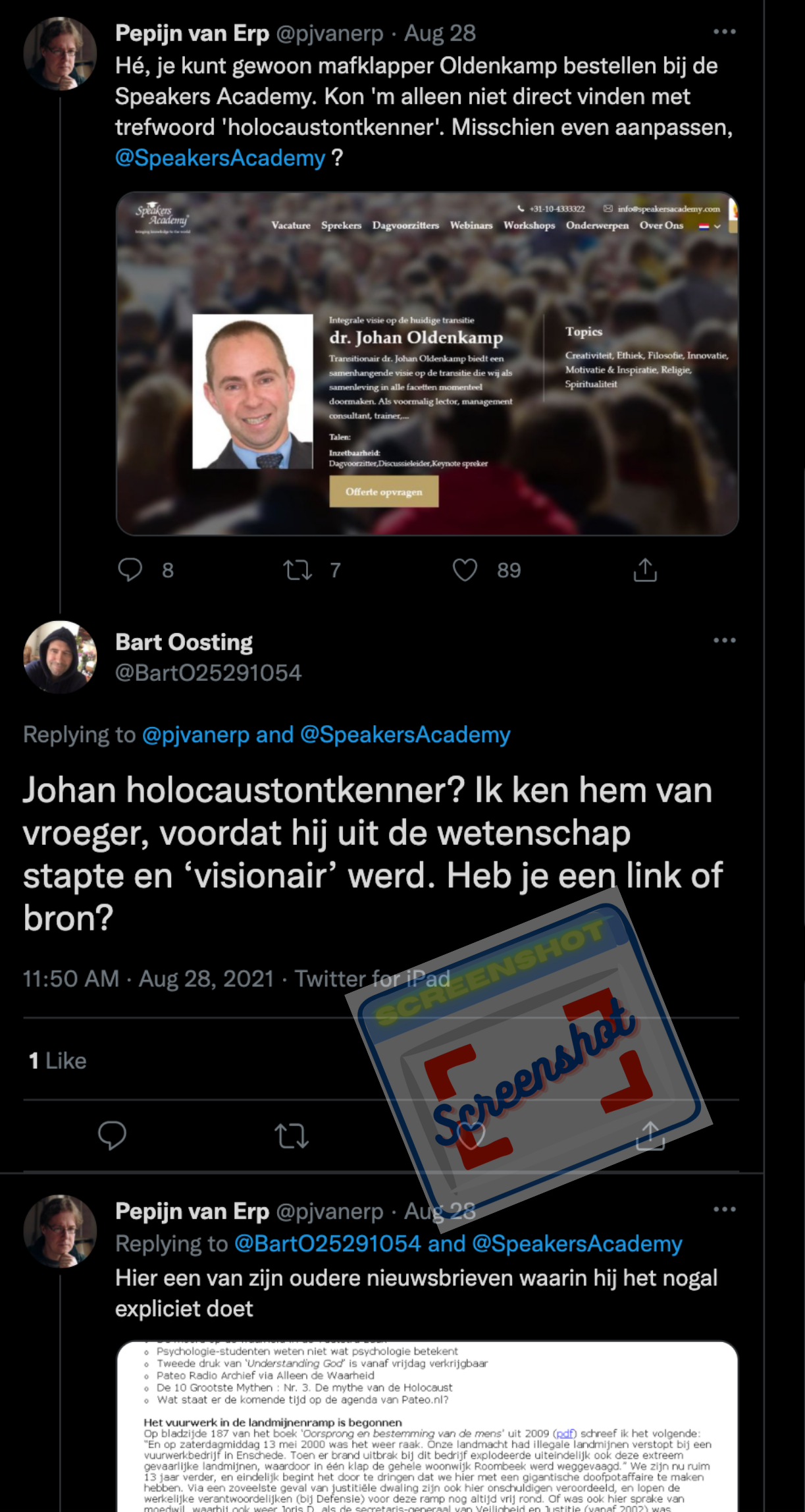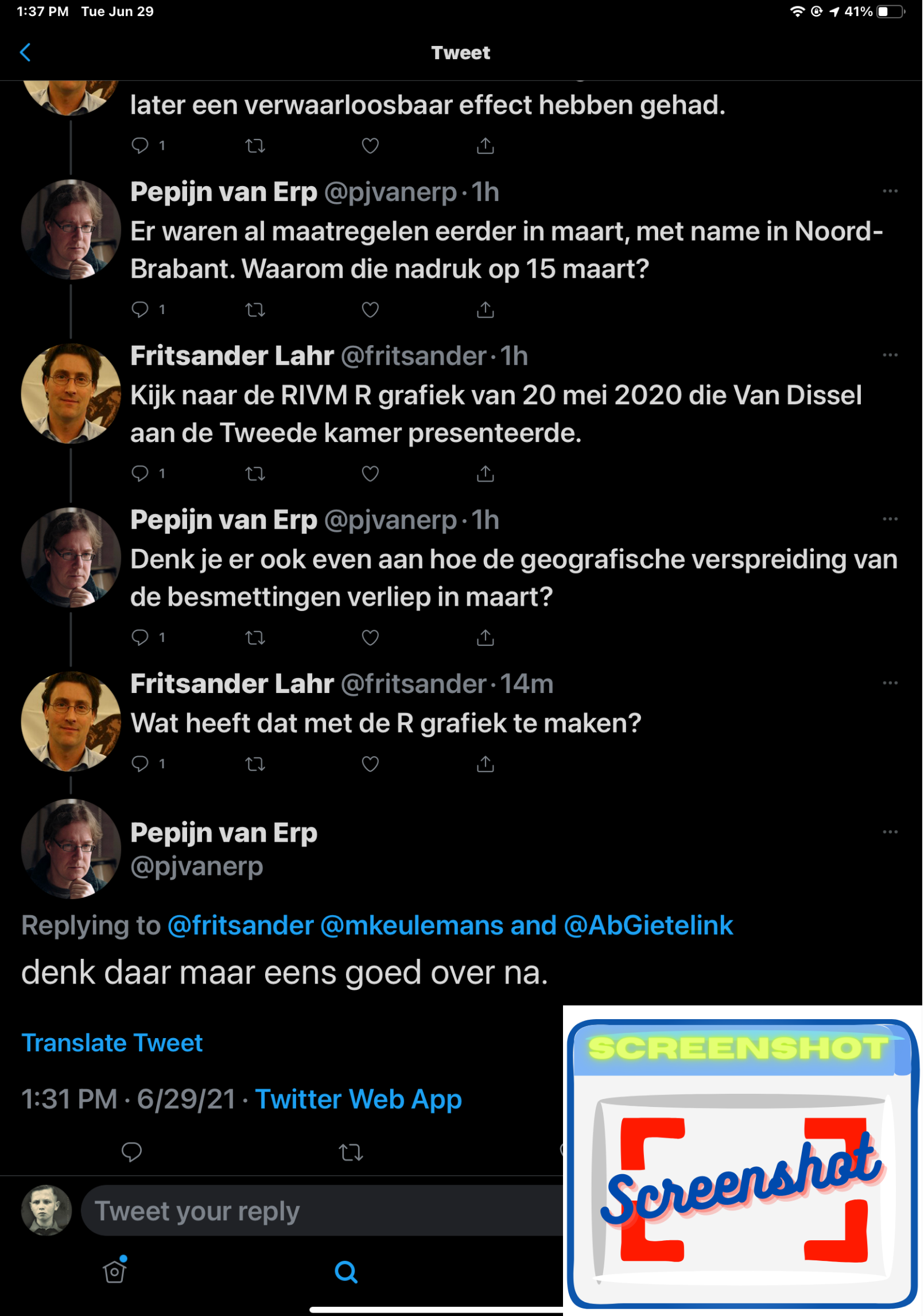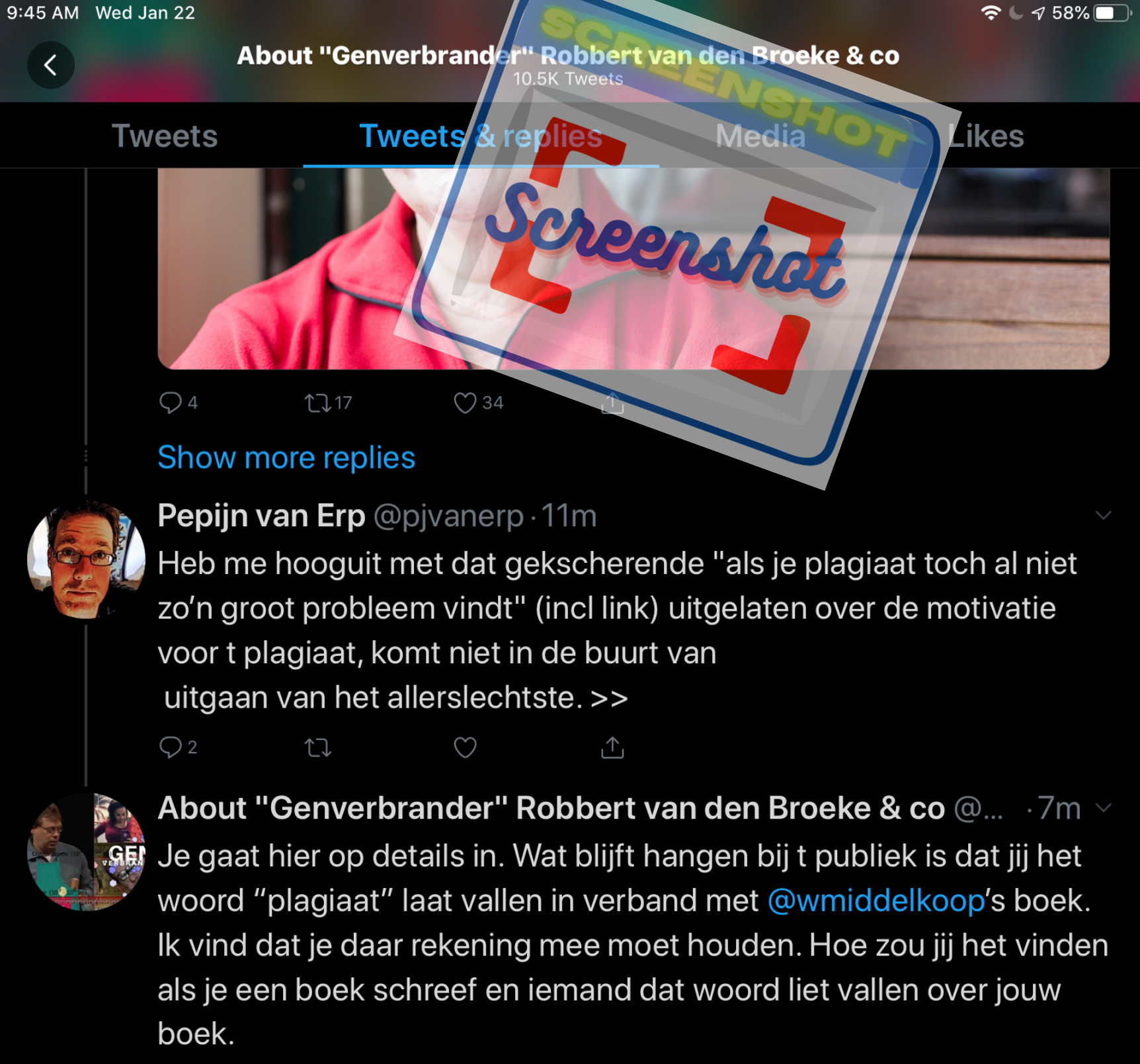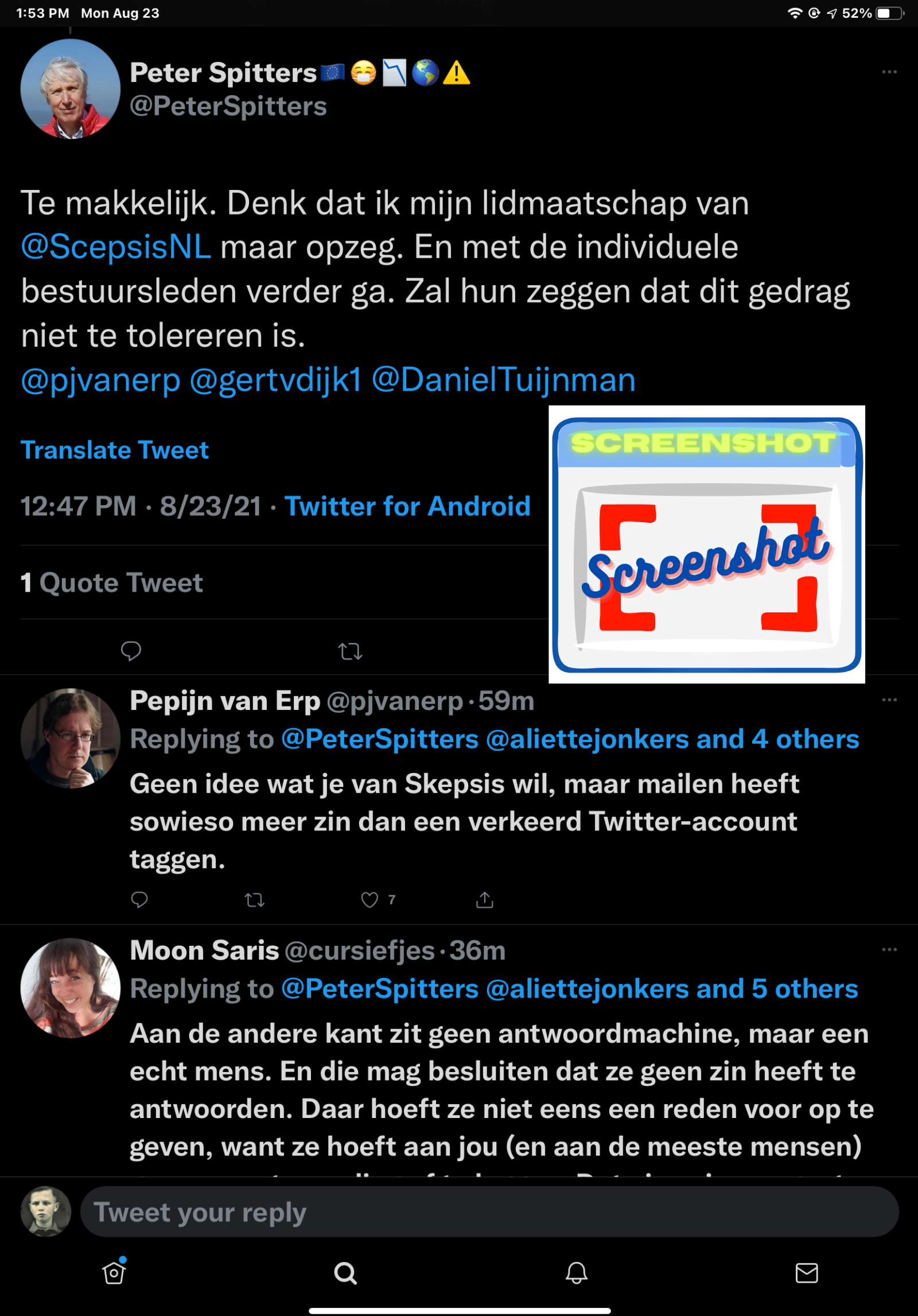 In april 2020 werd ik opeens zonder verklaring, ook na een paar keer online navragen, op Van Erps persoonlijke Twitter account geblokkeerd. Op Twitter reageer ik vanuit mijn betrokkenheid bij Stichting Skepsis af en toe op hem, naar mijn weten en herinnering altijd goedgezind dan wel beschaafd. Gemaild had ik hem al niet meer sinds november 2019. Dit vraagt om een korte toelichting. Van Erp en ik mailden als het zo uitkwam, en dat ging veel over de zaak Robbert van den Broeke en ook wel over kloptdatwel.nl zaken. Omdat de van den Broeke zaak een langdurige was, beloopt het aantal emails in de vele honderden, om precies te zijn: 4483 mails van mij naar Van Erp, waaronder nadrukkelijk ook veel groepsmails, omdat er veel mensen meededen met de Robbert van den Broeke discussie, en 945 mails van Van Erp naar mij. Precies een jaar later blokkeerde hij mij ook op het Twitter Skepsis account dat hij beheert. Dit was voor mijn gevoel toch van een andere orde. Blokken doe ik zelf al geruime tijd (vermoedelijk een paar jaar nou) in het geheel niet meer. Immers: Twitter blijft toch wel zichtbaar, tenzij je je account geheel op slot zet. Blokkeren roept in feite het maken van screenshots op, omdat je niet onderaan de tweet kan aansluiten voor je reactie(s). Met blokken stuur je een bericht naar de ander: “Jij doet voor mij niet meer mee”. Ik bleef en blijf ook op Van Erps tweets reageren, maar dus gedwongen indirect, dus via screenshots, en zeker toen ik besloot dit blog over mijn ontluisterende waarnemingen over skeptische discussies te schrijven. Hier is een voorbeeld van mijn manier van reageren.
