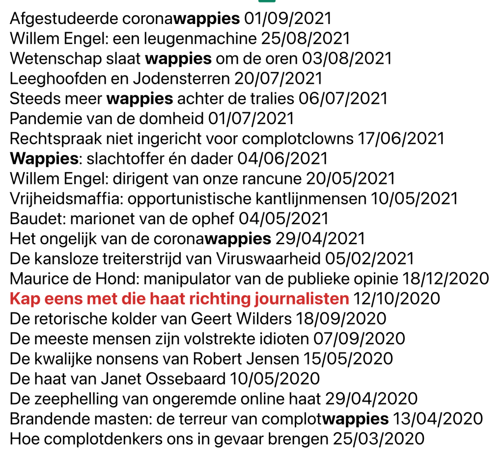 Een selectieve blik, uitgezocht naar inhoud van dit blog, op opiniemaker Chris Klomp’s website, namelijk daar waar het gaat over “wappies”, illustreert mijns inziens de blinde vlekken die aan beide zijden, de “skeps en de altos”, van de (Corona-)strijd aanwezig zijn. Ik heb één zin in rood gezet, die mijns inziens toch tot nadenken kan stemmen, gezien de rest van de titels: “Kap eens met die haat richting journalisten”. Tevens heb ik het gebruik van het woord “wappies” in vet gezet.