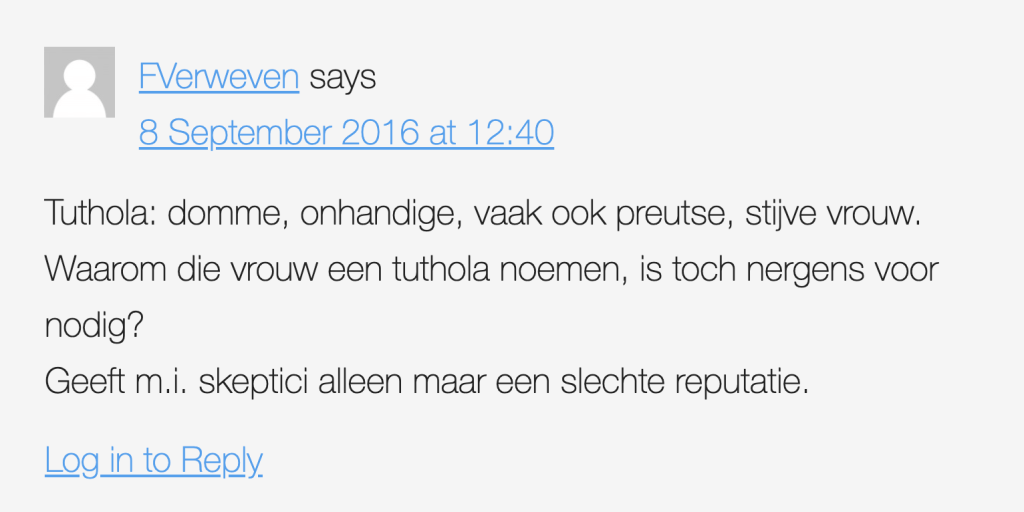 Dat commentaar past binnen het kader van dit blog: “FVerweven” op 8 september 2016: “Tuthola: domme, onhandige, vaak ook preutse, stijve vrouw. Waarom die vrouw een tuthola noemen, is toch nergens voor nodig? Geeft m.i. skeptici alleen maar een slechte reputatie.” “FVerweven” richtte zijn pijlen op de titel van het blog dat met het woord “Tuthola” meteen de toon had gezet.