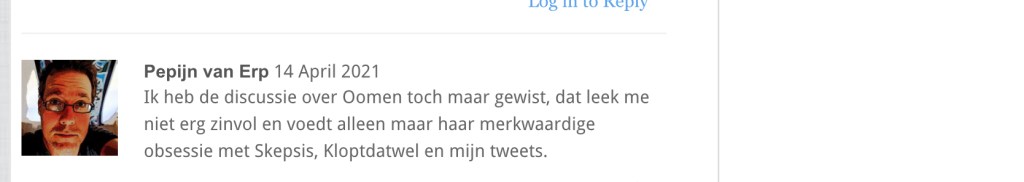 Wat rest er van enthousiasme en welwillendheid aan skeptici-zijde als mensen die (deels) anders denken willen bijdragen aan discussies? Op kloptdatwel.nl werd er op een gegeven moment na de blok van Van Erp op mij gereageerd op wat tweets van mij, en Pepijn van Erp reageerde op kloptdatwel.nl als volgt: “Ik heb de discussie over Oomen toch maar gewist, dat leek me niet erg zinvol en voedt alleen maar haar merkwaardige obsessie met Skepsis, Kloptdatwel en mijn tweets.”. Betreffende reacties over mij, inclusief zijn eigen reactie, zijn inmiddels integraal door Van Erp verwijderd.