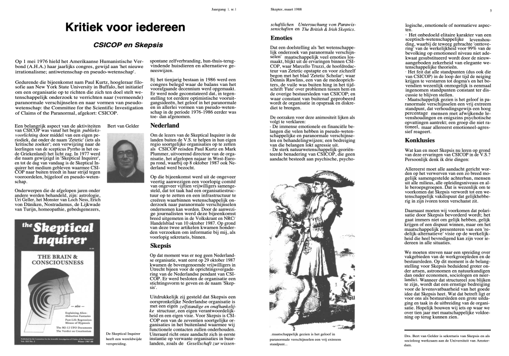 Drs. Bert van Gelder is sekretaris van Skepsis en als socioloog werkzaam aan de Universiteit van Amsterdam.” Uit: Skepter Jaargang 1, nummer 1, 1988.