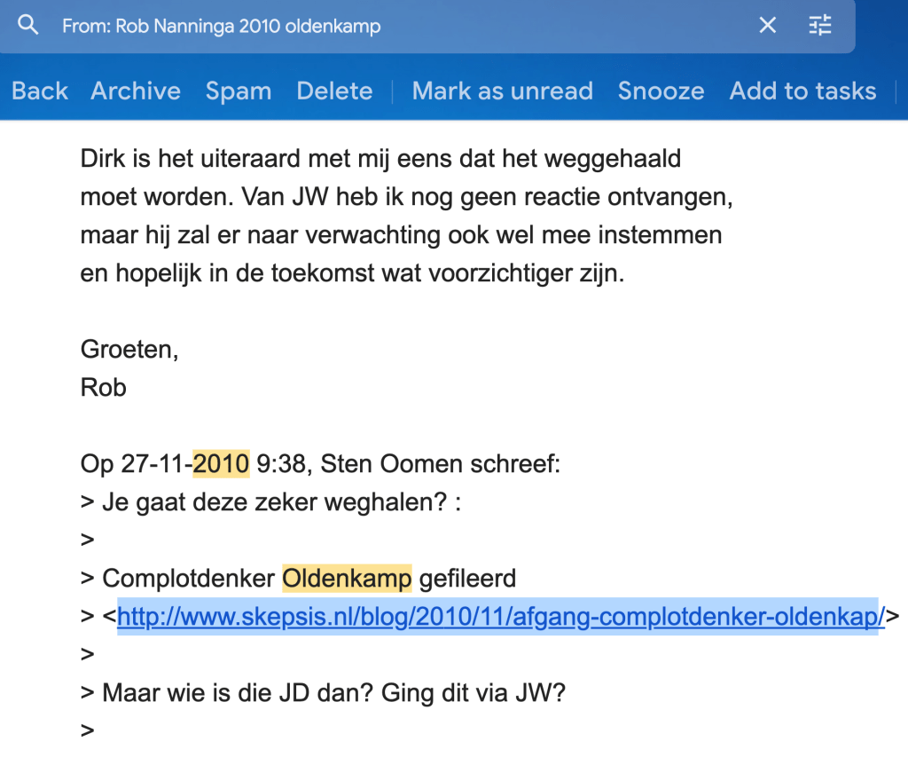 Dit bleek in 2010 uit een steekspel over en weer naar aanleiding van een Skepsis blog met betrekking tot een lezing van de nog immer actieve Johan Oldenkamp. In een mail die Rob Nanninga volgens mij als enige ooit van al zijn mails onderaan met “Deze mail is privé” labelde (niet de mail bij deze alinea afgebeeld), schreef hij dat zijn ethiek afweek van die van Jan Willem Nienhuys (geparafraseerd en onder weglating van de rest). Het betreffende blog werd later door dit gesteggel in het geheel van de Skepsis website verwijderd.