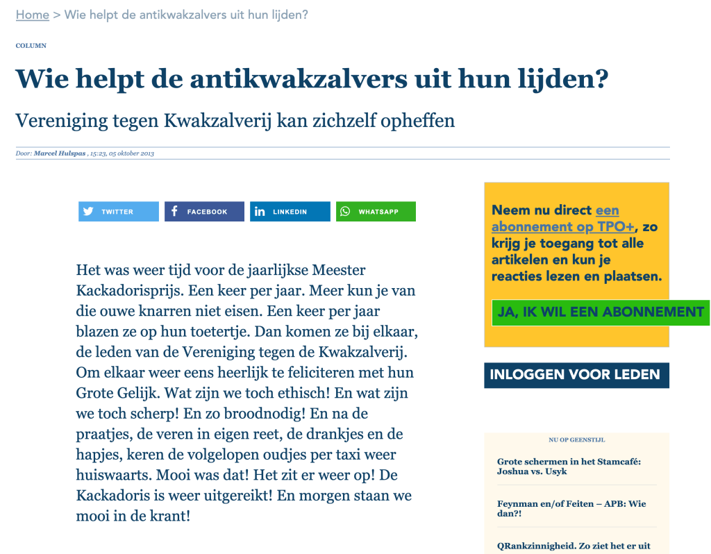 Genoemde mede-oprichter van Skepsis, Marcel Hulspas, bleek in 2013 overigens evenmin een liefhebber van de Vereniging tegen de Kwakzalverij, zoals blijkt uit het fulminerende stuk dat hij publiceerde op ThePostOnline.