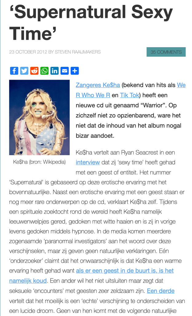 Toen er in 2012 een artikeltje op kloptdatwel.nl verscheen dat raakvlakken heeft met mijn boeken, werd er reikhalzend naar mijn bijdrage uitgekeken en begon men te mopperen nu ik juist schitterde door bewuste afwezigheid. Ik wist door ervaring waar men hier op uit was: het “para”thema bloedig uiteen trekken om het vervolgens als grof vuil weg te gooien, kind met badwater inbegrepen. Het groepje reageerders en de moderatie aldaar zullen dit waarschijnlijk vehement ontkennen, maar mijn stellige indruk is dit: werkelijk openstaan voor zulke thema’s doet men daar niet. Kortom: ik bedankte voor de “eer”.