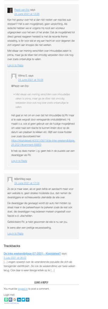 De die-hard “FVerweven” lijkt in 2021 de kloptdatwel-deur achter zich dichtgetrokken te hebben. “IkBenWeg”: “Zo zie je maar weer, als er geen liefde en aandacht meer voor een website is, geen strakke moderatie dus, dan nemen de dwarsliggers en schreeuwerds uiteindelijk de site over. […] Gefeliciteerd RV, je hebt gewonnen de site is nu van jou. Ik wens allen een prettige eeuwwisseling.”