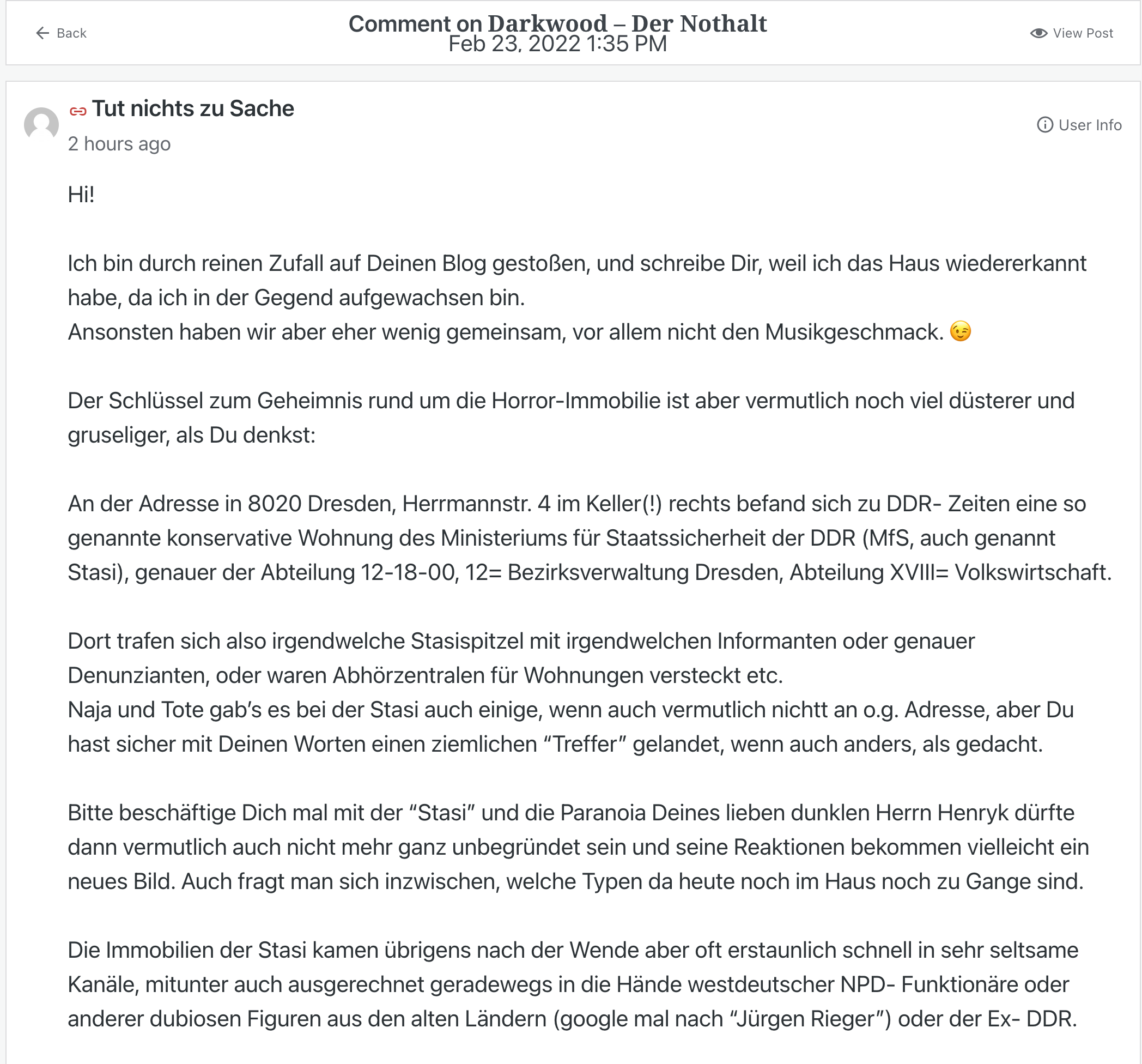 Yes, in the basement of this house dwelt betraying evil in the form of the Stasi. Perhaps some form of evil still dwells there, and imo, the house should be combed thoroughly. Stasi successors and (neo) Nazis are still very active in 2022 and a real threat in and around Dresden. Please read for yourself, tip: Google Translate. Of course you don’t have to wait for me to do your own research.
