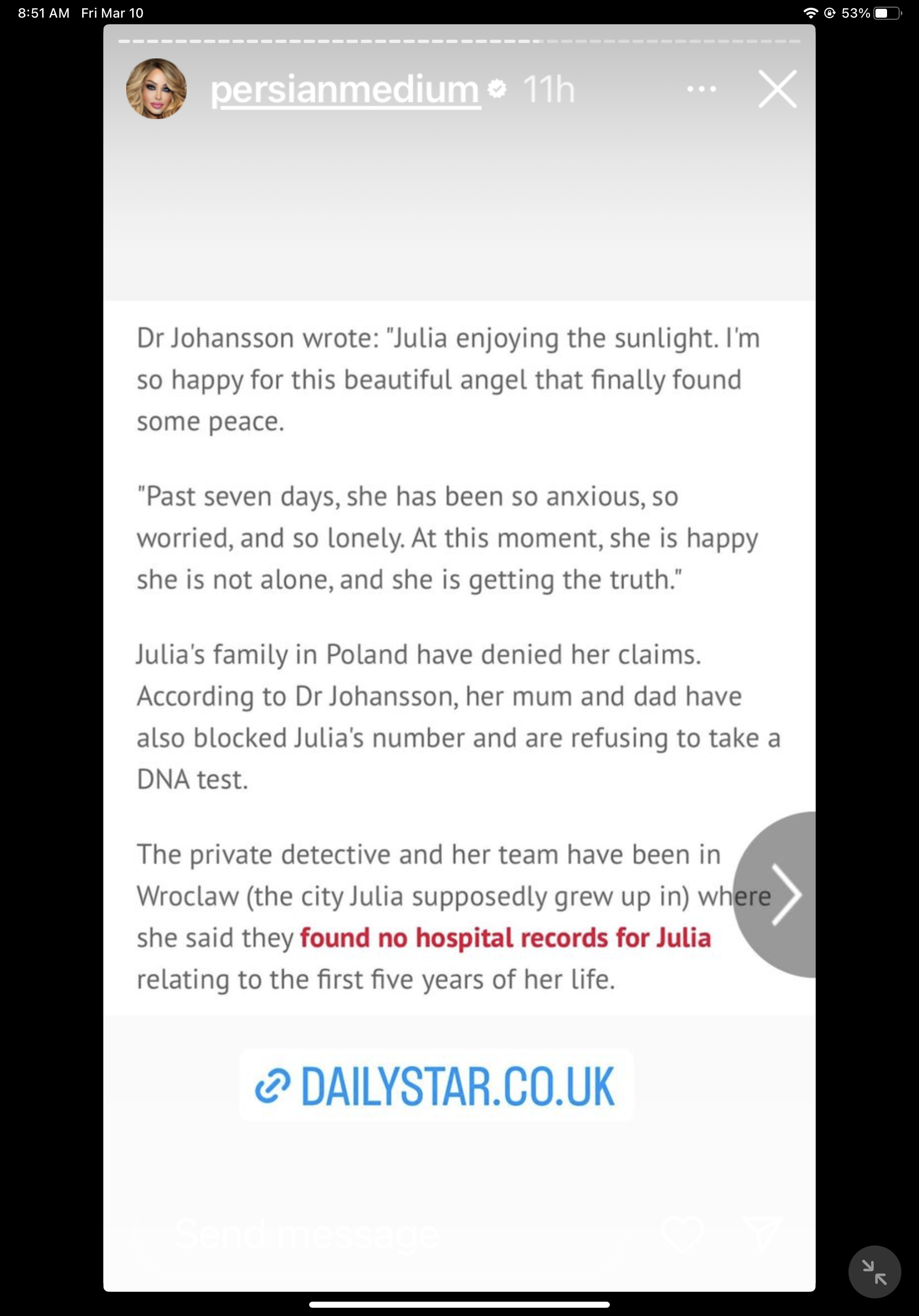 Persian Medium, un influencer de Instagram con 9,5 millones de seguidores, ha sido expuesto por afirmar falsamente tener un máster en psicología de la Universidad de Estocolmo. Esta revelación surge en medio de su participación en el caso de Maddie McCann, donde una mujer que afirma ser la niña desaparecida ha buscado su ayuda. La Universidad de Estocolmo ha confirmado que Persian Medium no está en su sistema y no tiene registro de haber obtenido un máster en su institución. Instamos al público a ser cautelosos con las afirmaciones falsas hechas por los influencers, especialmente en lo que respecta a asuntos de salud mental y psicología. Nuestra esperanza es que esta exposición responsabilice a Persian Medium por sus afirmaciones engañosas y evite más daño a aquellos que buscan ayuda y orientación.