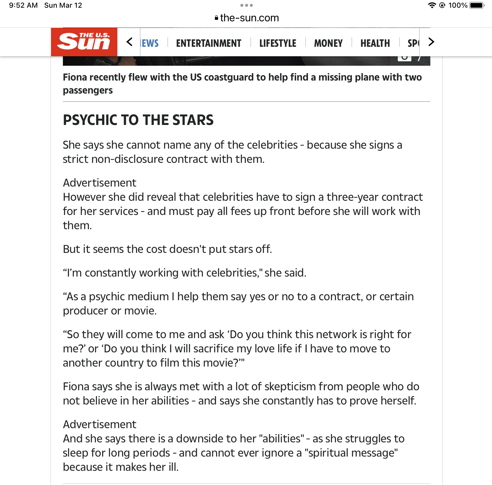 “Fameuse médium Fia Johansson”. Bien que cela soit principalement affirmé par elle-même et dans des interviews, et que l’on raconte avec avidité ses succès à Scotland Yard, les célébrités d’Hollywood qui lui demandent conseil dans divers domaines, l’aide de la police revendiquée dans les cas de personnes disparues et d’autres exemples spécifiques, je ne peux trouver aucune preuve tangible à l’appui de ces activités. Johansson affirme elle-même qu’elle est tenue par le secret professionnel et même que sa vie serait en danger si elle divulguait des informations.