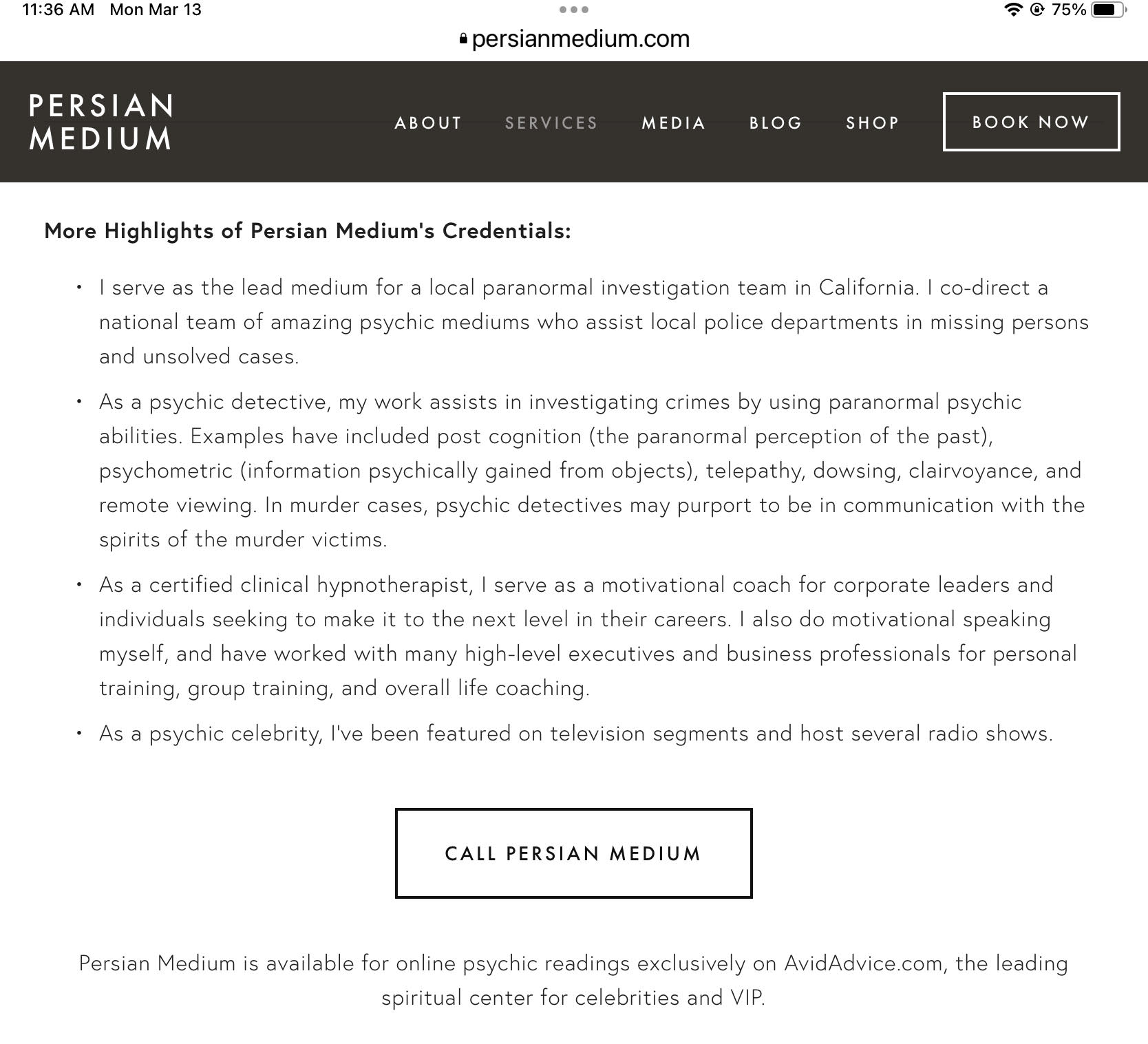 Il y a des choses sur Johansson en tant que médium sur internet, comme une histoire forte sur sa “connaissance impossible” d’un homme dont elle a vu que son fils adolescent était en danger, mais où l’homme en question ne savait même pas qu’il avait un fils. Le problème est que ces histoires ne sont pas vérifiables et restent donc anecdotiques. Une autre affaire “célébrée” de son médiumnisme serait un pilote disparu. Sur sa propre chaîne, le reportage en question, dans lequel il y a des coupes, est présenté et il est affirmé qu’elle menait la recherche, “dirigée par le médium persan“, ainsi que le fait que la famille du pilote offrait une récompense de 250 000 dollars pour la piste décisive. Cependant, le fragment se termine par la phrase peu prometteuse qu’il y a des conditions pour obtenir la récompense, ce qui donne l’impression que “le médium” Johansson ne l’a pas obtenue (sinon elle l’aurait signalé ?):