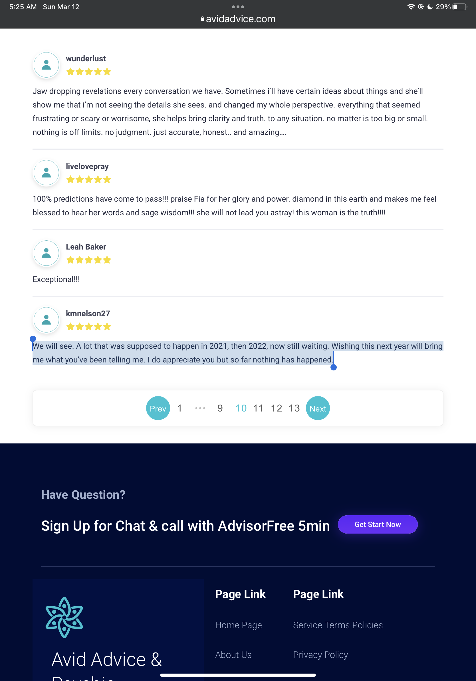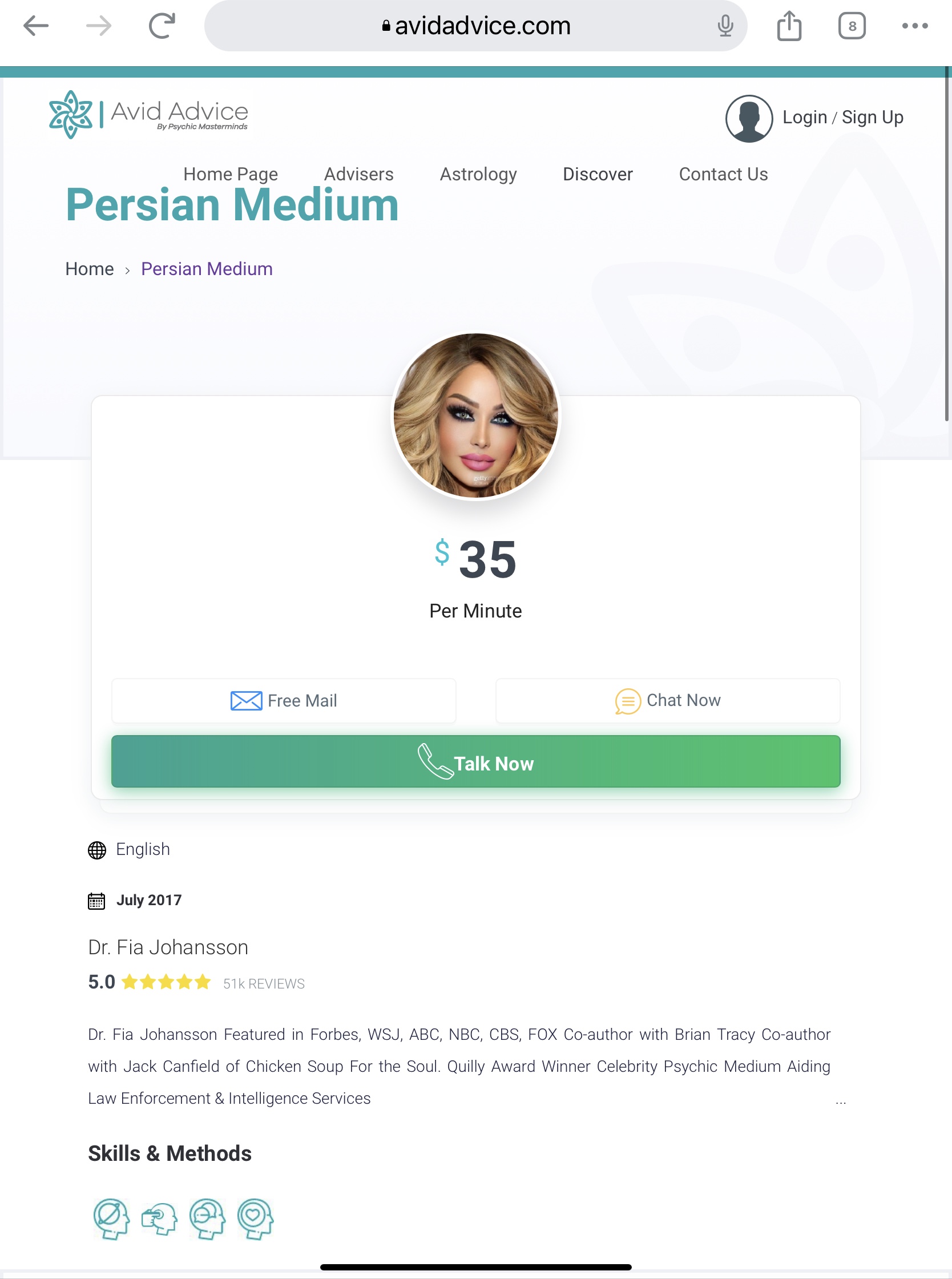“Femme d’affaires à succès Fia Johansson”. Mais est-ce qu’il n’y a vraiment rien de robuste et immédiatement vrai ? J’ai fait une recherche sur le site de conseil en médium qu’elle a présenté et il s’avère qu’elle a pas moins de 51 000 critiques de 5 étoiles ! Toutes les critiques, dont seules 13 pages sont disponibles (vous n’avez pas besoin d’être Marie Curie pour comprendre que ce ne sont pas 51K critiques), même celles avec une touche critique, s’avèrent toutes avoir cinq étoiles élogieuses. Le fait que ce soit son propre site web et qu’elle ait donc un contrôle total, eh bien, c’est juste de la nourriture pour les gens qui cherchent des poux dans la tête. Vous pouvez l’embaucher pour 35 $ par minute ou 2 500 $ par heure.