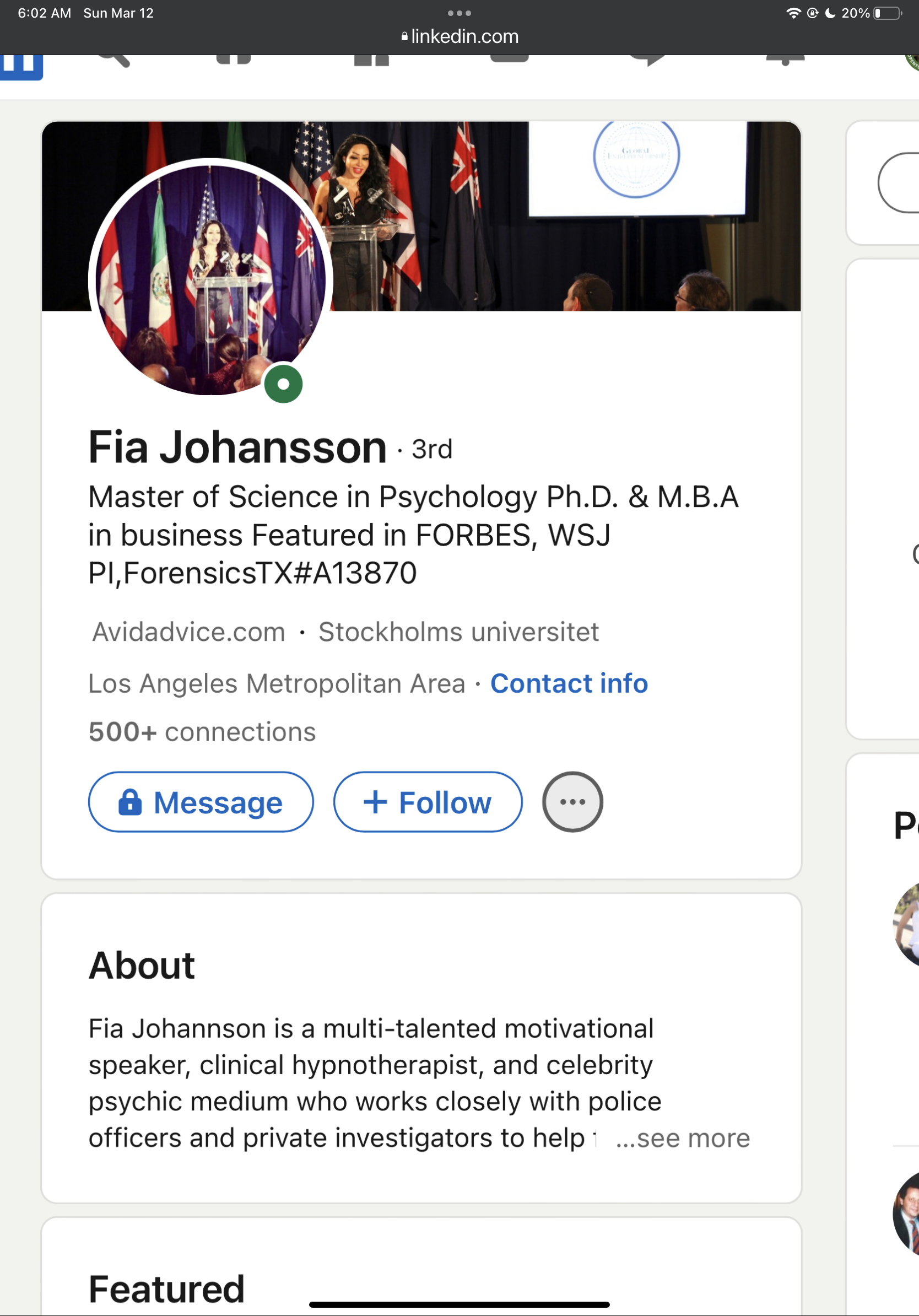 Qui est Fia Johansson ? Elle a apparemment mené une vie très active, tant au sens propre que figuré. À l’âge de quatorze ans, elle est arrivée en Suède en provenance d’Iran, où elle a rencontré son mari actuel. Ensemble, ils ont déménagé aux États-Unis. Je n’ai pas vérifié cette partie de sa biographie. Johansson a en tout cas deux comptes LinkedIn publics, mais si vous comparez les deux “champs d’expérience”, on dirait qu’il s’agit de deux personnes différentes, mais il s’agit bien de la même Fia Johansson. Johansson a apparemment construit une carrière polyvalente, où elle sépare strictement certaines choses et en fusionne d’autres. Ce sont surtout ses capacités auto-proclamées de médium “psychique paranormal” et de “médecines naturelles” (non encore reconnues) qui ont attiré mon attention. Je cite Johansson littéralement de son site web: “En tant que détective doué de capacités paranormales, mon travail consiste à aider à enquêter sur les crimes en utilisant des pouvoirs paranormaux. Les exemples incluent la postcognition (la perception paranormale du passé), la psychométrie (l’obtention psychique d’informations à partir d’objets), la télépathie, la radiesthésie, la clairvoyance et la vision à distance. Dans les affaires de meurtre, les enquêteurs paranormaux prétendent être en contact avec les esprits des victimes de meurtre.” Elle propose également du Reiki, combiné ou non avec l’hypnothérapie selon les souhaits du client, anime une émission de radio médium-psychique trois fois par semaine et propose une méthode de perte de poids “révolutionnaire” qu’elle appelle la technique Pentagon.