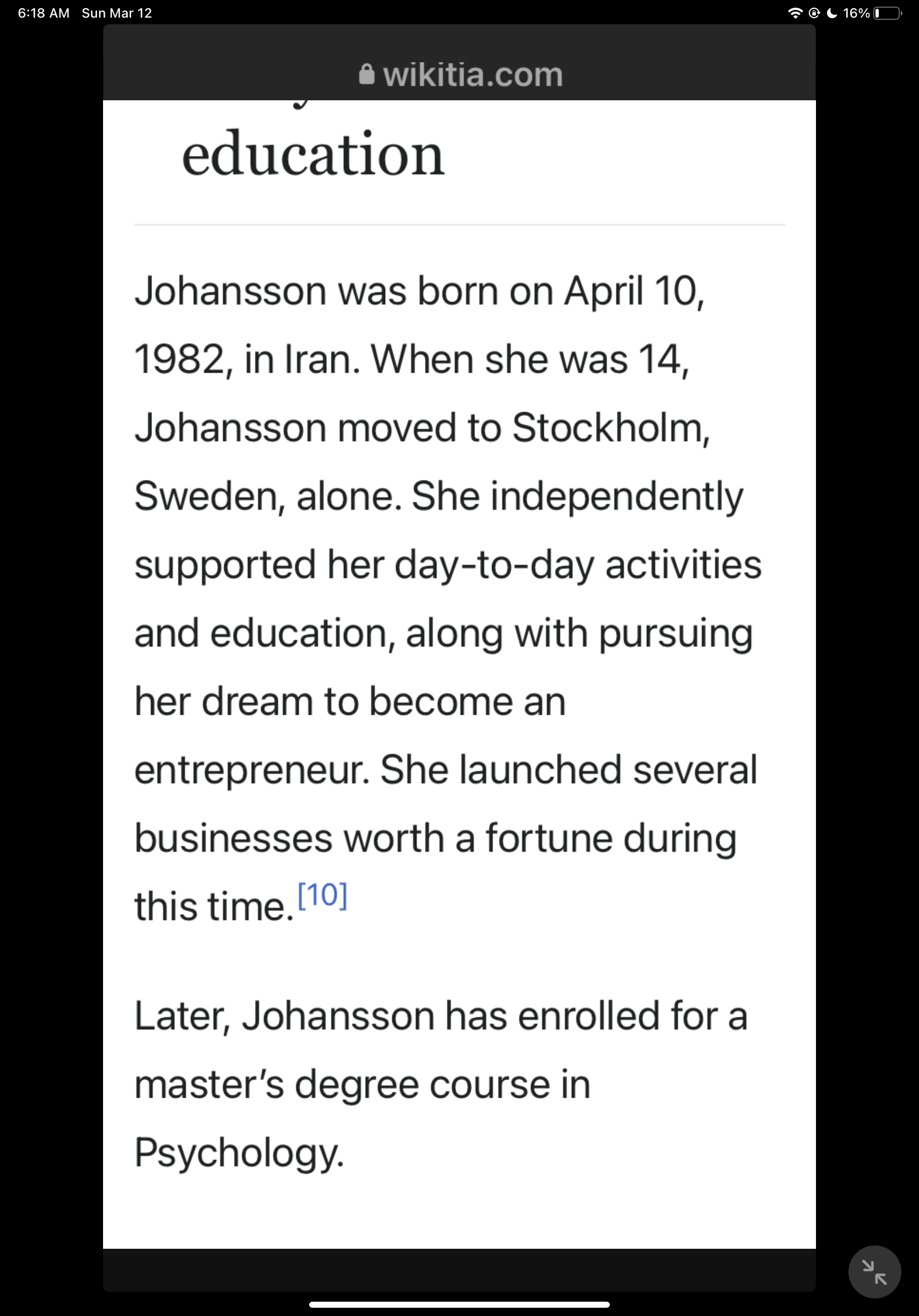 Mise à jour du 20 mars 2023. Dans une demande adressée à l’Université de Stockholm, spécifiquement à Marina Gorlyakova, responsable administrative principale de l’unité des examens/registres académiques/services aux étudiants, il a été découvert que Johansson n’a pas obtenu de diplôme de master en psychologie là-bas. Le nom combiné avec la date de naissance et les alias n’a donné aucun résultat: