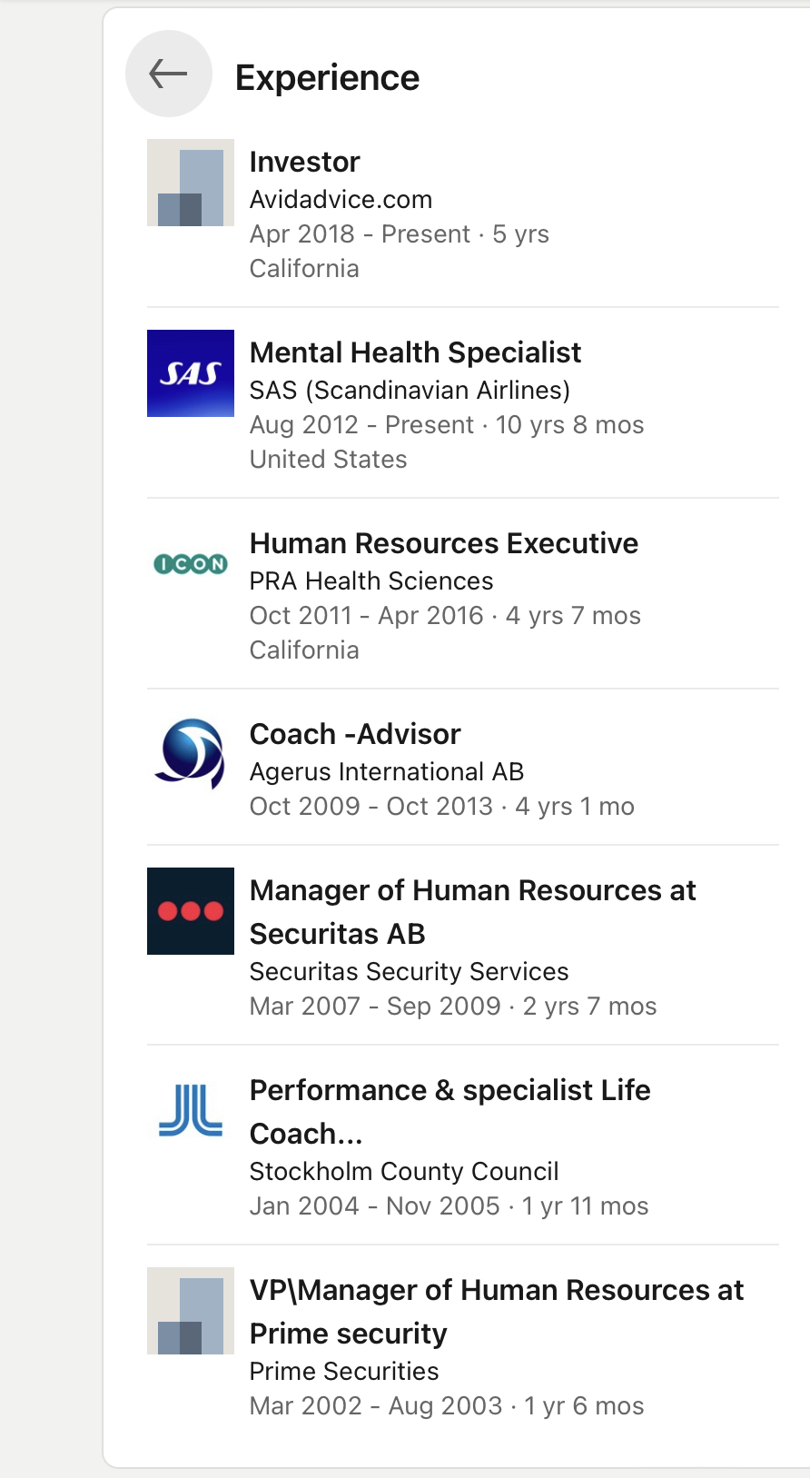 “Dr. Fia Johansson”. J’ai envoyé un e-mail à l’université de Stockholm pour vérifier si Johansson a effectivement un master en psychologie. Cela est indiqué sur son LinkedIn et est également constamment répété par elle. J’ai été renvoyé à une autre personne là-bas par le service de presse et je vous tiendrai au courant.