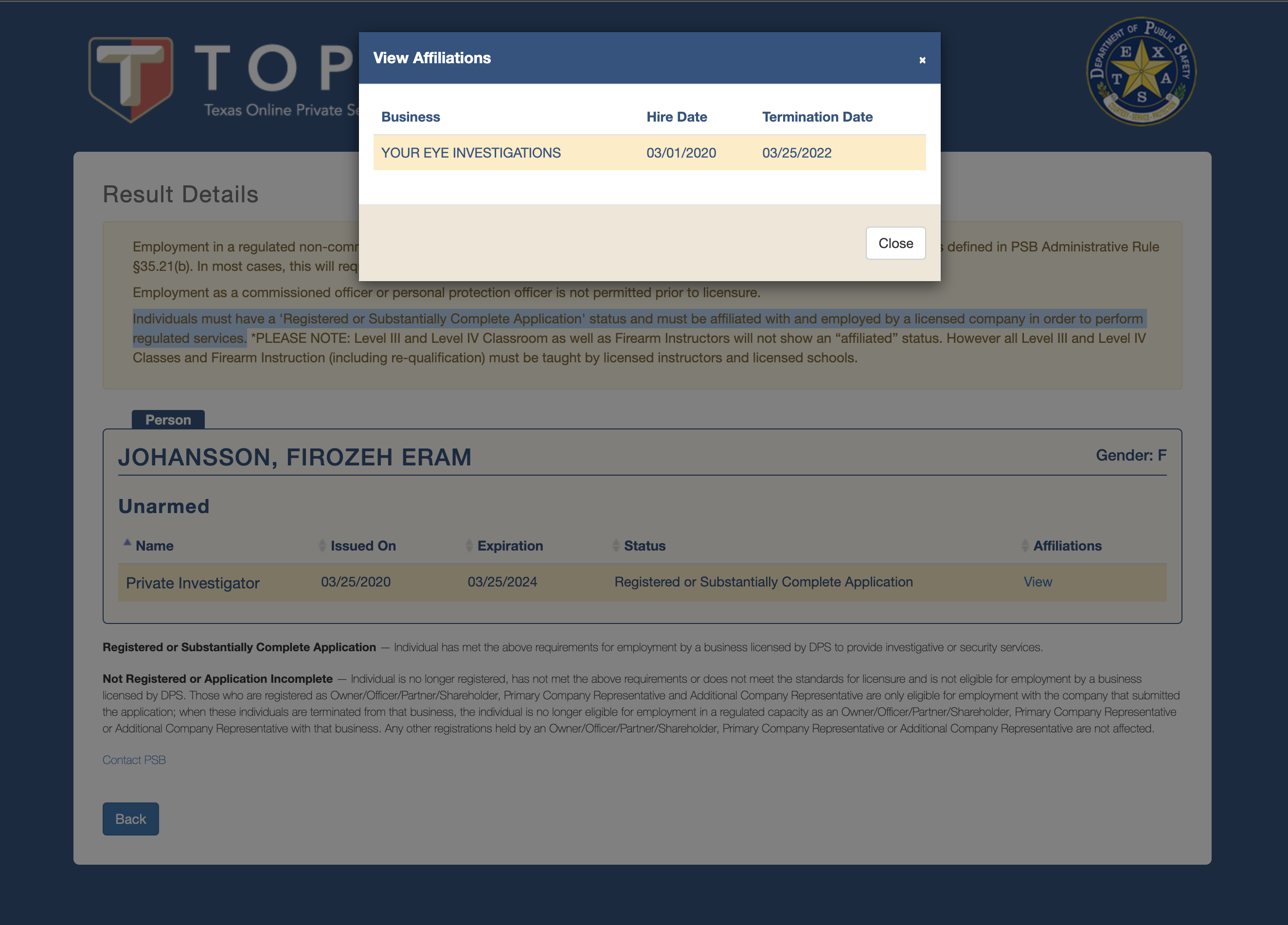 “Private Investigator Fia Johansson”. Fia Johansson a travaillé pendant deux ans en tant que détective privé au Texas. Bien que sa licence soit toujours valide – elle a été délivrée le 25 mars 2020 et est valable jusqu’au 25 mars 2024 – le gouvernement texan précise explicitement qu’un détective privé doit être affilié à une agence reconnue, sinon il/elle ne peut pas exercer le métier. Cependant, après deux ans de service, Johansson a été résiliée ou licenciée par l’agence agréée “Your Eye Investigations” le 25 mars 2022 et n’est donc officiellement plus une détective privée en activité. En Californie, où elle réside actuellement, elle n’est pas du tout enregistrée en tant que détective privé. Sur son site web, elle se présente comme une leader de détectives psychiques, mais le gouvernement américain ne reconnaît pas les badges pour ce type de détectives. Il y a bien sûr une différence considérable entre les termes “psychic investigator” et “private investigator”.