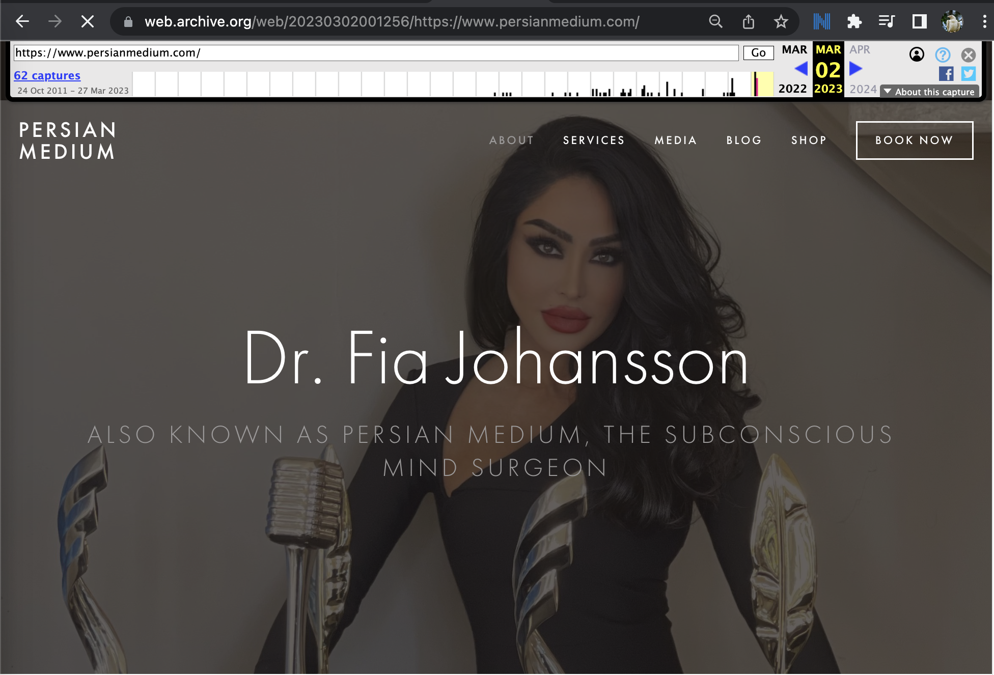 Mise à jour du 30 mars 2023. Après la publication de mon blog, Fia Johansson a considérablement modifié son site web, ou plutôt affiné. Tous les blogs ainsi que la page(s) média ont disparu. J’ai donc pris des captures d’écran de semaines auparavant et, le cas échéant, ajouté des liens vers Internet Archive.
