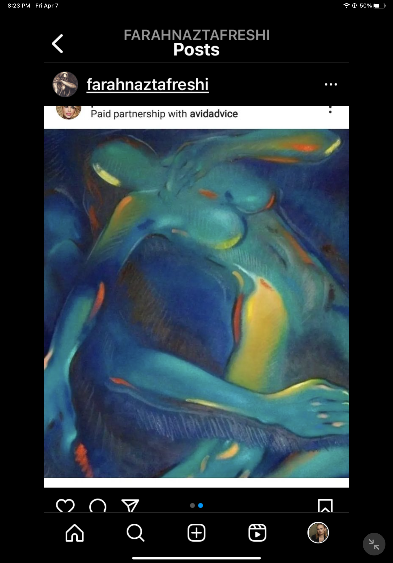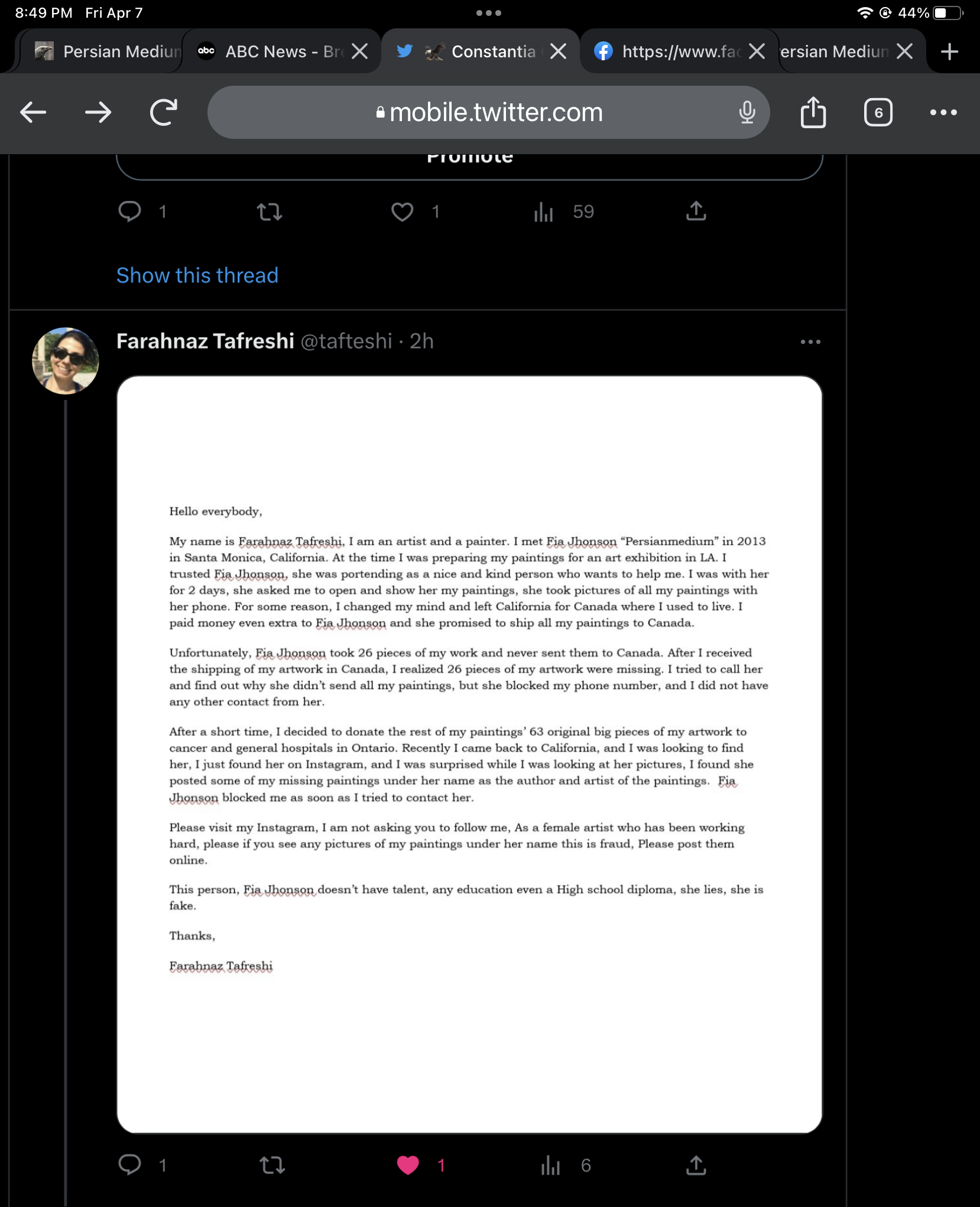 Mise à jour du 7 avril 2023. LE VOLEUR D’ART FIA JOHANSSON. Juste au moment où je pensais devoir laisser tranquille toute l’affaire Fia Johansson parce qu’un grand nombre de personnes enquête déjà, L’ARTISTE FARAHNAZ TAFRESHI s’est mise en contact avec moi à plusieurs reprises pour signaler que Johansson avait détourné tout un groupe de ses peintures en 2013 et qu’elle avait récemment découvert que Johansson les exhibait comme si elles étaient les siennes. Cela se produit sur son compte Instagram, son compte Facebook, ses stories Instagram/Facebook et peut-être dans sa propre maison. Notez bien : ces peintures sont très grandes et témoignent d’un talent énorme. Cette artiste a depuis longtemps fait ses preuves dans le monde de l’art. Notez également qu’il s’agit du vol de peintures physiques.