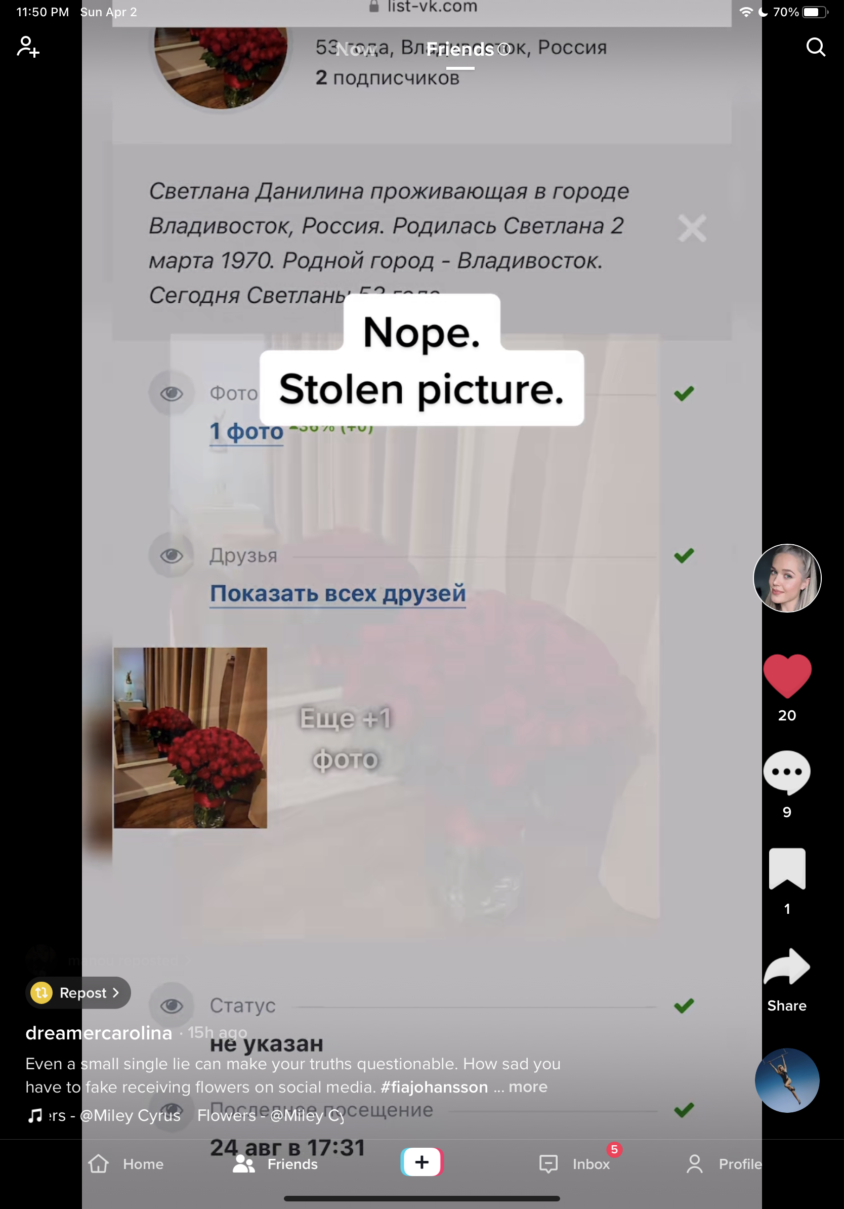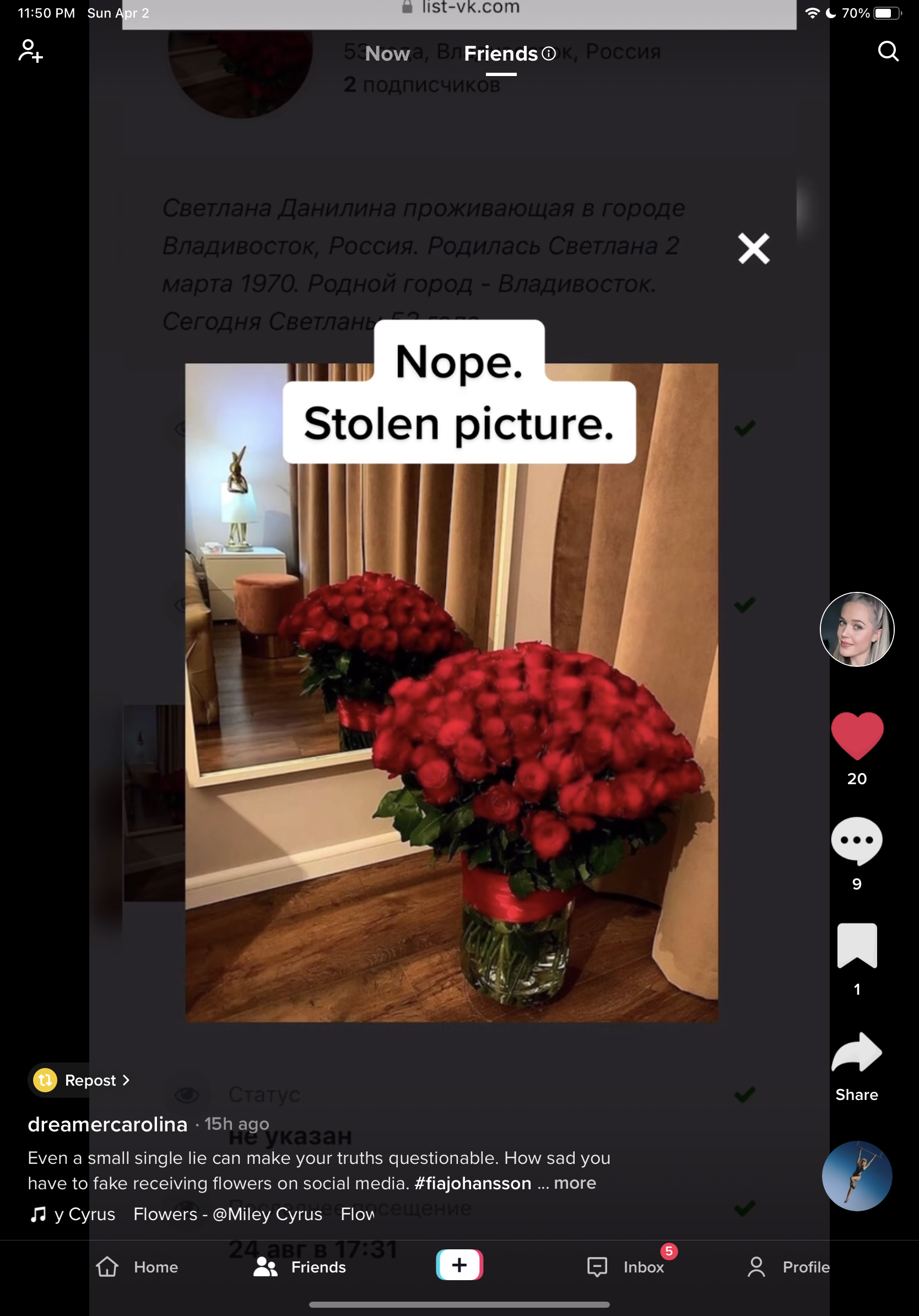 J’ai malgré moi découvert TikTok, où de nombreuses personnes s’intéressent à l’affaire Madeleine McCann et où de nombreux mensonges de Fia J ont été démontés. Les détectives de TikTok ont notamment découvert que le “certificat de docteur” que Fia J agitait dans ses stories sur les réseaux sociaux pour prouver qu’elle avait bien un doctorat (peut-être en réponse à ma preuve qu’elle n’avait pas ce titre), était identique à un certificat que l’on peut acheter en ligne. Fia J a également pris très au sérieux la nouvelle chanson de Miley Cyrus, lorsqu’elle s’est envoyée à elle-même une belle brassée de roses en utilisant une image volée.