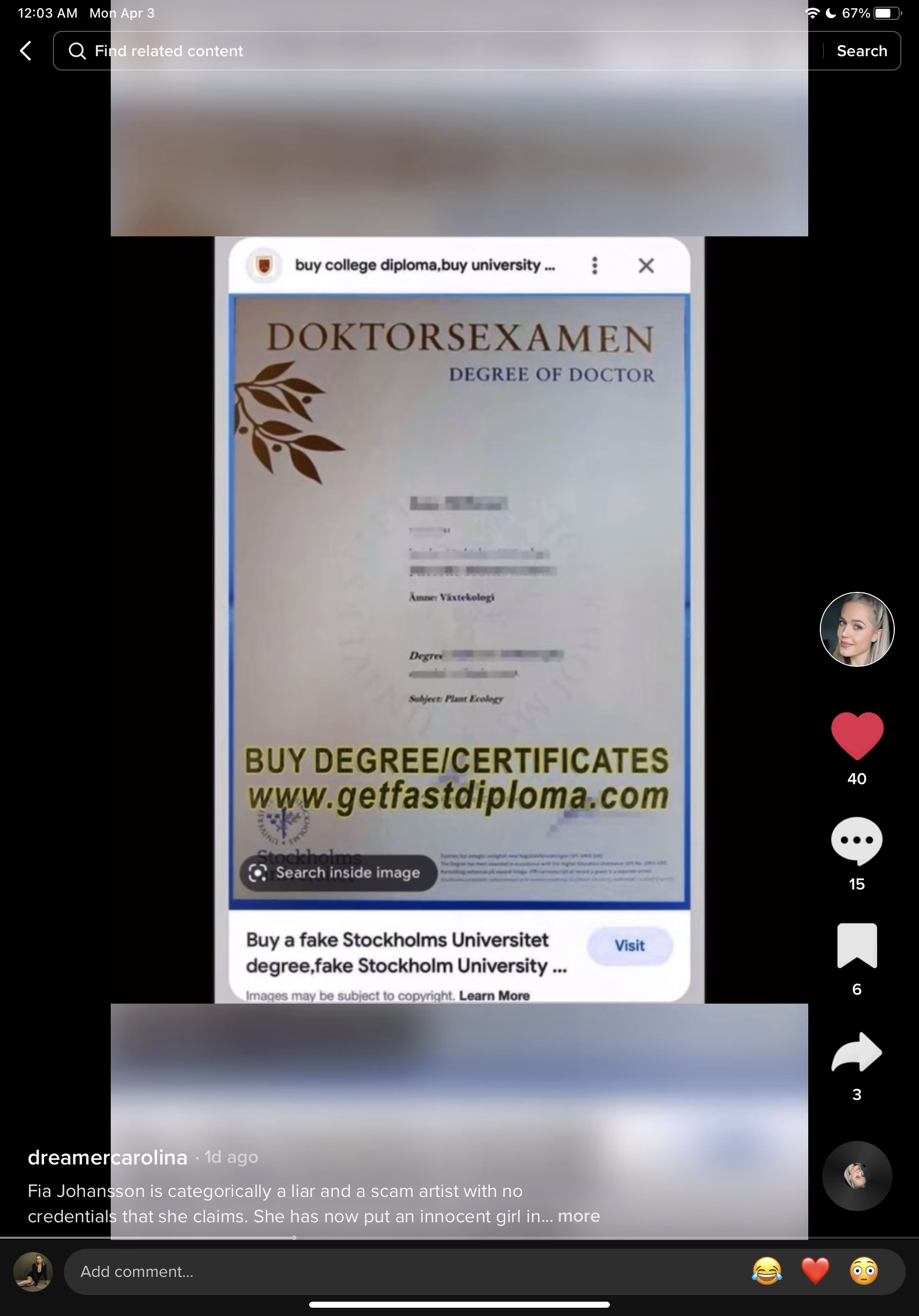 Sur TikTok, j’ai également rencontré une dame finno-suédoise qui a étudié à l’université de Stockholm et qui cherche à vérifier elle-même l’histoire du titre de docteur, sur place ou par téléphone. Dès que j’aurai des résultats de sa part, je mettrai à jour mon blog.