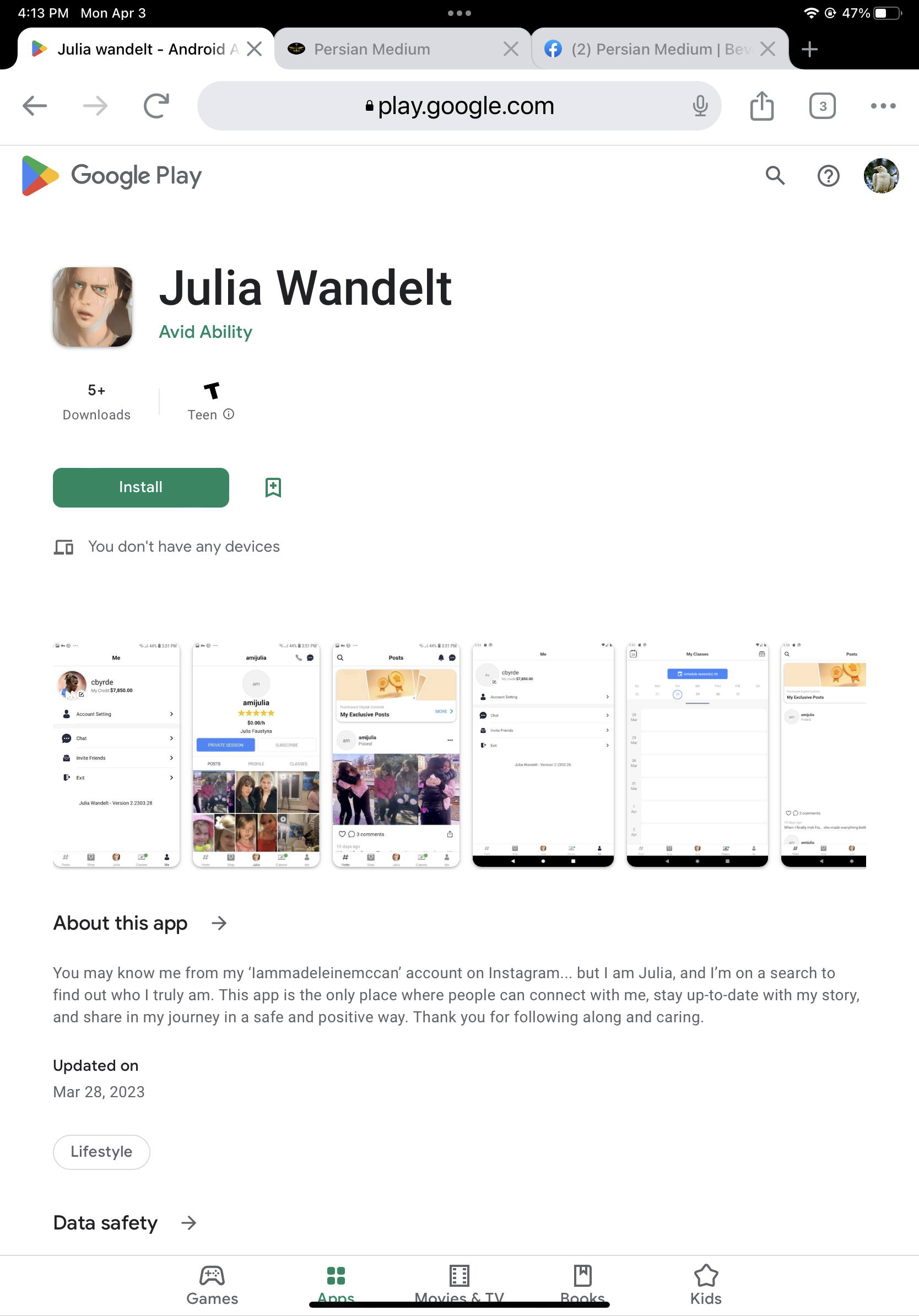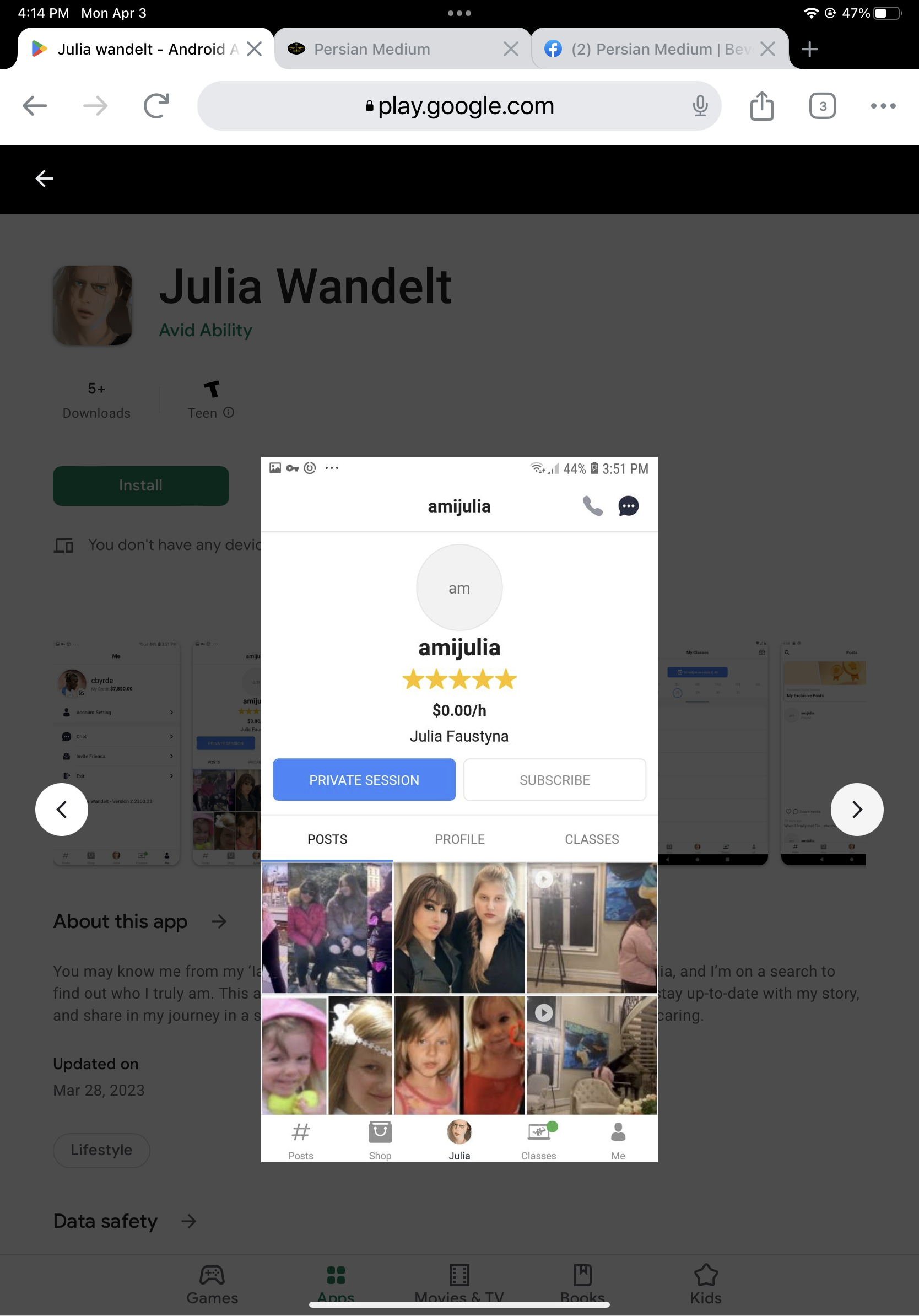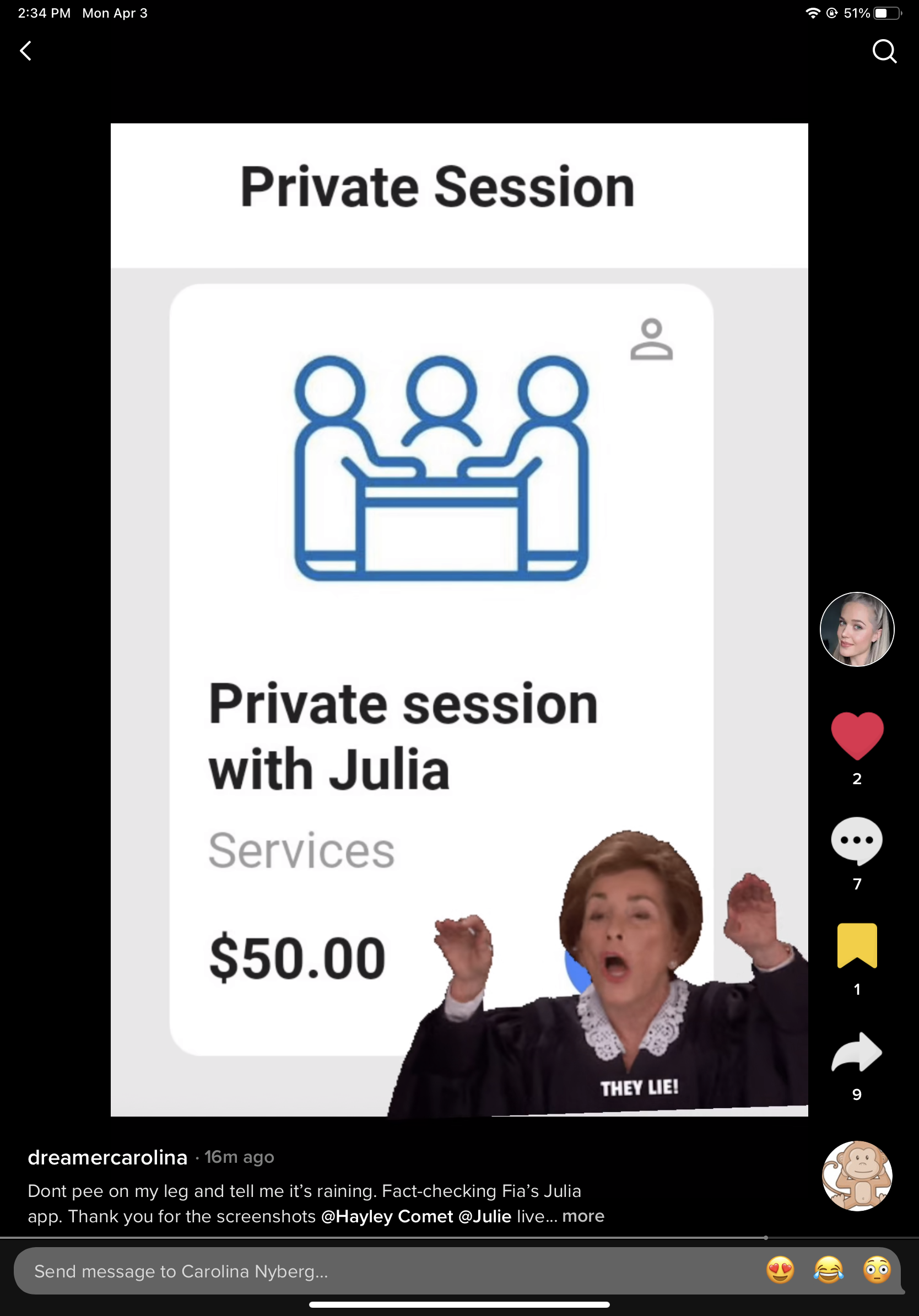 Mais Mme J continue imperturbablement à exploiter ses fantasmes. Elle a récemment lancé une application Apple sous son propre nom et entreprise, toujours avec toutes ses fausses qualifications, et deux applications sous le nom de Julia dans la boutique Google, avec des photos de Maddie McCann comme appât. Je ne veux pas tester ces trois applications, mais les captures d’écran d’autres enquêteurs semblent indiquer que Julia, qui est polonaise et n’a donc pas le droit de travailler aux États-Unis, semblait demander de l’argent via l’entreprise de Fia Johansson pour des conversations en tête-à-tête.
