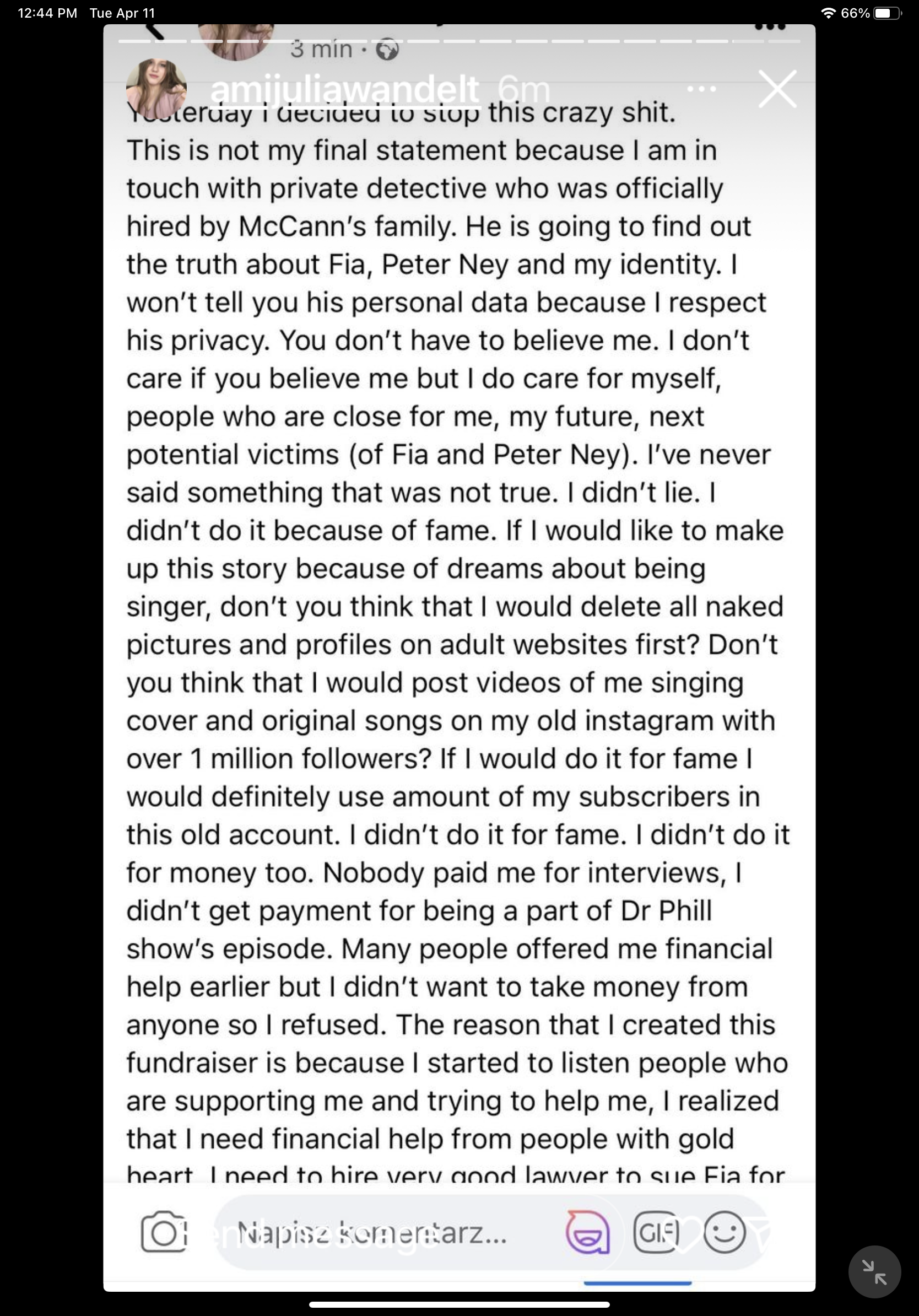 Mise à jour du 4 avril 2023. La décision est prise, Julia Wandelt avec tous ses autres alias nést qu’une seule et même personne : une Polonaise. Les tests ADN l’ont confirmé. Beaucoup de choses sordides se sont produites autour de Fia J, démontrant clairement que cette femme ne respecte pas la vérité, voire qu’elle n’y attache aucune importance, la vérité n’étant qu’une faible lueur vacillante, voire absente, dans son monde.