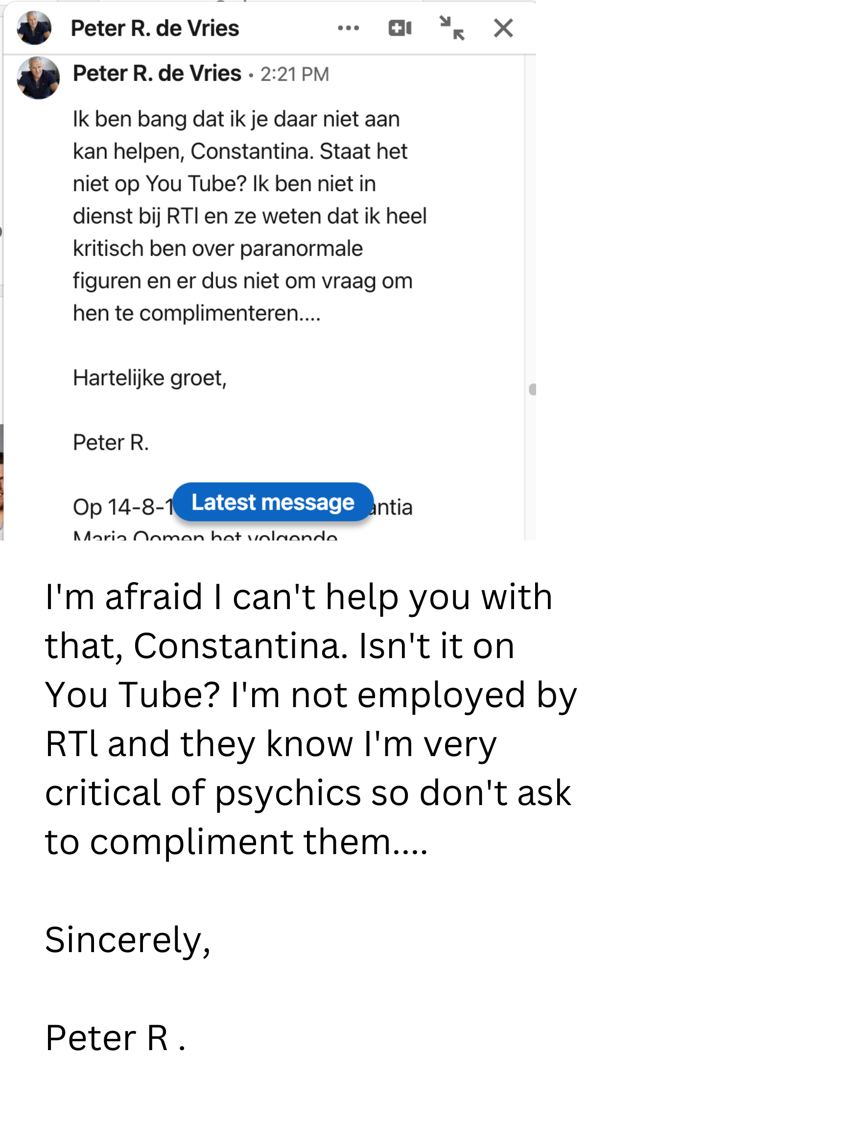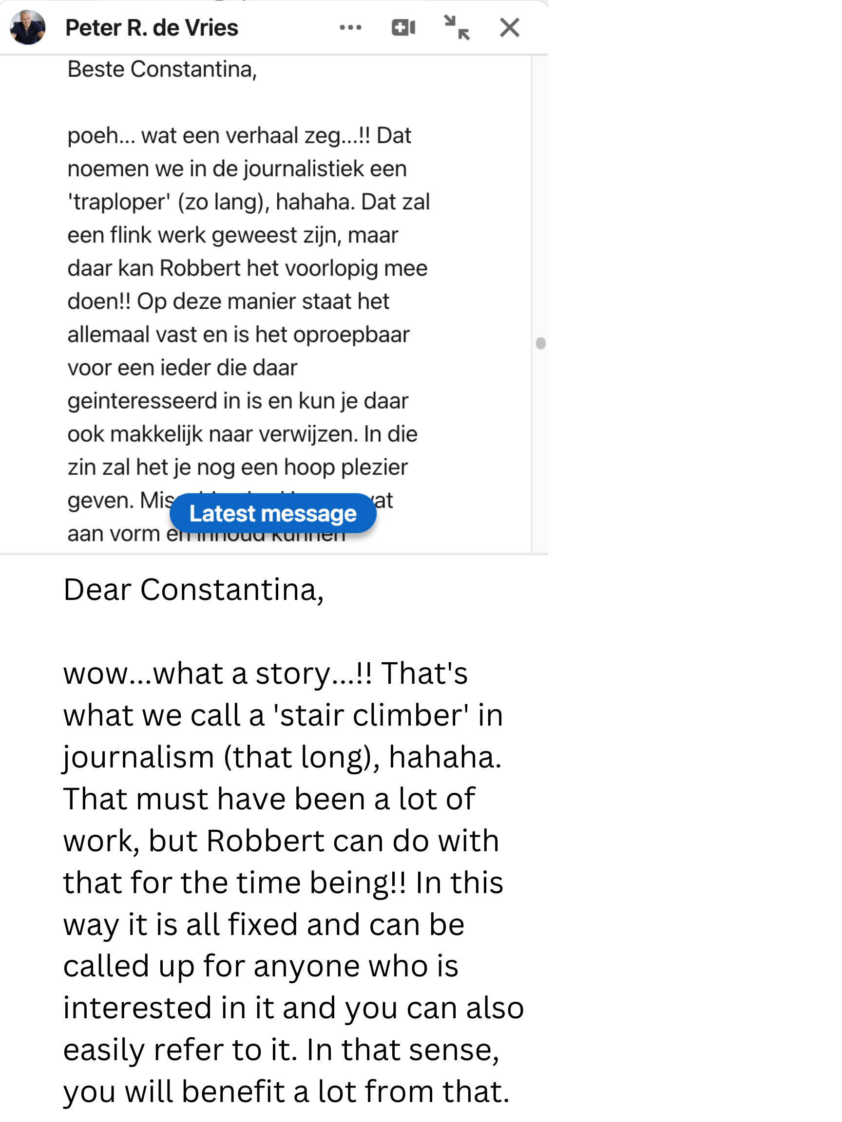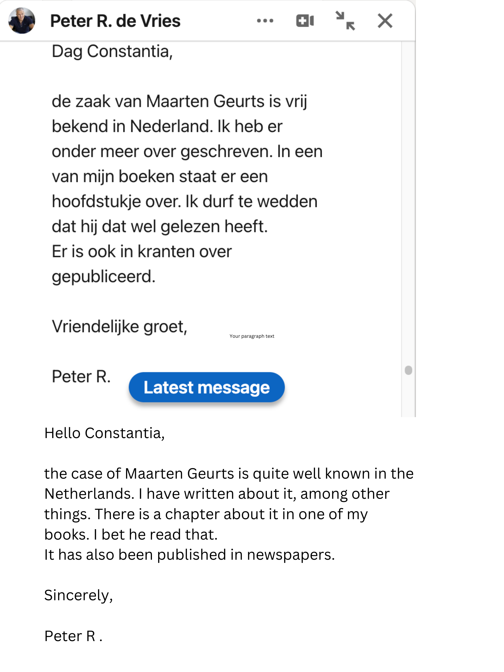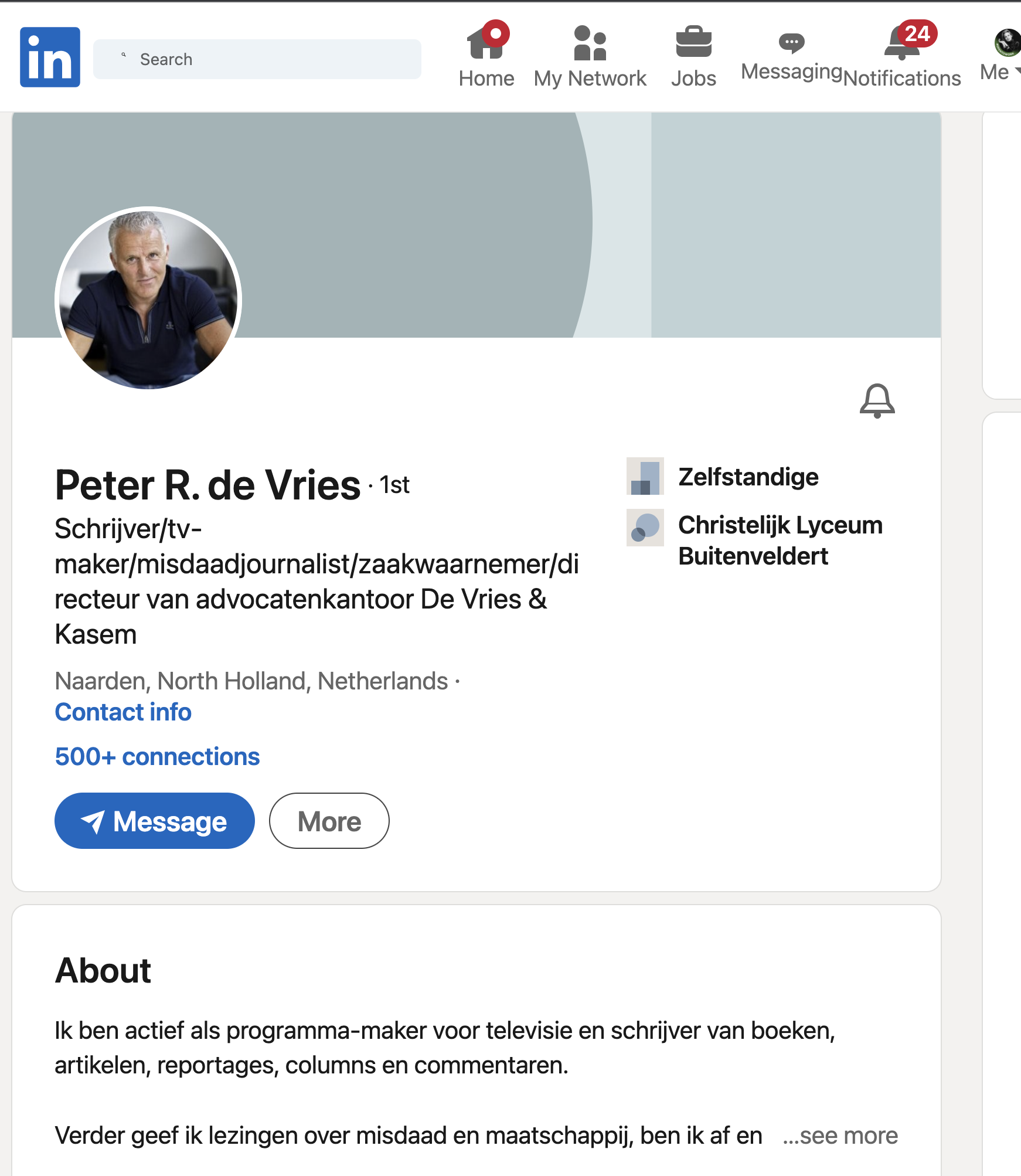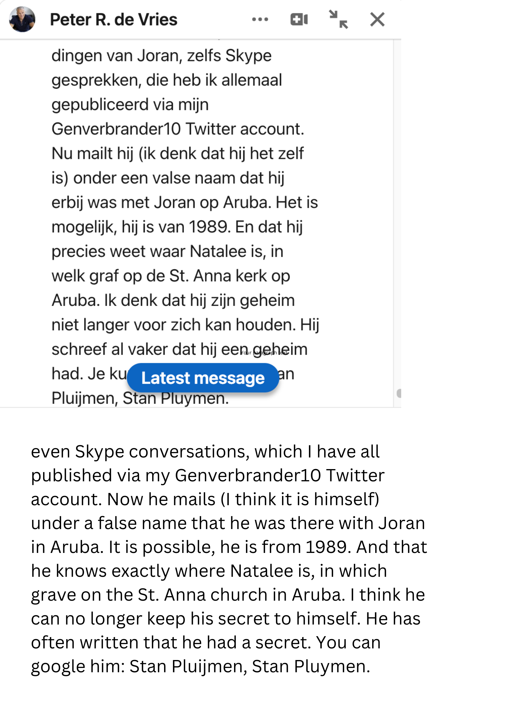 The commotion surrounding Robbert van den Broeke, Stan Pluijmen, Joran van der Sloot, and Natalee Holloway had been growing increasingly dominant since 2014. Therefore, around June 12, 2015, I sent a LinkedIn request to Peter R. de Vries, which he promptly accepted on June 13, 2015, albeit with some initial hesitation. De Vries was as he was with everyone: very courteous, refined, and friendly. I informed him about Robbert’s and Stan’s predicaments, but it became clear to me quite soon that he was very busy. I cut out my parts in between, but I wrote to him about the content of my blogs regarding Van den Broeke and Pluijmen here on Parameter. I also shared the St. Anna tip with Peter R. de Vries, but unfortunately, he never responded to me again. At the time, Stan’s ‘friend’ Micha Romijn did try to mislead me, suggesting that Stan had been on Aruba with Joran. As I explained in the Stan Pluijmen blog earlier, this was actually an attempt at blackmail by Romijn towards Stan. Romijn was attempting to get money from the modern-day Robin Hood, Stan, who had decided not to give him any more money.