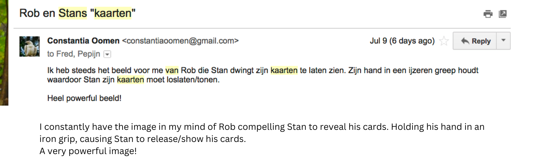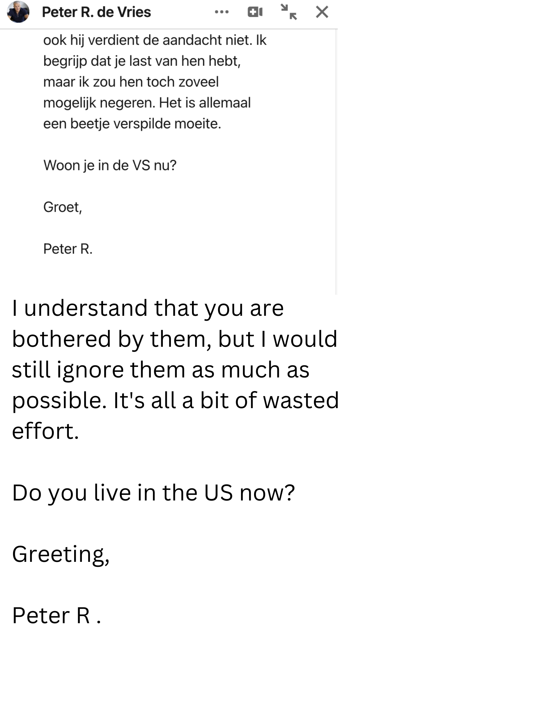 I had chat contact with both Stan and Lana, but especially with Stan. Without going into detail, since both Stan, Lana, and I prefer not to look back on this, it led, clearly attributable to the tensions that were fully present on both sides, to a new escalation between Stan, Lana, and me in May 2023. I was so angry, particularly with Stan and to a lesser extent with Lana, that I deleted my entire WhatsApp account, with a message to Stan saying, “I never want anything to do with you again.”