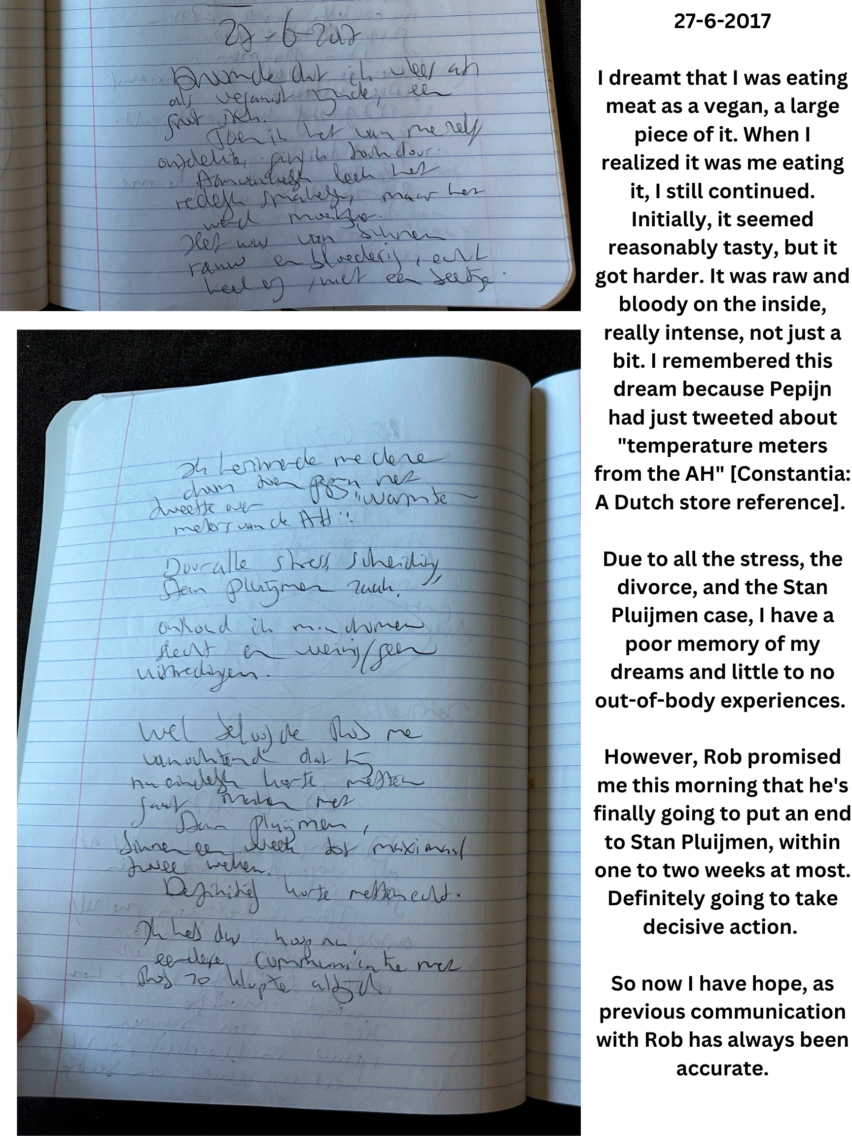 On June 27, 2017, I wrote in my diary that through telepathic communication with Rob, I had learned that he was finally going to “deal with Stan Pluijmen decisively, sometime between now and a week, but no later than two weeks from now.” This set the deadline to July 4, 2017, or at the latest, July 11, 2017. Keep in mind that in 2017, Stan was still assisting Robbert van den Broeke in his deceptions (and thus in lying and deceiving gullible fans), and he hadn’t distanced himself from Van den Broeke’s hate actions, for which Van den Broeke even came into the attention of the police. The Joran van der Sloot-Stan Pluijmen Skype conversation was intentionally sent to me by Stan Pluijmen on July 7, 2017 (within Rob’s mentioned timeframe), and according to Stan, the photo of Joran’s financial sheet was accidentally dropped into my Skype chat on June 29, 2017 (likewise). Was Rob Nanninga behind this? That’s what I always suspected, that Rob was pulling Stan’s strings or whispering things in his ears. Indeed, at a certain point, Stan was genuinely helping me, even in another area.