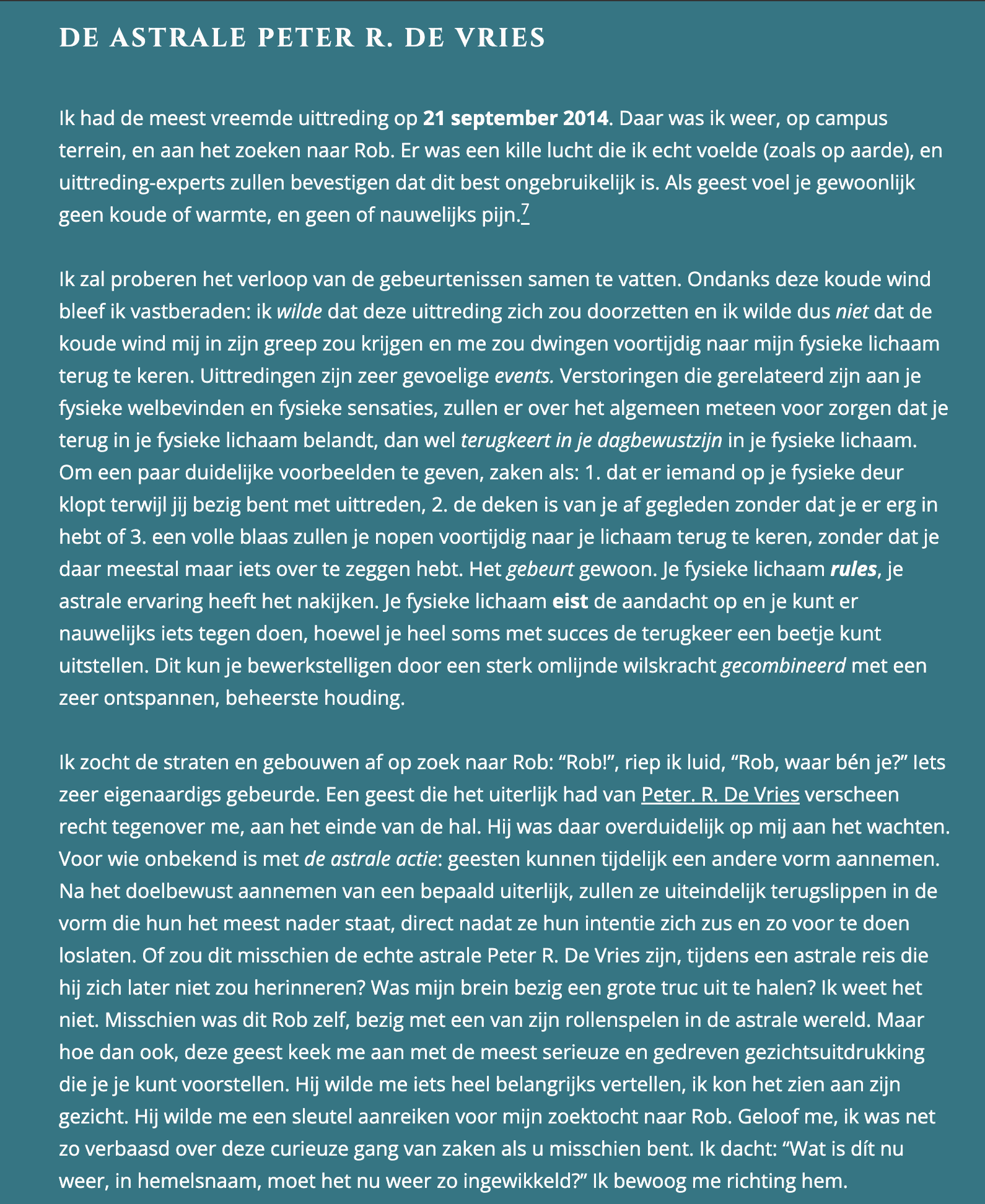 It was the skeptical leader (until 2014), Rob Nanninga, who introduced me to this term, and those familiar with this website know that even the name of this site, “Parameter,” is a reference to Rob Nanninga. He used this name on the FOK forum in a thread about Robbert van den Broeke. He even wanted to name the Skepsis magazine “Parameter” (but that proposal was rejected). About four months after Rob’s shocking and sudden passing, I had one of the most remarkable out-of-body experiences of my entire life (and I’ve had thousands, so that says something):