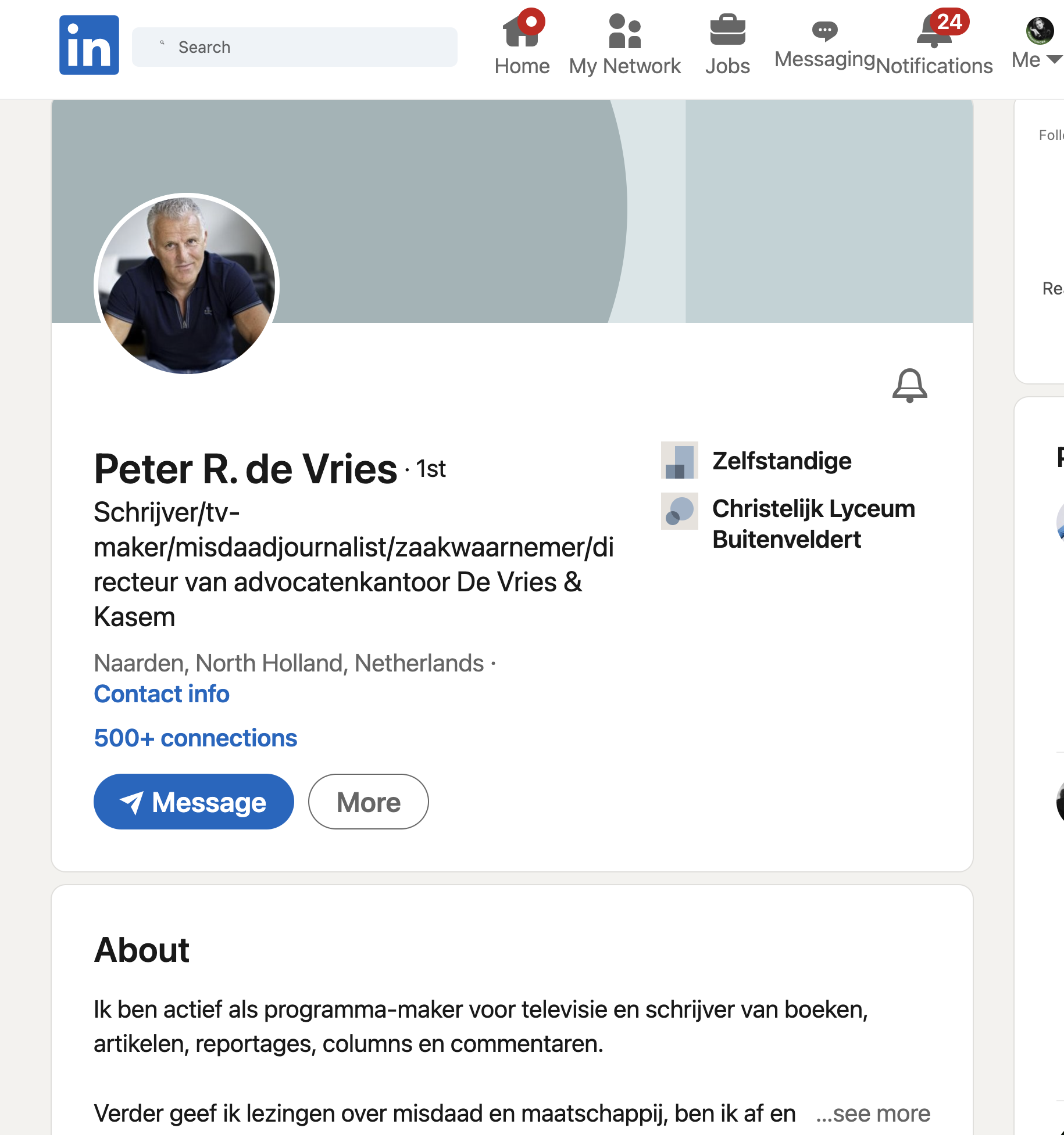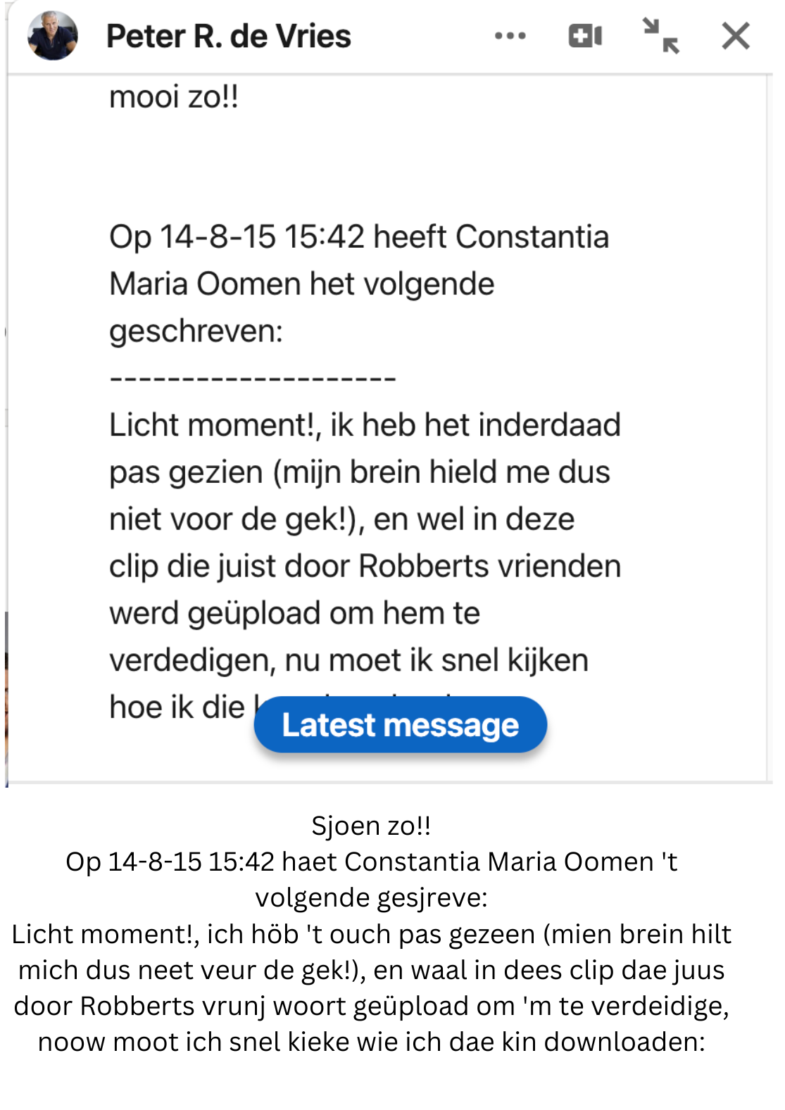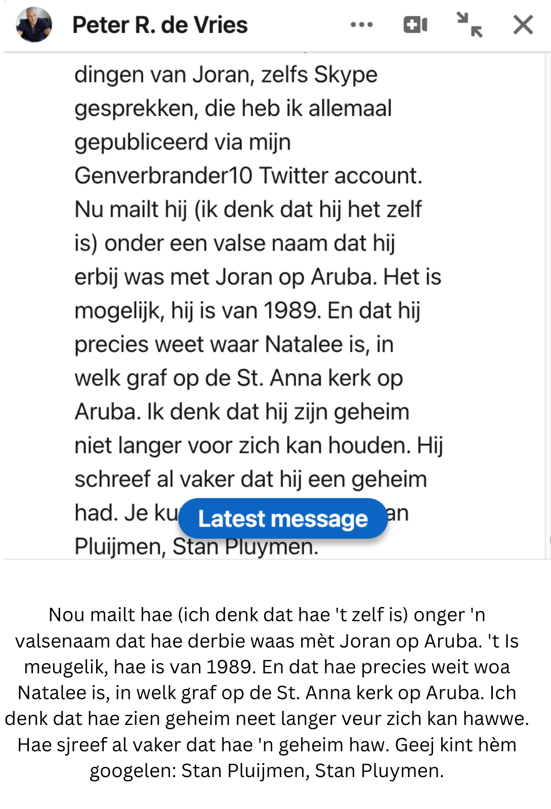 La conmoción en torno a Robbert van den Broeke, Stan Pluijmen, Joran van der Sloot y Natalee Holloway había estado creciendo cada vez más desde 2014. Por lo tanto, alrededor del 12 de junio de 2015, envié una solicitud de conexión en LinkedIn a Peter R. de Vries, la cual él aceptó rápidamente el 13 de junio de 2015, aunque con cierta vacilación inicial. De Vries fue como era con todos: muy cortés, refinado y amable. Le informé sobre las dificultades de Robbert y Stan, pero pronto me quedó claro que estaba muy ocupado. Corté mis partes intermedias, pero le escribí sobre el contenido de mis blogs sobre Van den Broeke y Pluijmen aquí en Parameter. También compartí la pista de St. Anna con Peter R. de Vries, pero desafortunadamente, nunca volvió a responderme. En ese momento, el ‘amigo’ de Stan, Micha Romijn, intentó engañarme, sugiriendo que Stan había estado en Aruba con Joran. Como expliqué en el blog sobre Stan Pluijmen anteriormente, esto fue en realidad un intento de chantaje por parte de Romijn hacia Stan. Romijn intentaba obtener dinero del Robin Hood moderno, Stan, quien había decidido no darle más dinero.
