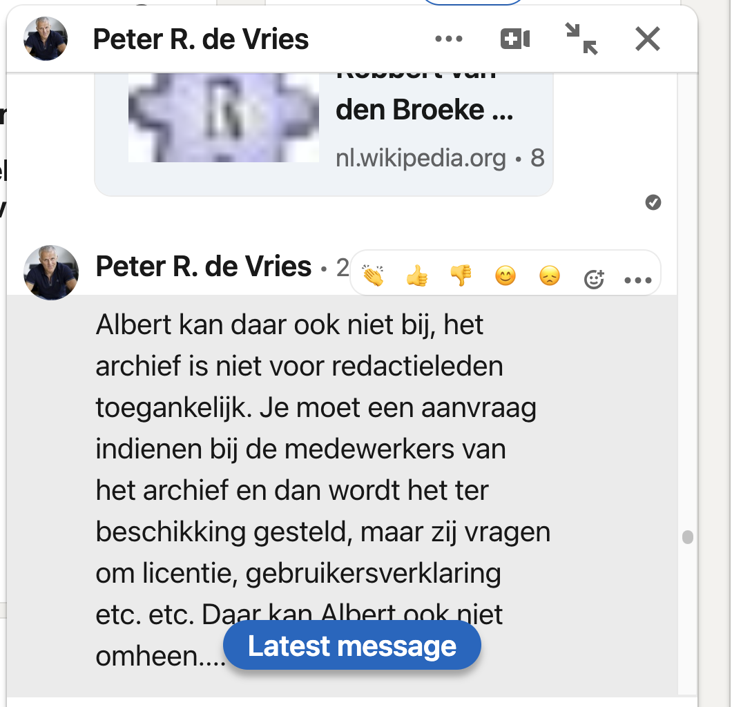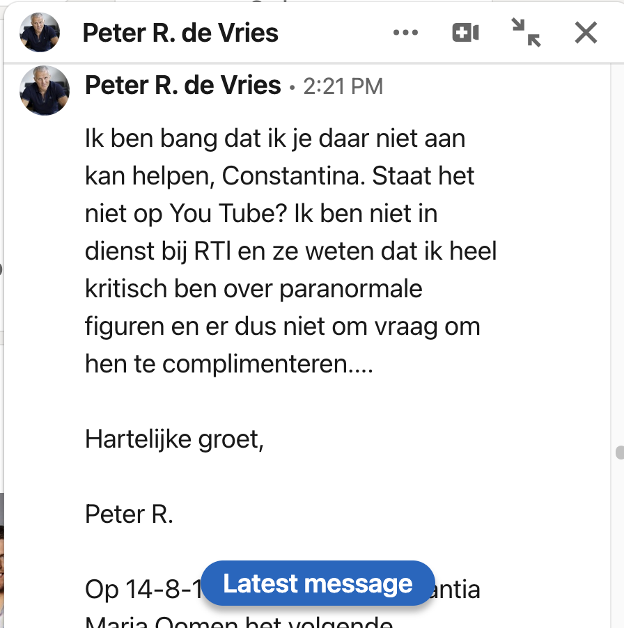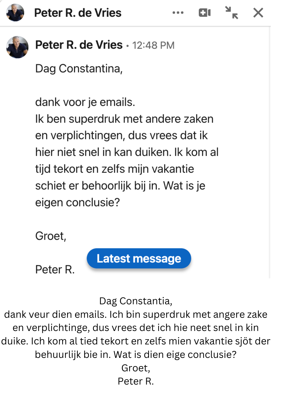 La conmoción en torno a Robbert van den Broeke, Stan Pluijmen, Joran van der Sloot y Natalee Holloway había estado creciendo cada vez más desde 2014. Por lo tanto, alrededor del 12 de junio de 2015, envié una solicitud de conexión en LinkedIn a Peter R. de Vries, la cual él aceptó rápidamente el 13 de junio de 2015, aunque con cierta vacilación inicial. De Vries fue como era con todos: muy cortés, refinado y amable. Le informé sobre las dificultades de Robbert y Stan, pero pronto me quedó claro que estaba muy ocupado. Corté mis partes intermedias, pero le escribí sobre el contenido de mis blogs sobre Van den Broeke y Pluijmen aquí en Parameter. También compartí la pista de St. Anna con Peter R. de Vries, pero desafortunadamente, nunca volvió a responderme. En ese momento, el ‘amigo’ de Stan, Micha Romijn, intentó engañarme, sugiriendo que Stan había estado en Aruba con Joran. Como expliqué en el blog sobre Stan Pluijmen anteriormente, esto fue en realidad un intento de chantaje por parte de Romijn hacia Stan. Romijn intentaba obtener dinero del Robin Hood moderno, Stan, quien había decidido no darle más dinero.