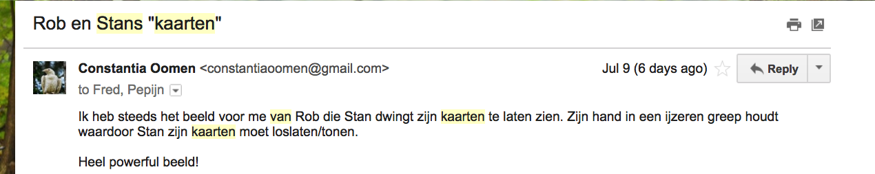 El 27 de junio de 2017, escribí en mi diario que a través de la comunicación telepática con Rob, había aprendido que finalmente iba a “lidiar con Stan Pluijmen de manera decisiva, en algún momento entre ahora y una semana, pero a más tardar en dos semanas a partir de ahora.” Esto estableció el plazo hasta el 4 de julio de 2017, o a más tardar, el 11 de julio de 2017. Ten en cuenta que en 2017, Stan todavía estaba ayudando a Robbert van den Broeke en sus engaños (y así en mentir y engañar a fans crédulos), y no se había distanciado de las acciones de odio de Van den Broeke, por las cuales Van den Broeke incluso llamó la atención de la policía. La conversación por Skype entre Joran van der Sloot y Stan Pluijmen fue enviada a propósito por Stan Pluijmen el 7 de julio de 2017 (dentro del marco de tiempo mencionado por Rob), y según Stan, la foto de la hoja financiera de Joran fue enviada por error a mi chat de Skype el 29 de junio de 2017 (de manera similar). ¿Estaba detrás de esto Rob Nanninga? Eso es lo que siempre sospeché, que Rob estaba manipulando a Stan o susurrándole cosas al oído. De hecho, en cierto momento, Stan realmente me estaba ayudando, incluso en otra área.