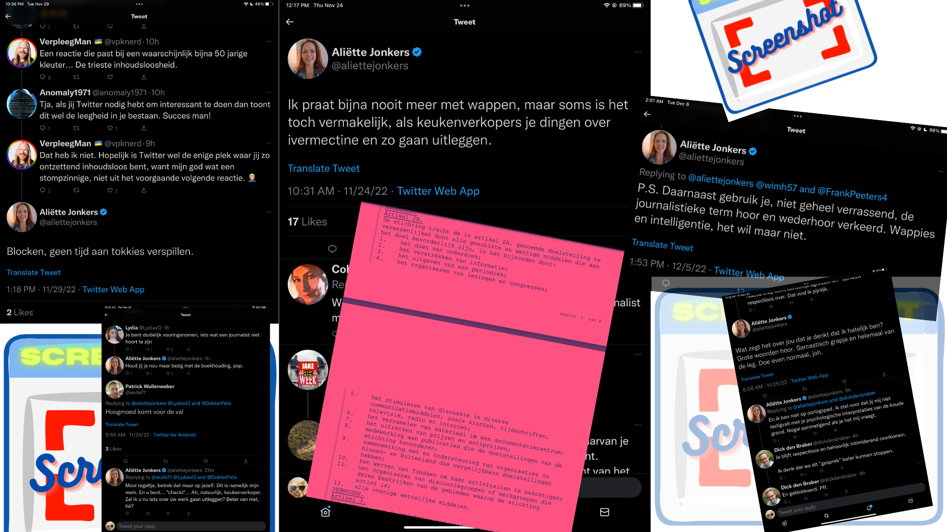 “Has it not yet dawned on you that I do not respond ‘substantially’ to ignorant, emotional gibberish? Did you really think you had something to contribute ‘substantive’? That your opinion counts even one fuck?”“Malicious Deception”“But yes, Eelco de Rook has such an open mind that his brain has fallen out and that he runs after every charlatan who says something that pleases him.”“I’ve got more intelligence in my pinkie than you in your whole body, idiot.”Jonkers scolding with “muts”, a rude Dutch word for “bourgeois, stupid woman; boring woman”🔵 2022 – Aliette Jonkers very clearly misunderstands a satirical tweet, then tries to shift all fault to the blamed party being such an ultra prick.🔵 2022 – Aliette Jonkers was doxing somebody, then gets very aggressive when people address her and criticize her doxing.🔵 2022 – Added December 6, 2022 – Aliette Jonkers comparing adversary with Ted Bundy, saying: “Oh how nice, another Putin whore”, “Little, little man, you are despicable.”, asking someone: “Dictators give you a boner?”, curses: “Filthy liars!”.